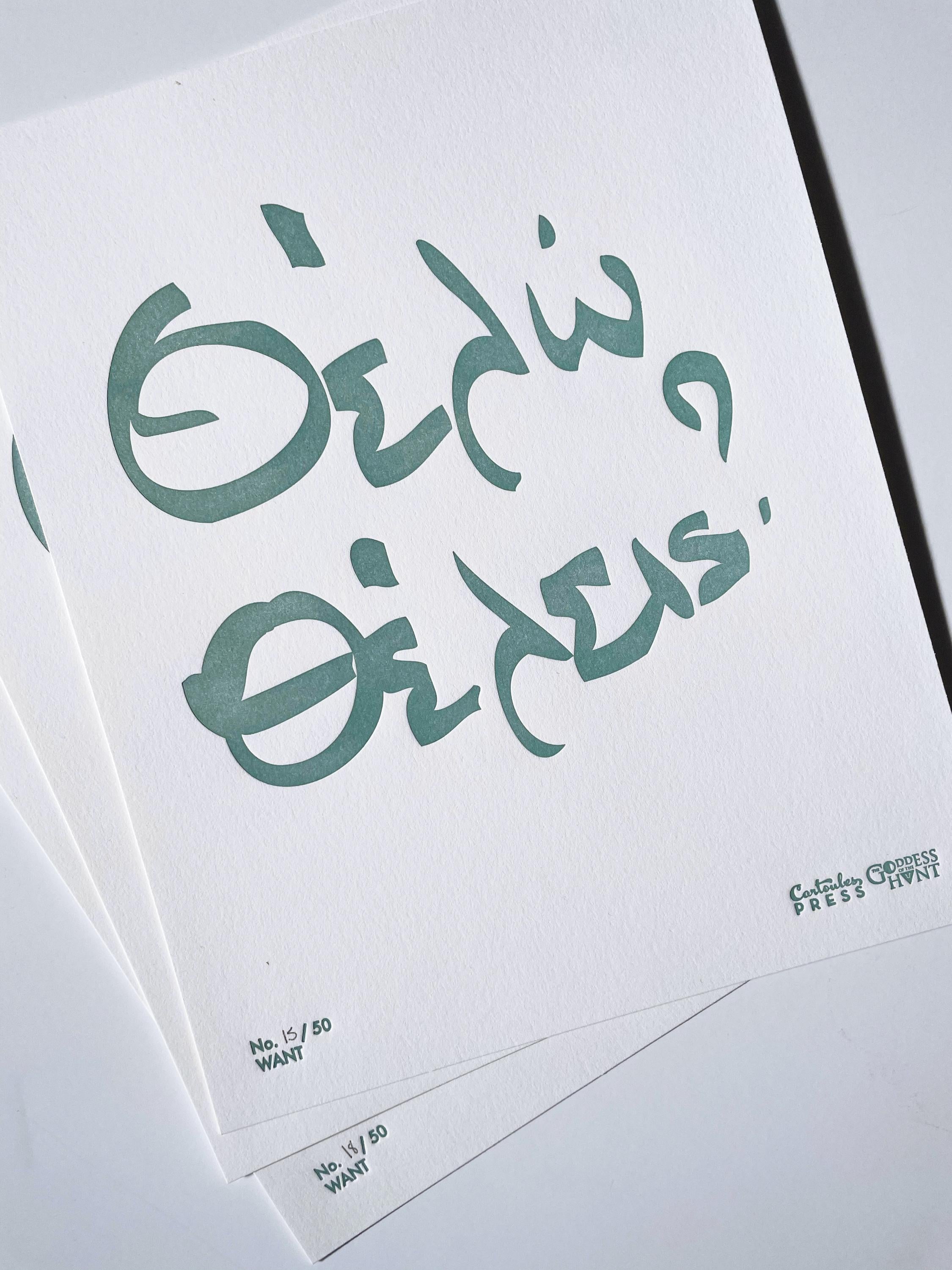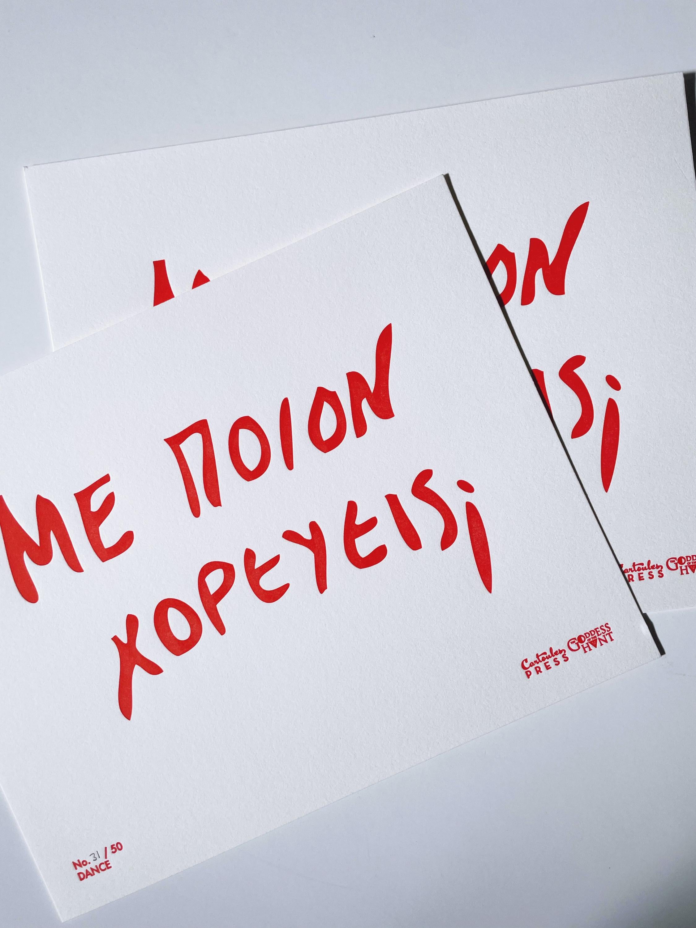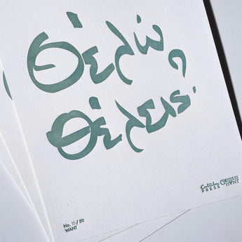 These letterpress prints depict real Athenian graffiti, and were part of a collaborative series between Cartoules Press and The Goddess of the Hunt.