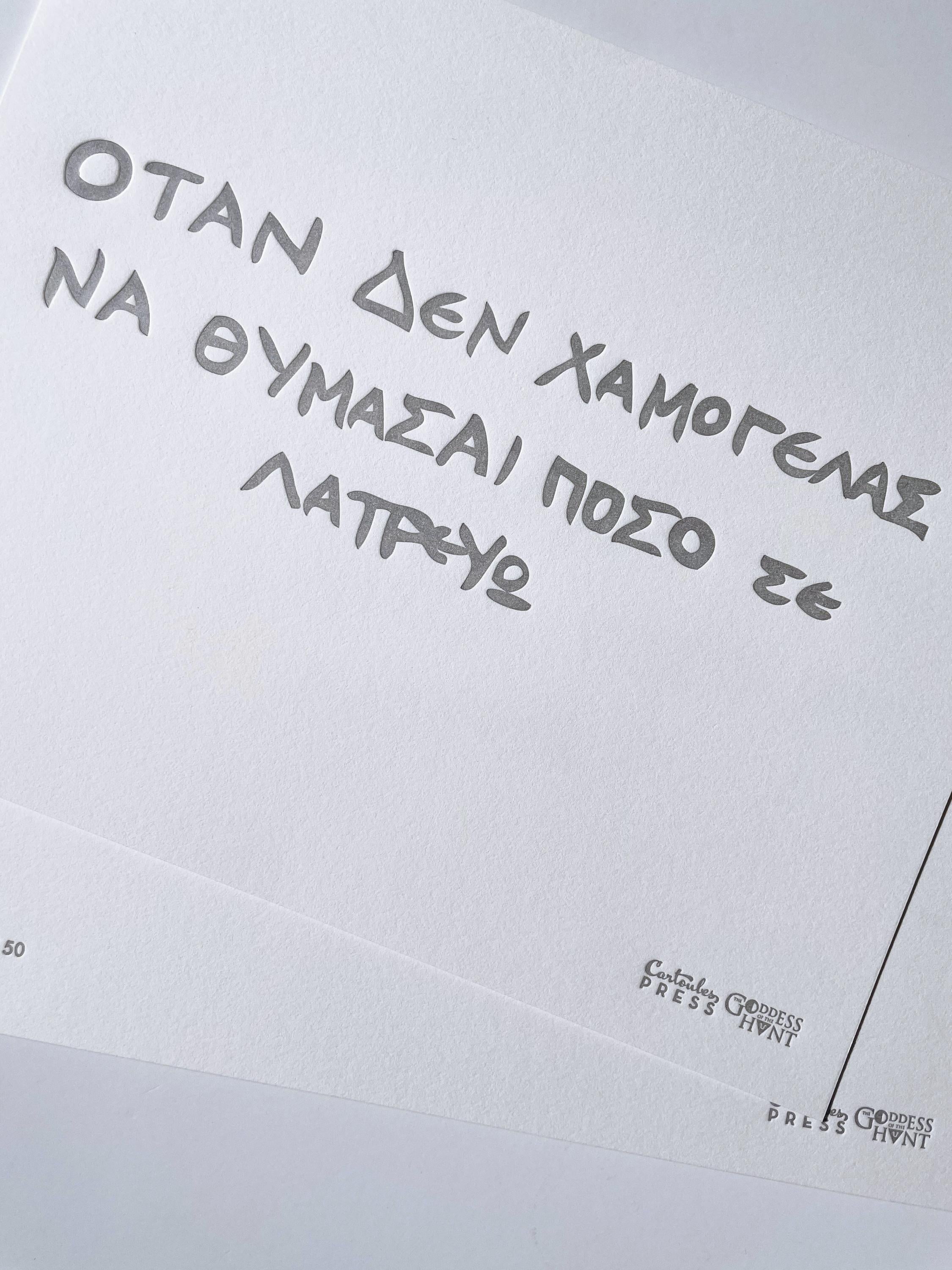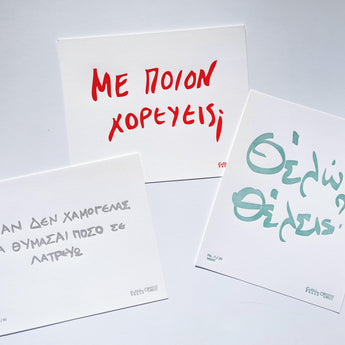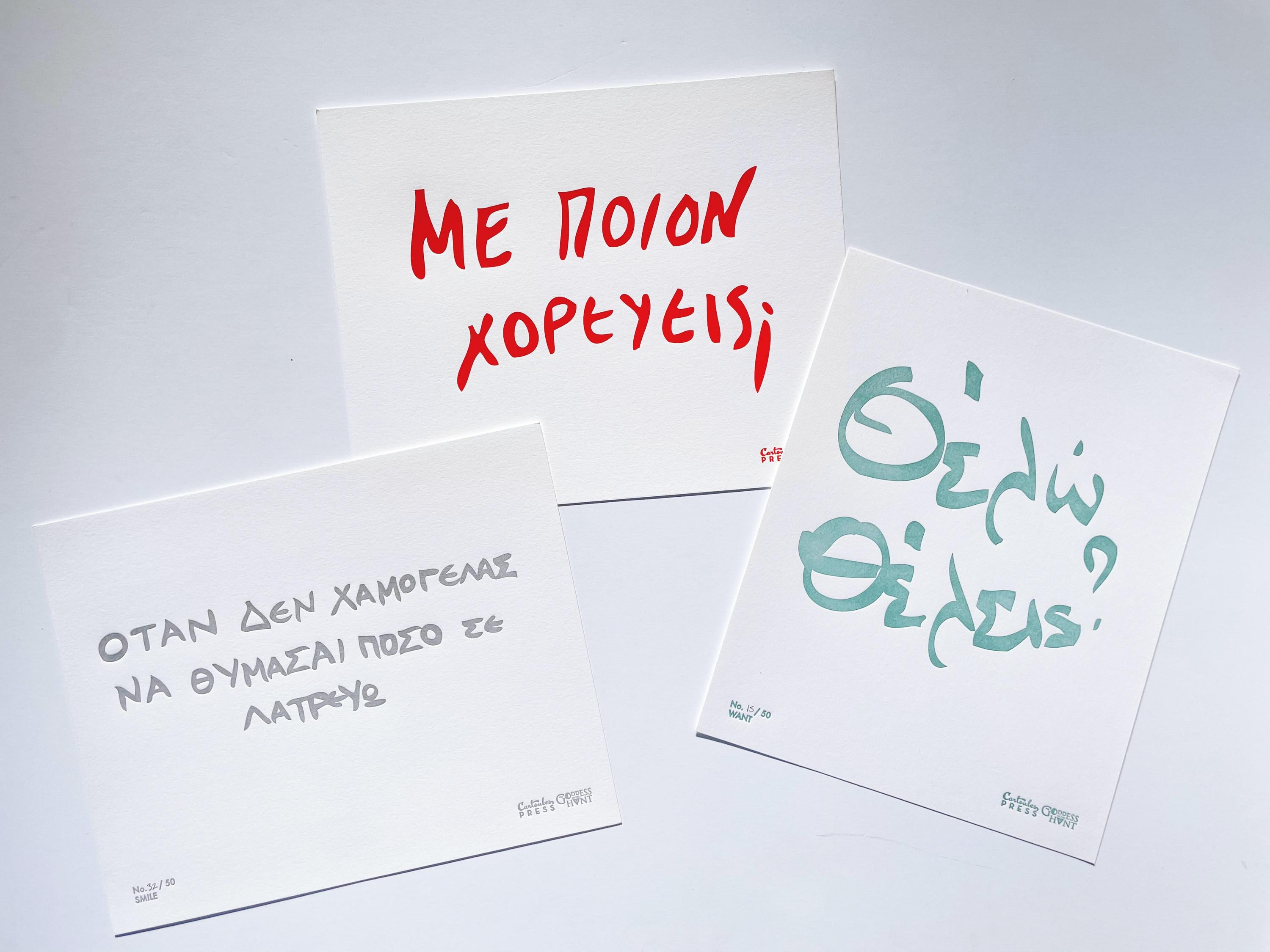 Athens has always been a hotbed for graffiti artists to publicly express their frustrations in society, but also their love and thoughts on humanity too. We created this limited edition letterpress series to give them a life of their own: one that preserves their poetry and symbolism.