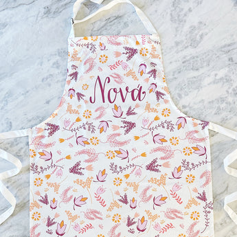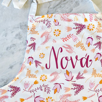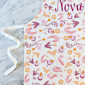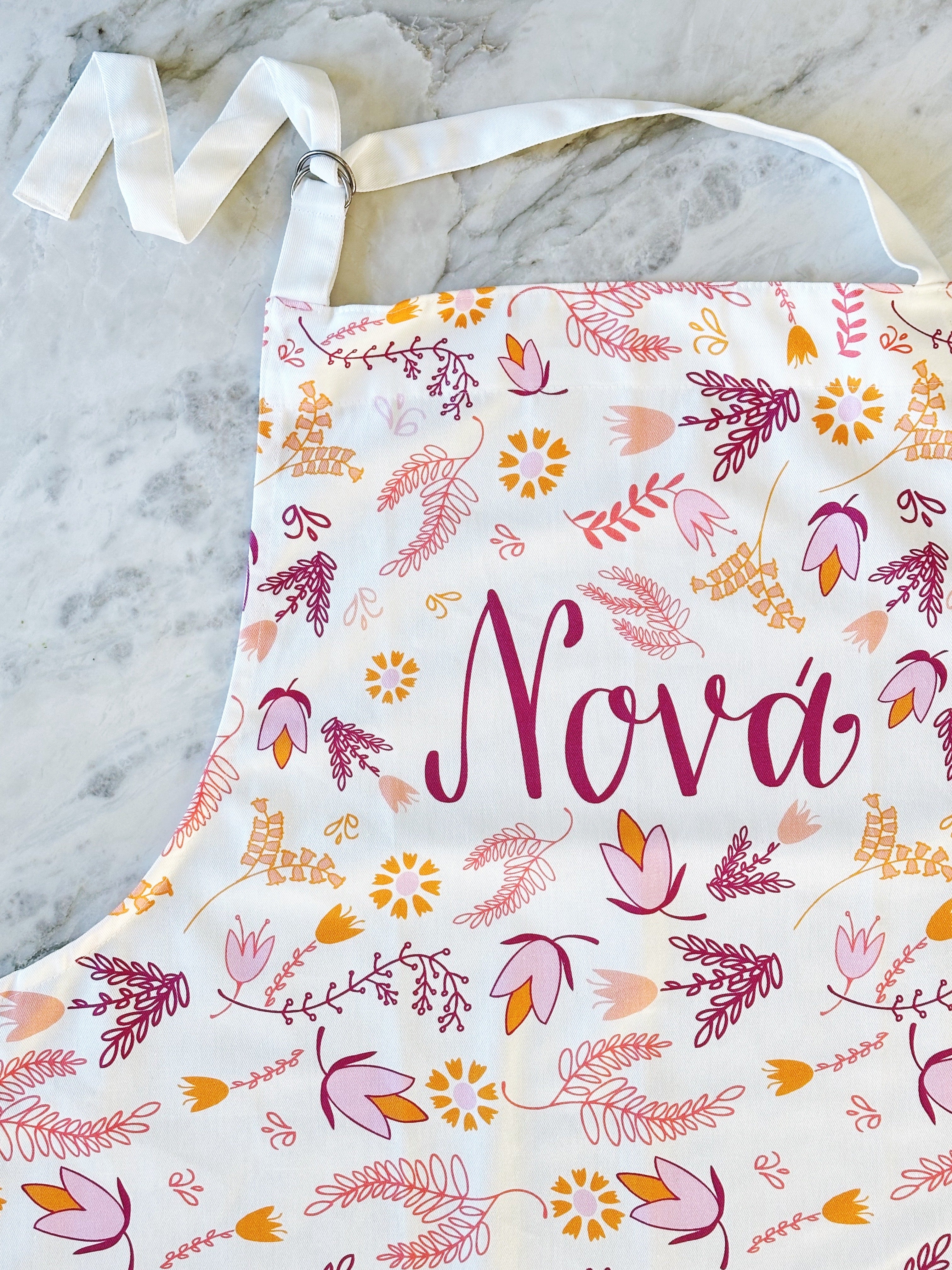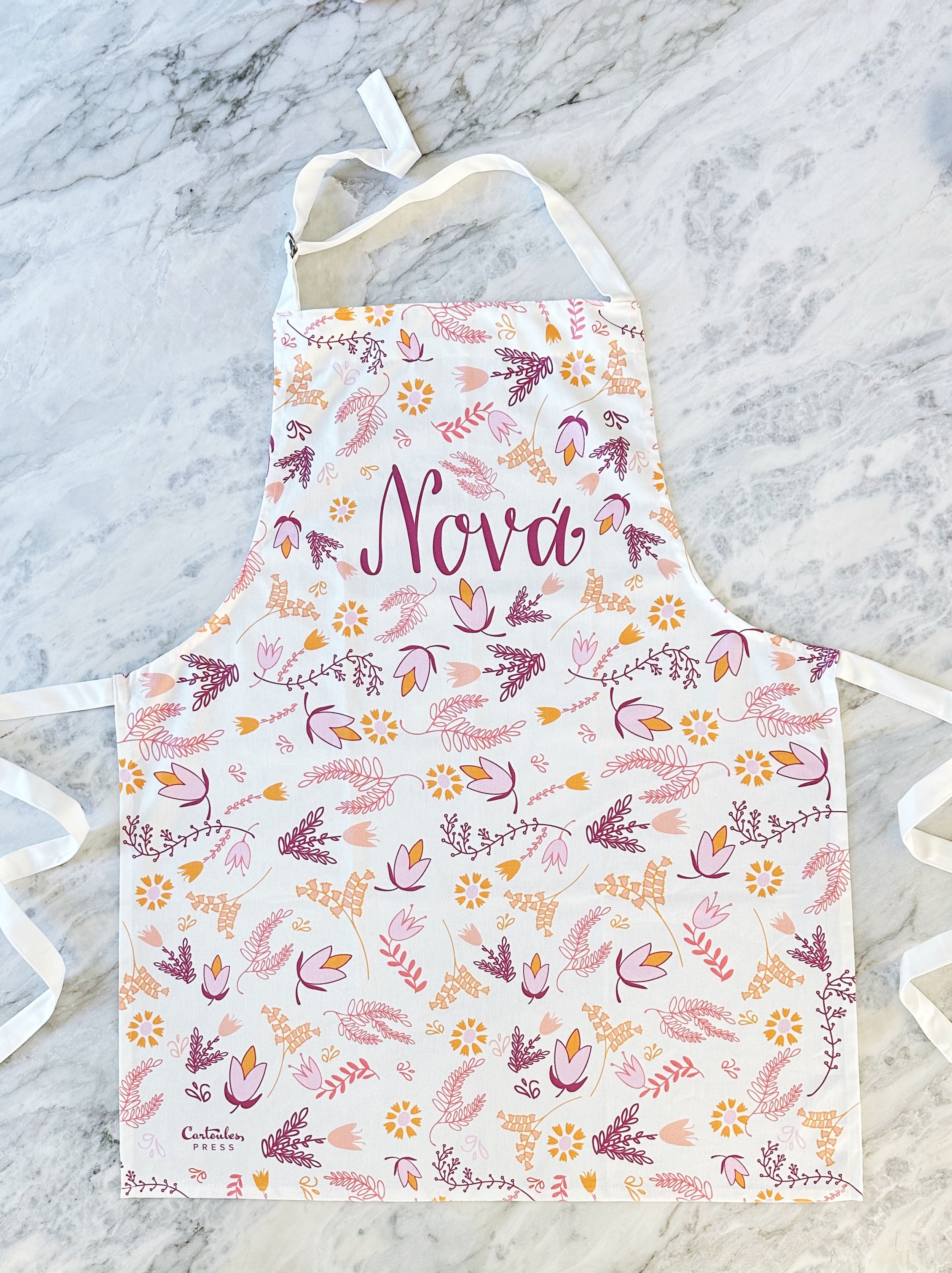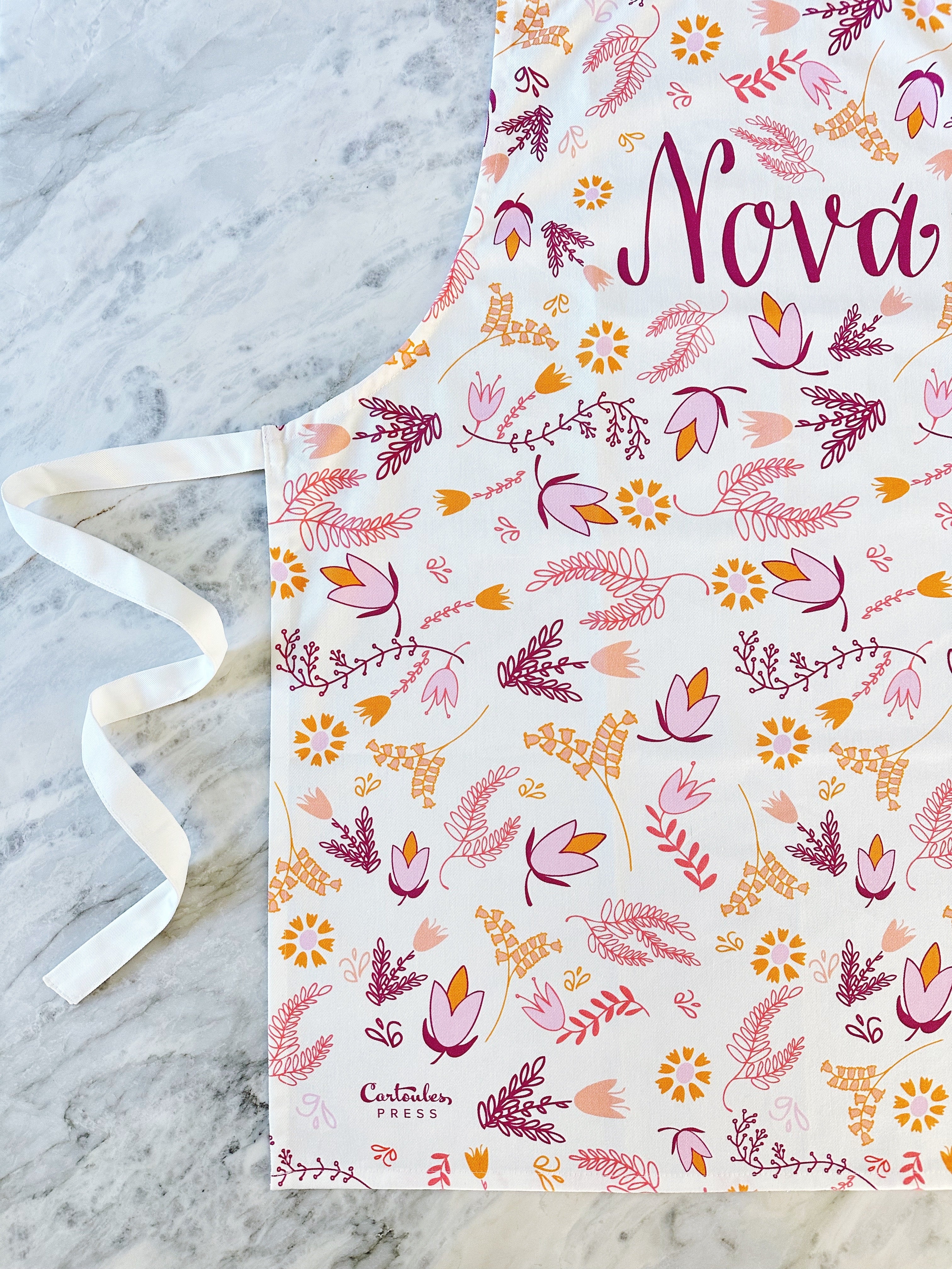 Our Nona apron design is printed on 100% cotton premium twill fabric and features illustrations by Cartoules Press.
