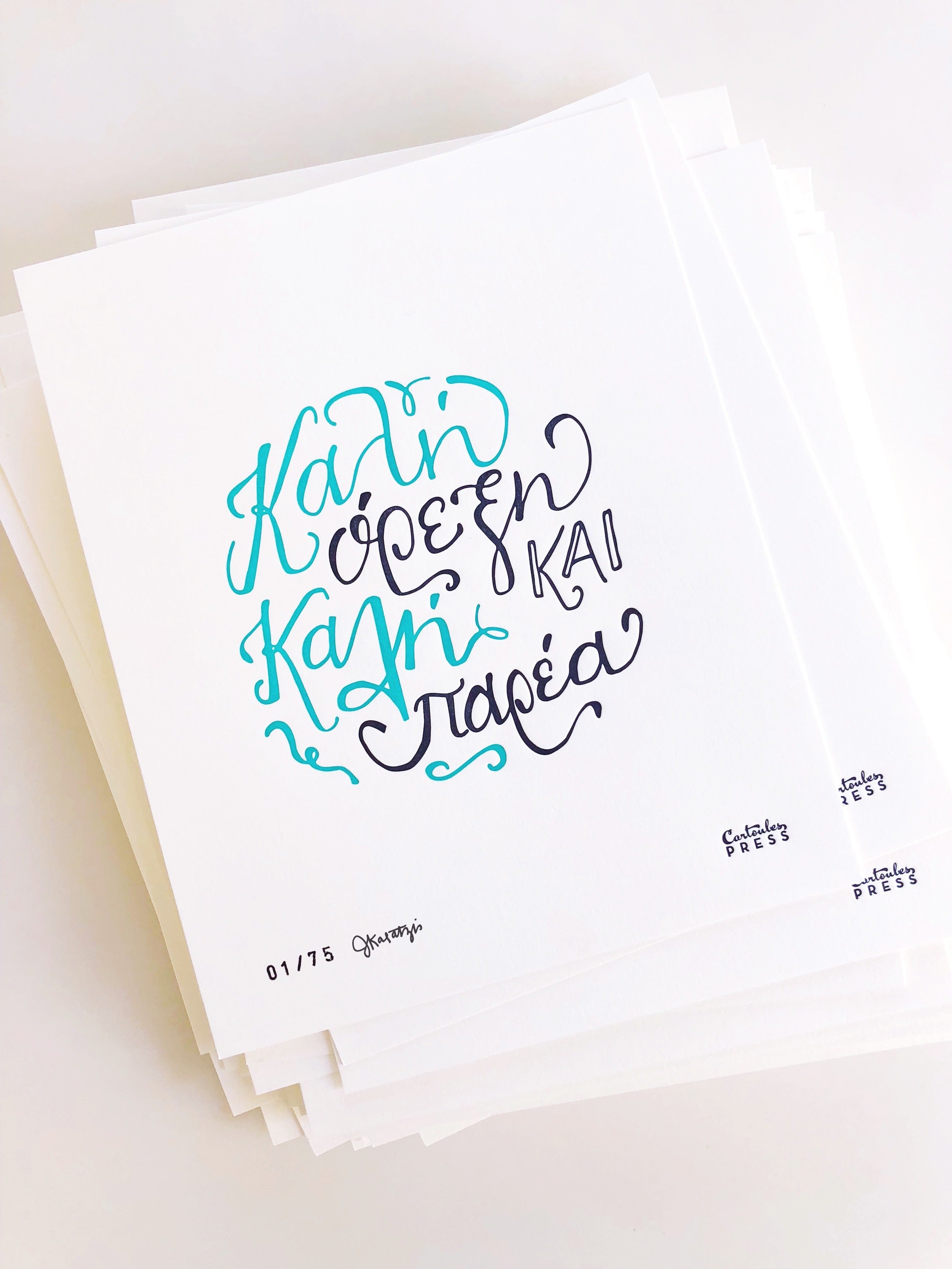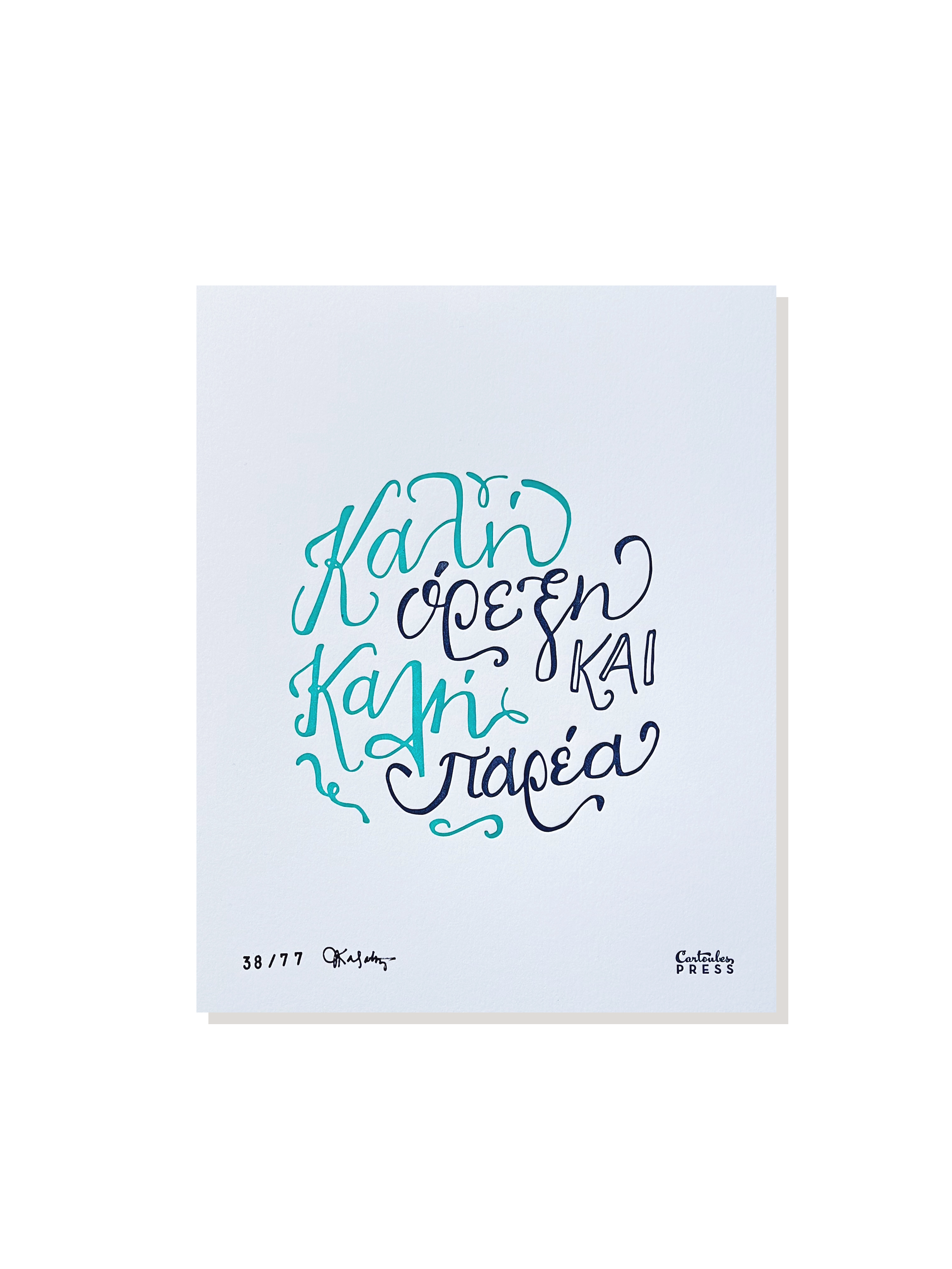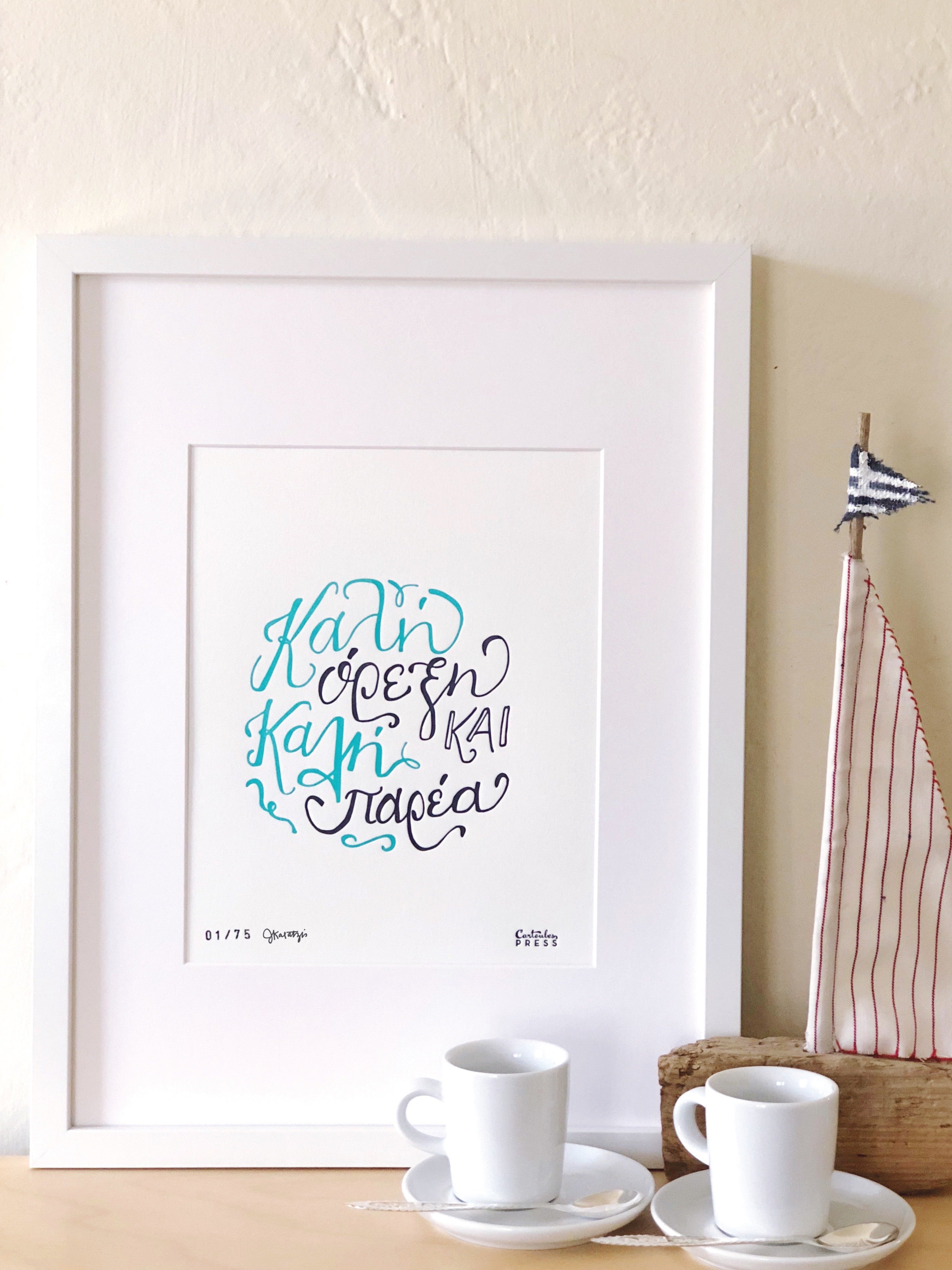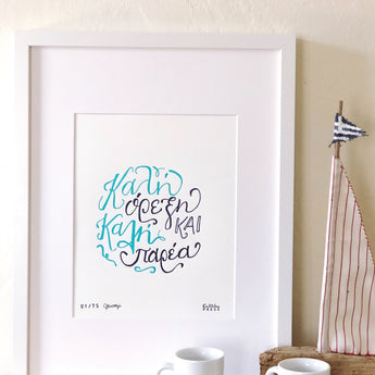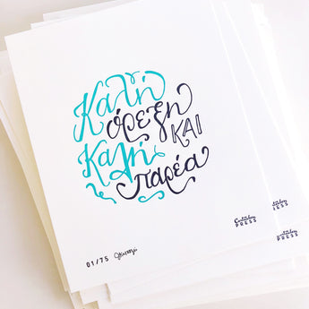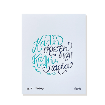 "Καλη ορεξη και καλη παρεα" - the direct translation is "Good Appetite and Good Company." This hand-lettered, letterpress print is the perfect piece of art to hang in your kitchen.