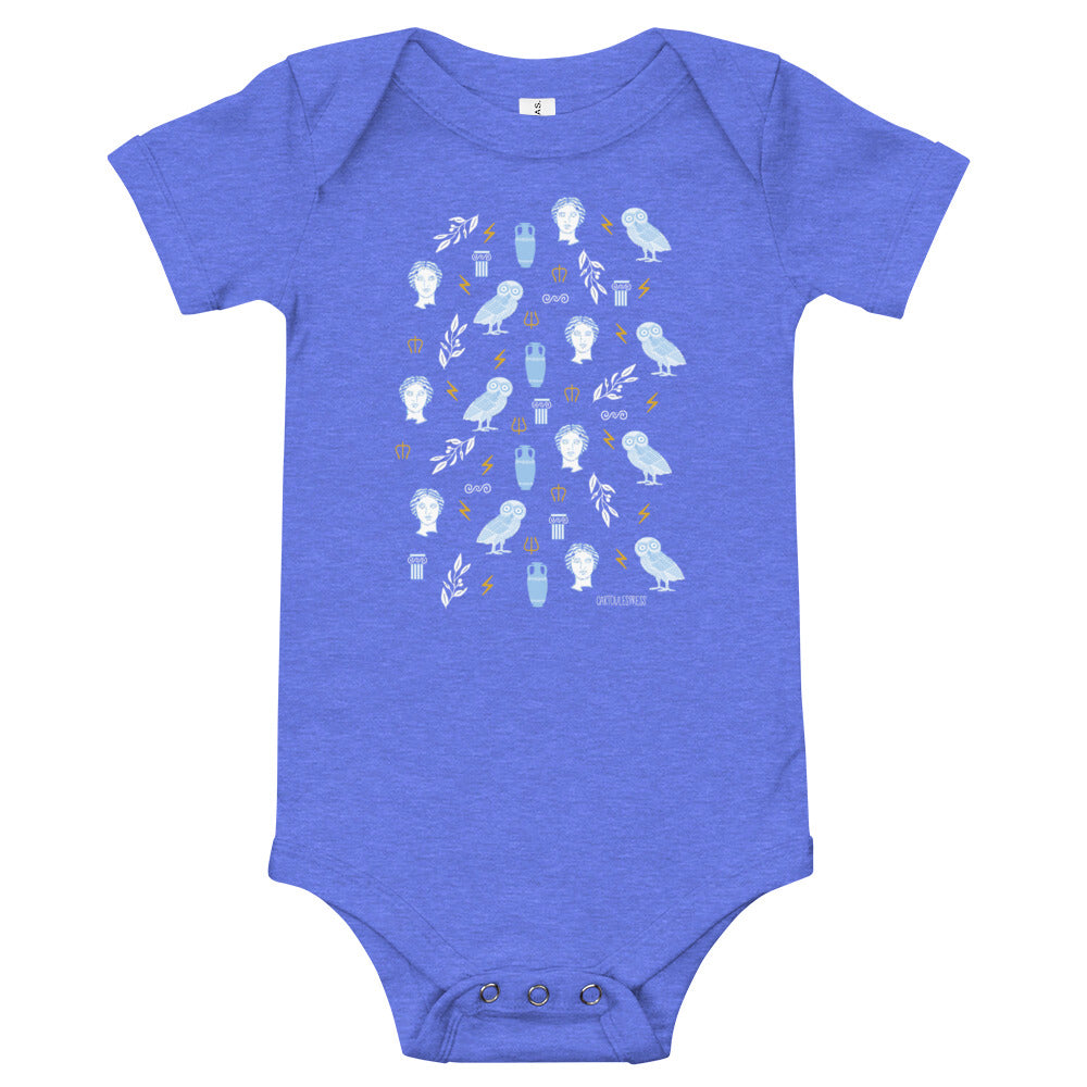 This baby onesie features hand-illustrated ancient Greek symbols by Cartoules Press. They include an ancient Greek statue bust, a Greek column, an olive branch, the Athenian owl, an amphora, Zeus' lightning bolt, and Poseidon's trident.