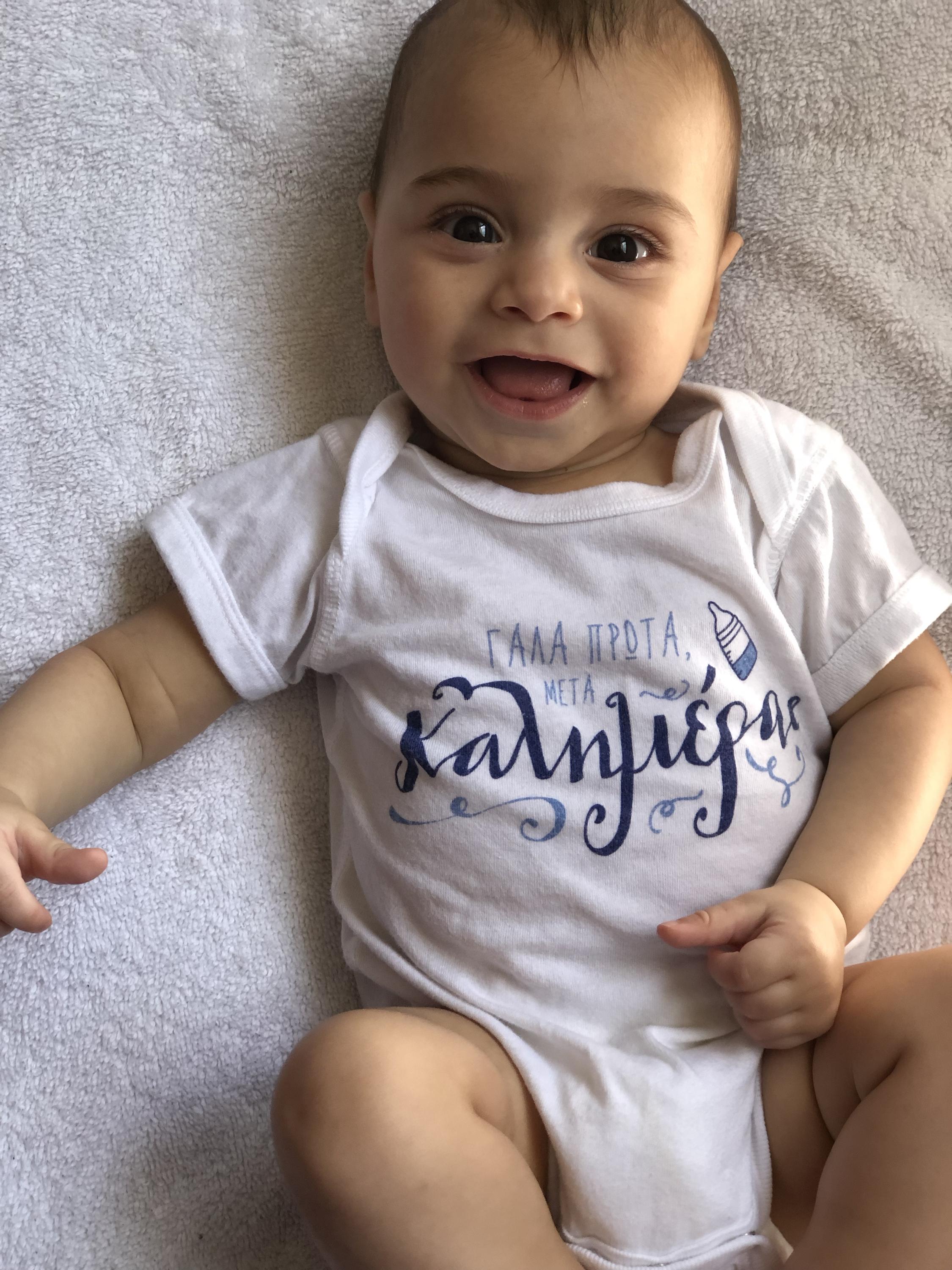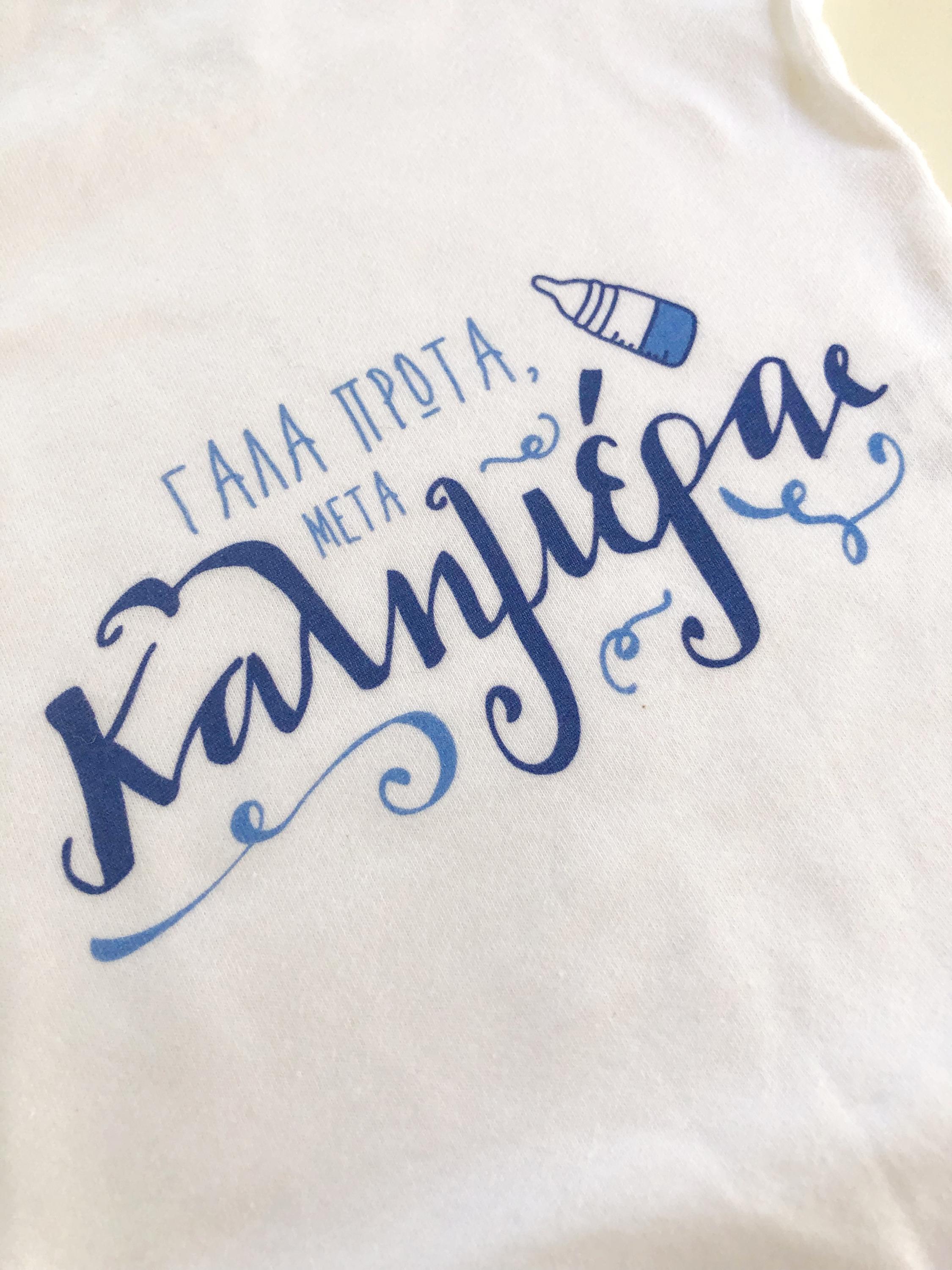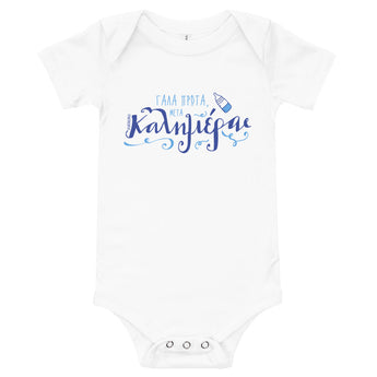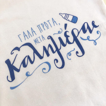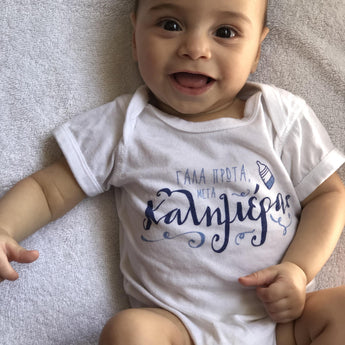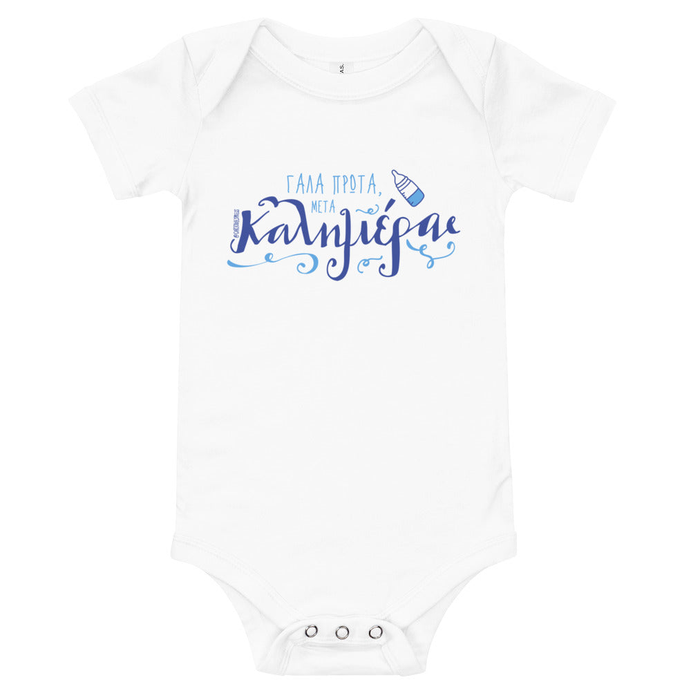 Babies need their morning fuel too! This baby onesie reads, "Milk first, then good morning." It has three snap leg closure for easy changing, and a comfortable envelope neckline.