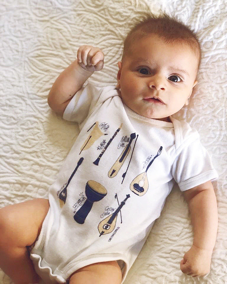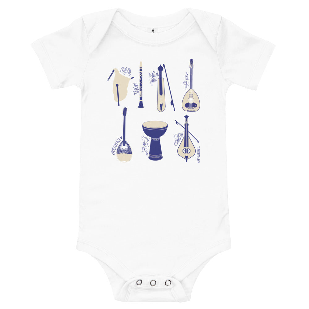 This baby onesie features hand-illustrated Greek folk Instruments including bouzouki, toubeleki, gaida, Cretan Lyra, Pontian Lyra, klarino