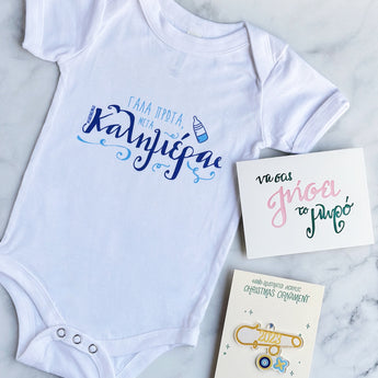 * a New Baby greeting card that reads: Na sas zisei (να σας ζήσει) meaning “May he/she live (a happy life)”