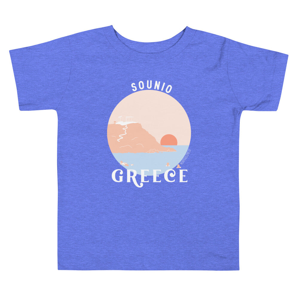 This toddler tee features an illustration of the Temple of Poseidon, at Sounio, Greece, and the surrounding landscape. It's the perfect souvenir tee to take home, even if you aren't able to make it to Greece.