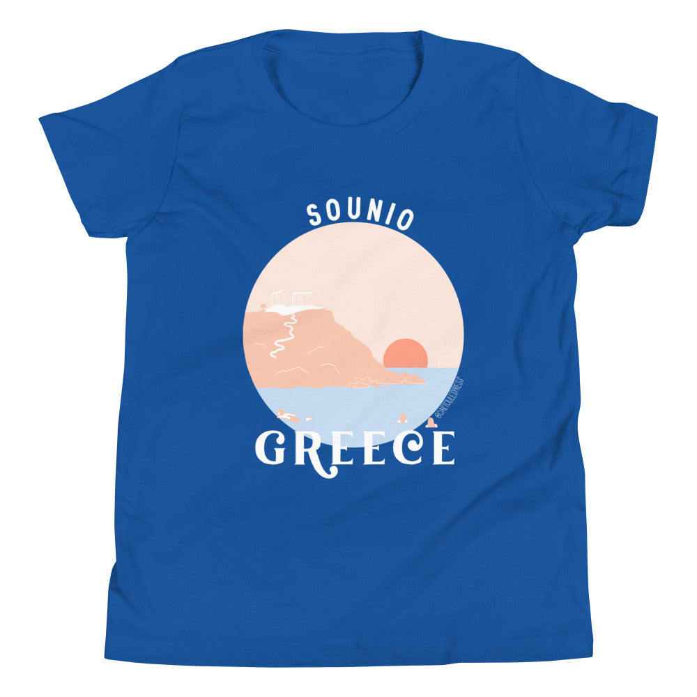 This youth tee features an illustration of the Temple of Poseidon, at Sounio, Greece, and the surrounding landscape. It's the perfect souvenir tee to take home, even if you weren't able to make it to Greece.