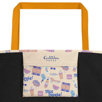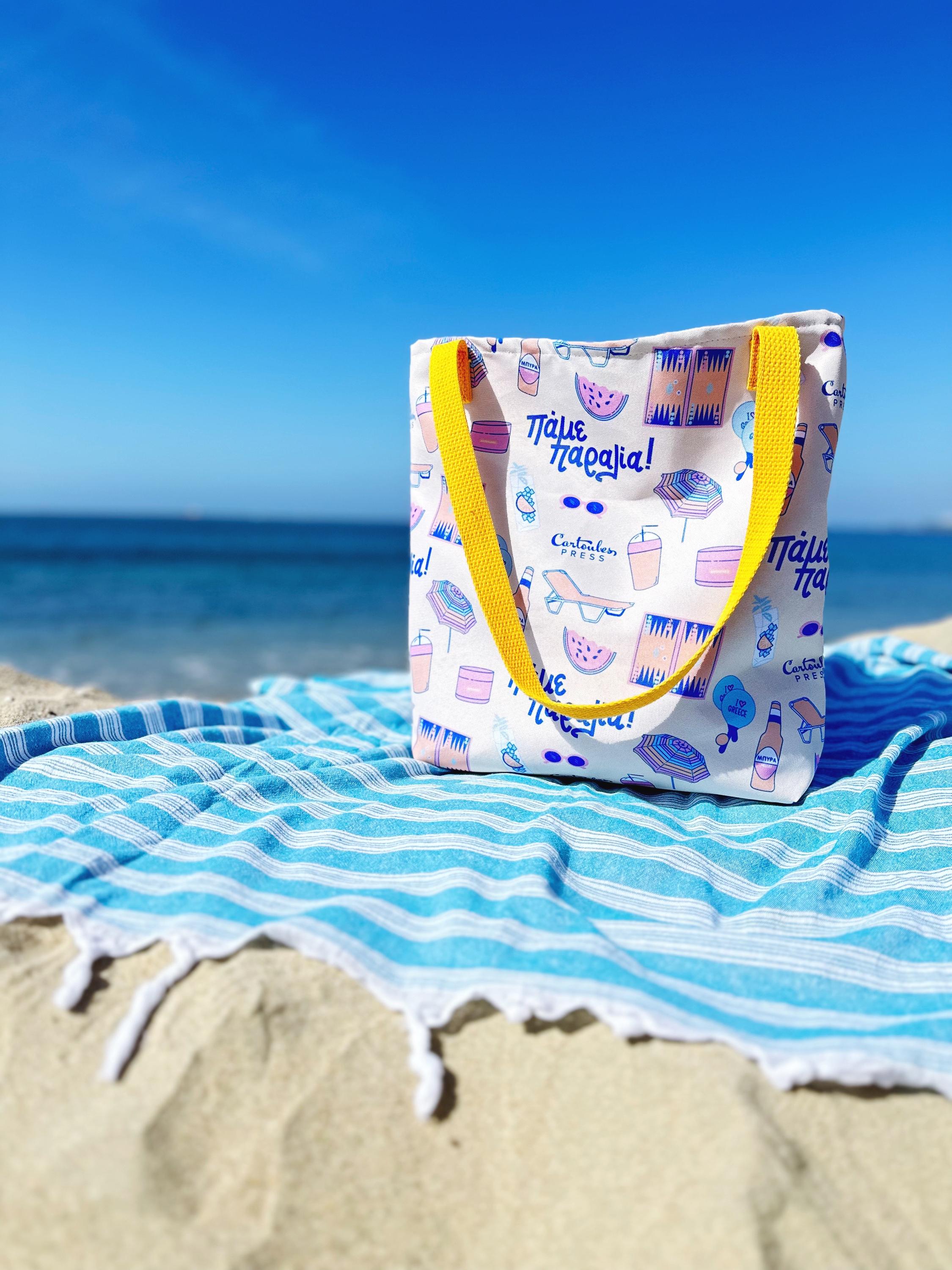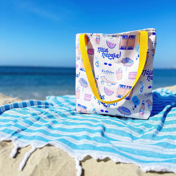 This fully printed beach bag will remind you of summers in Greece on the beach featuring original illustrations by Cartoules Press. This repetitive pattern includes tavli board, frappe and cocktail beverages, sunscreen, raketes, watermelon, beach chair and umbrella, and sunglasses. A smaller-size tote bag is also available here.