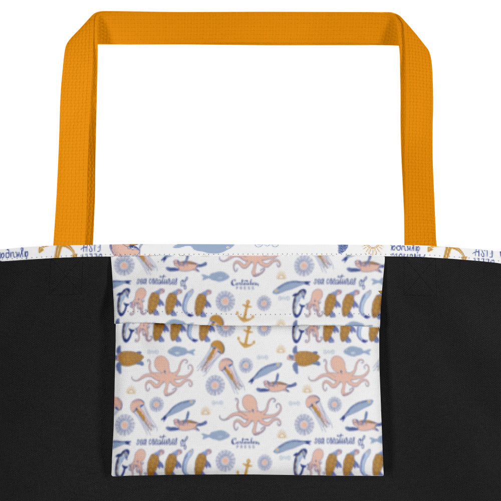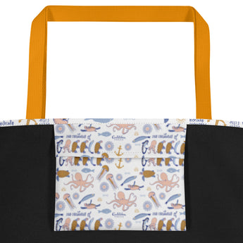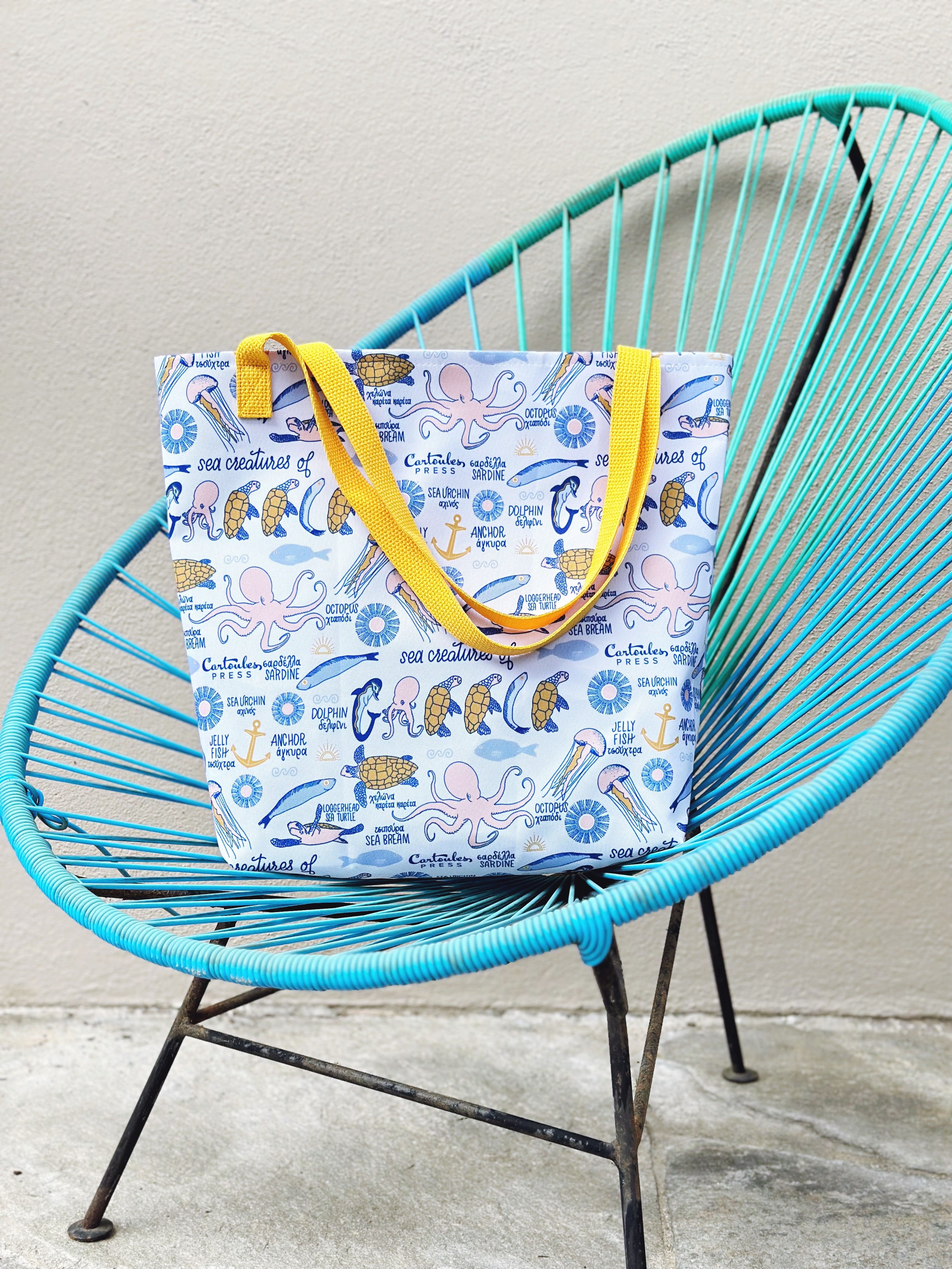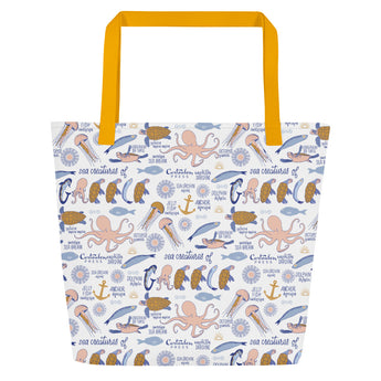 The Greek sea and its creatures have been part of Greece's cultural identity for generations dating back to mythology. This large beach bag highlights some of our favorites including dolphins (illustrated in the Minoan style), octopuses, jellyfish, sea breams, sea urchins, sea turtles, and sardines.