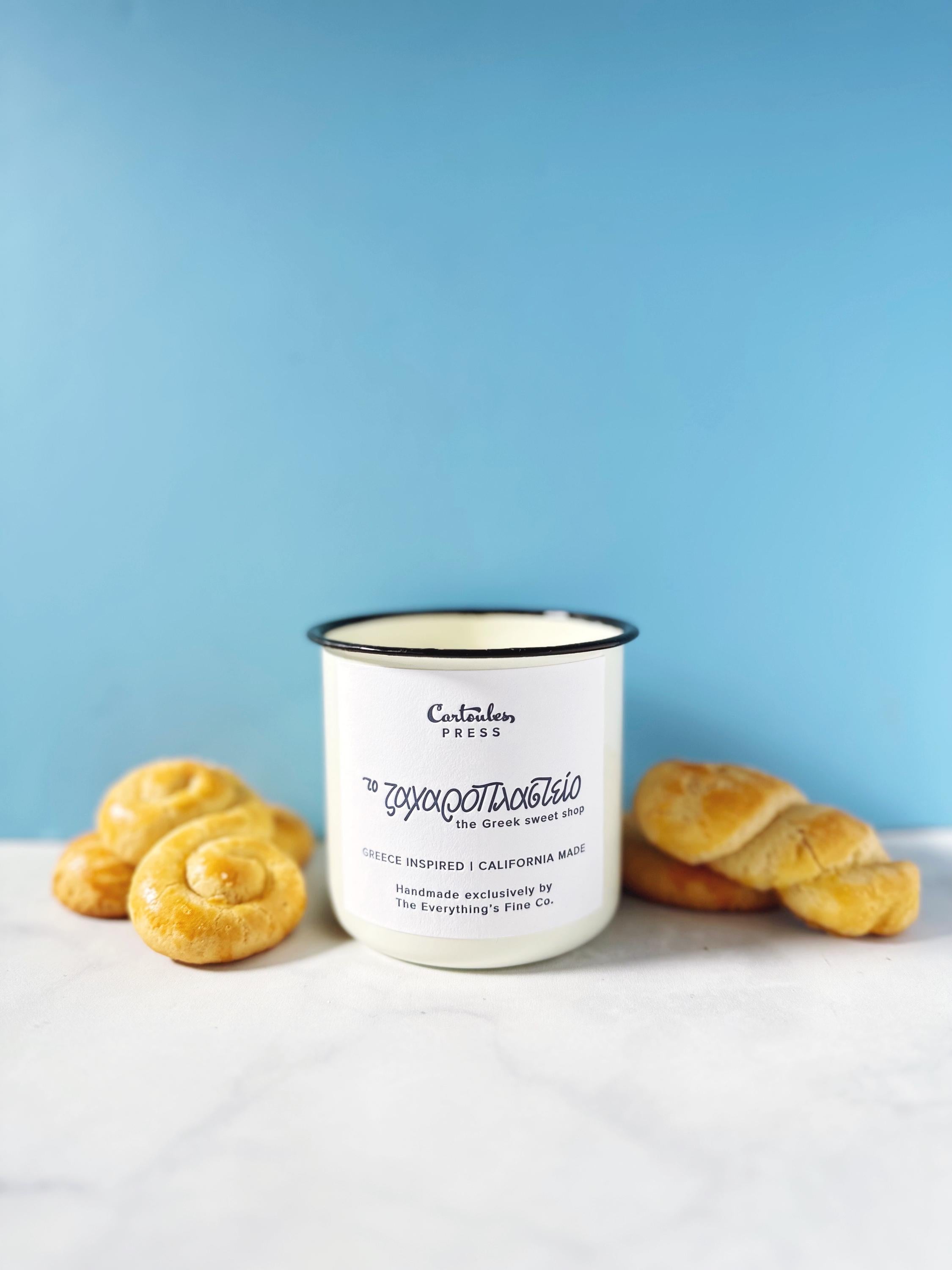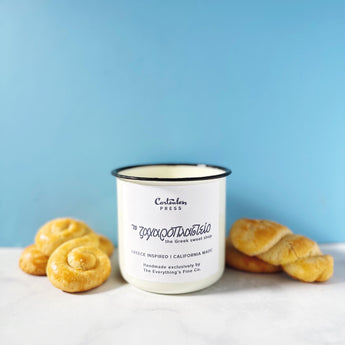 * Candles are poured in a white enameled container with lid - these vessels are reminiscent of retro Greek village life, and can be reused after to hold coffee and other dry goods, or q-tips and cotton balls!
