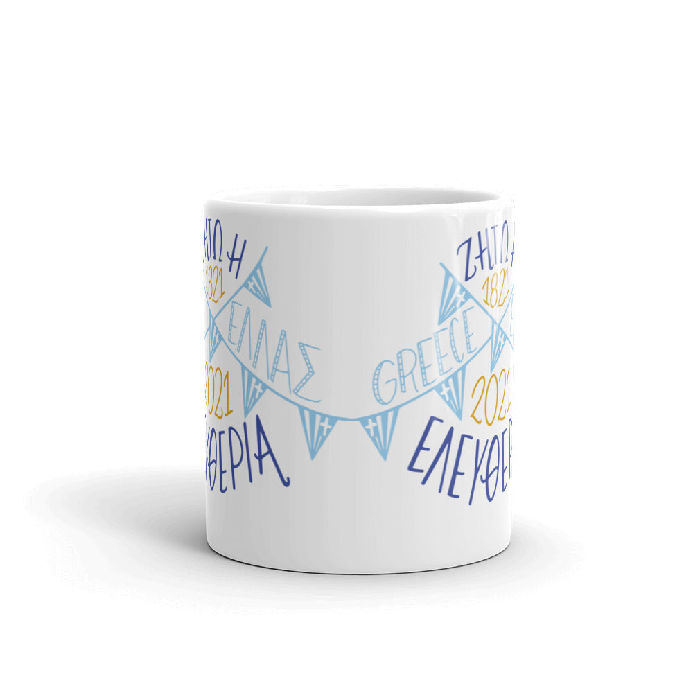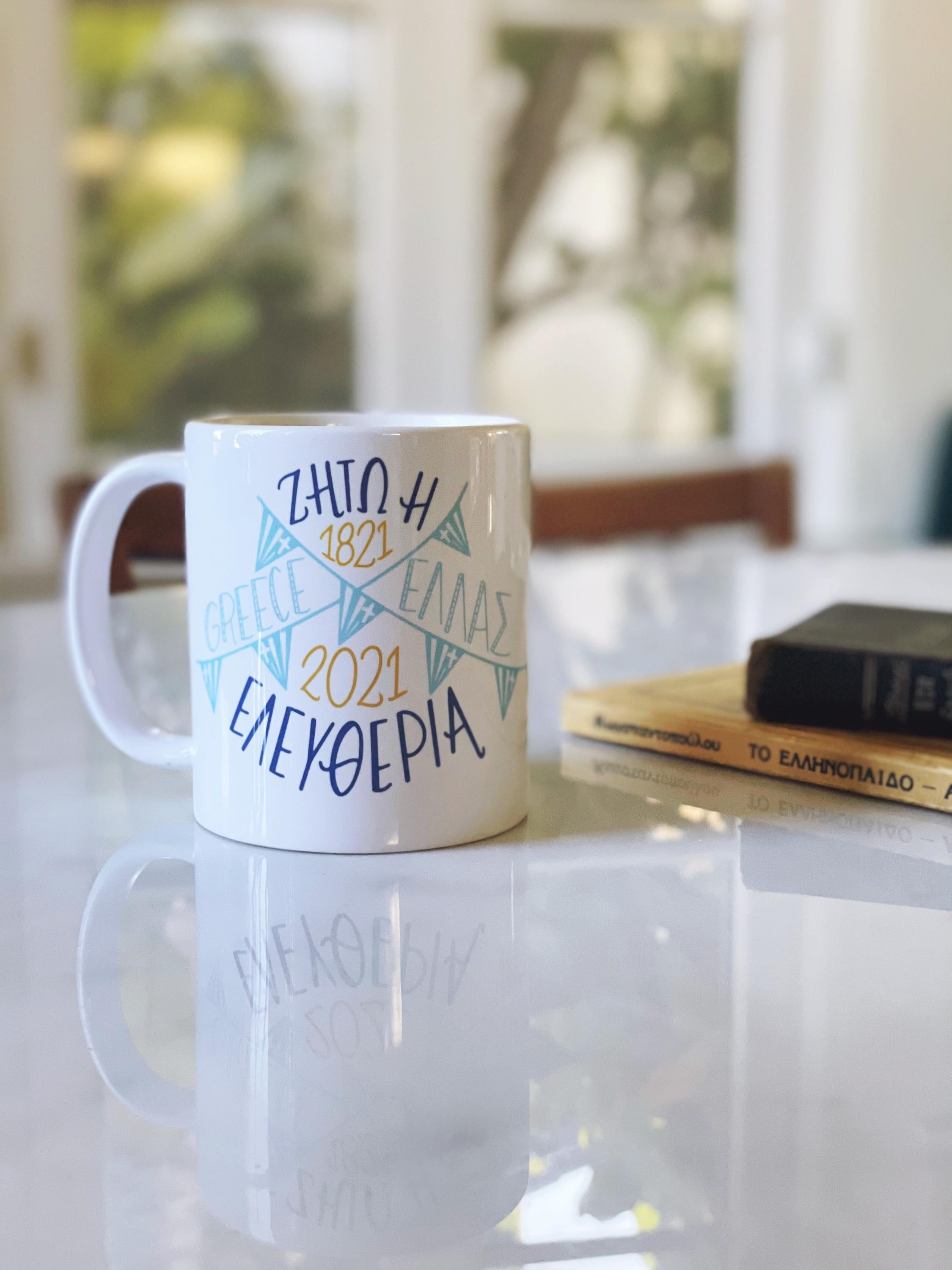 This ceramic mug commemorates the bicentennial of Greek independence, which we celebrated on March 25, 2021 - honoring 200 years of freedom. Inspired by my many years growing up in Greek school reciting poems and singing songs at the 25th of March celebrations in my community, the design features a Greek flag banner with the phrase, "ζήτω η ελευθερία" or "long live freedom". Greece // Ελλας