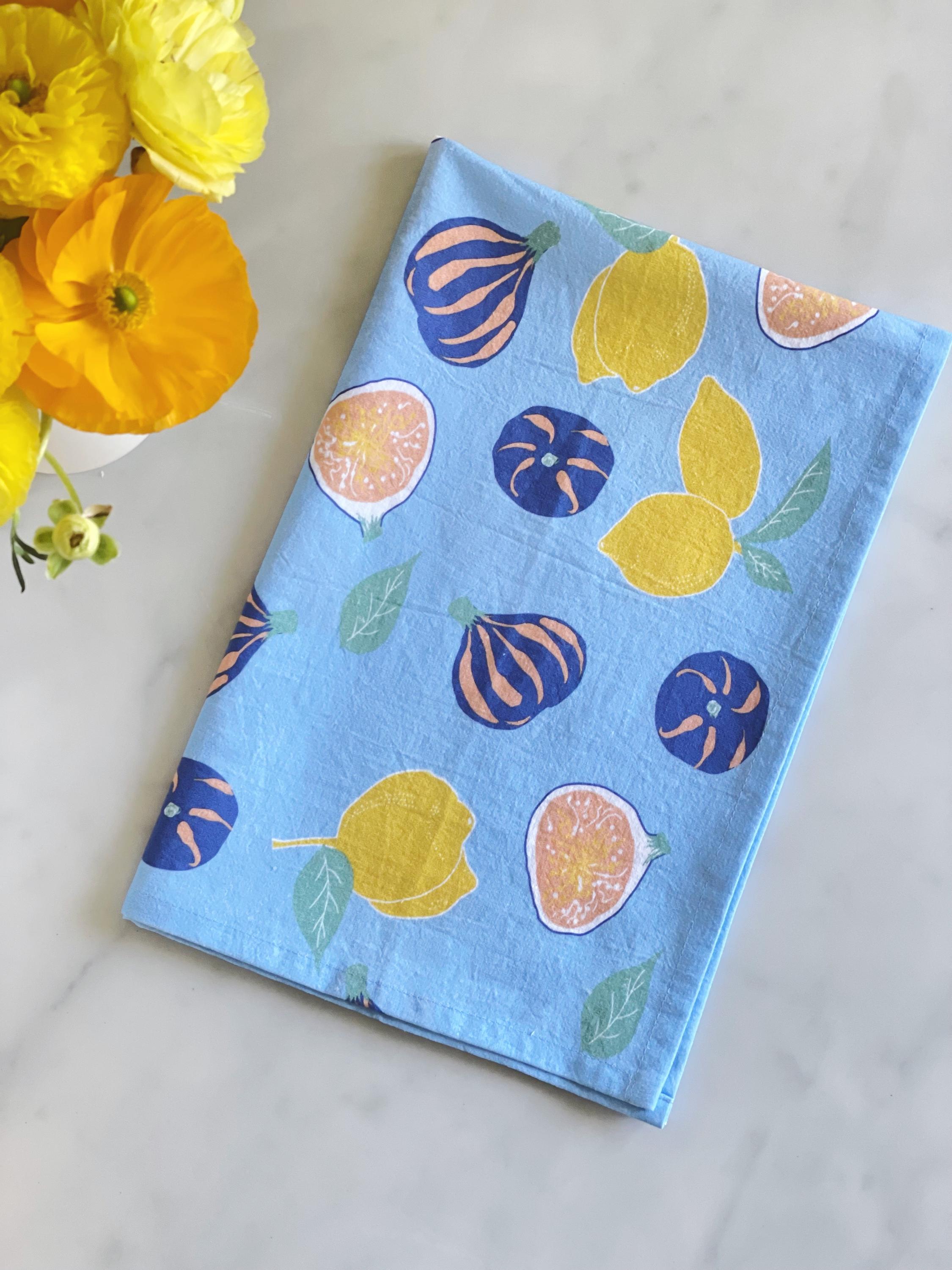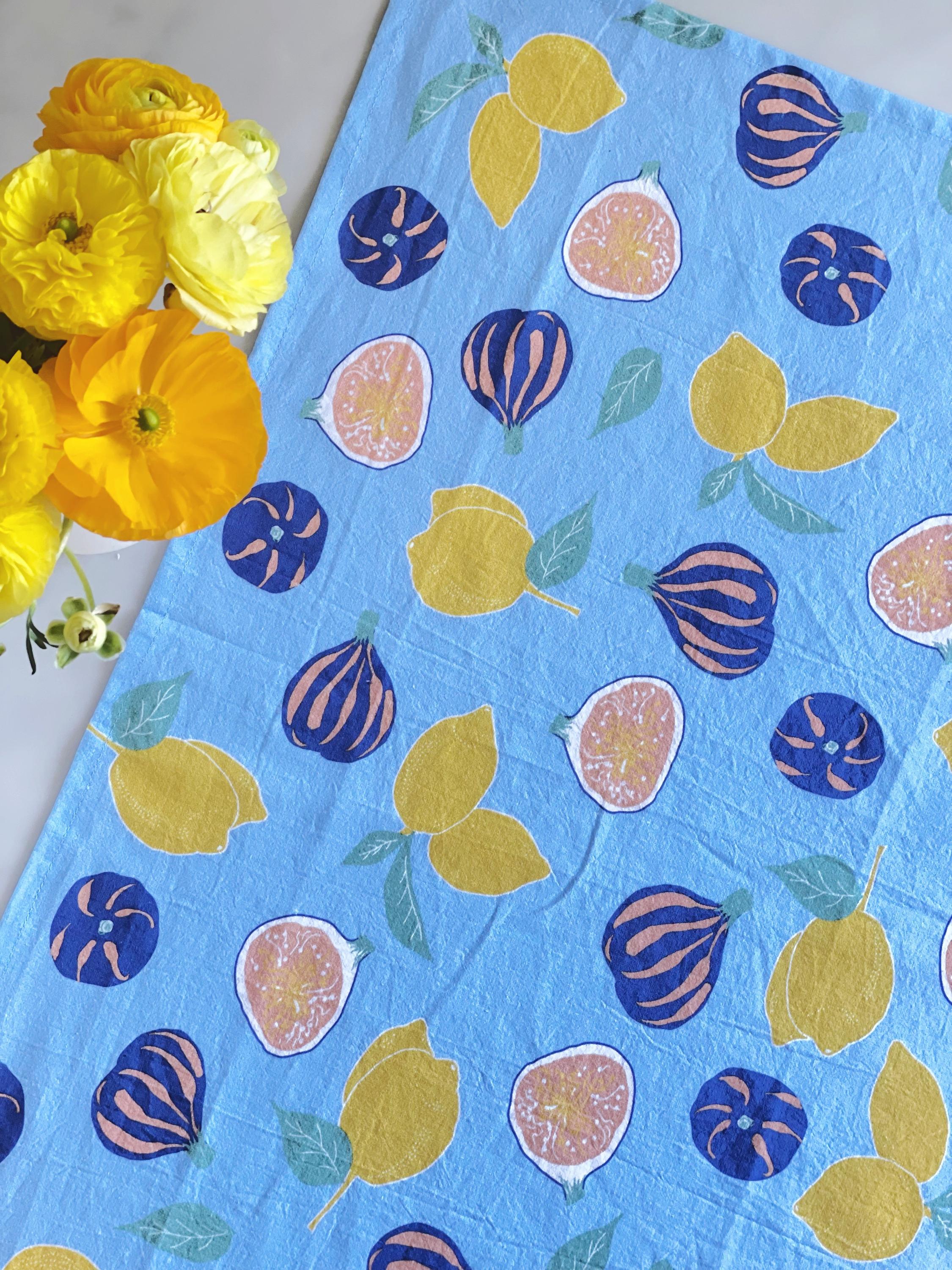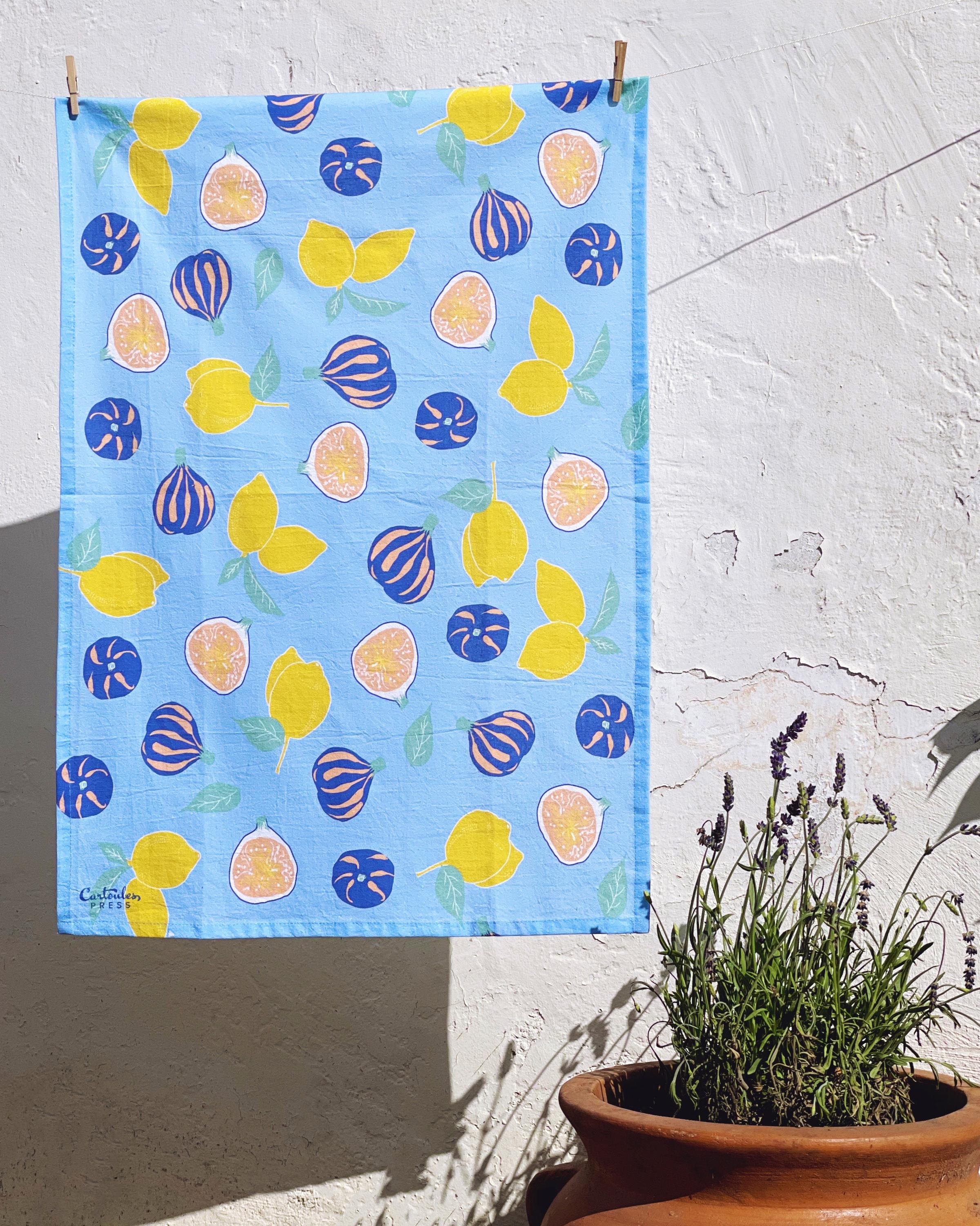 Nothing smells like Greek summer more than figs and lemons. These Greek staples are hand illustrated by Cartoules Press for this kitchen tea towel