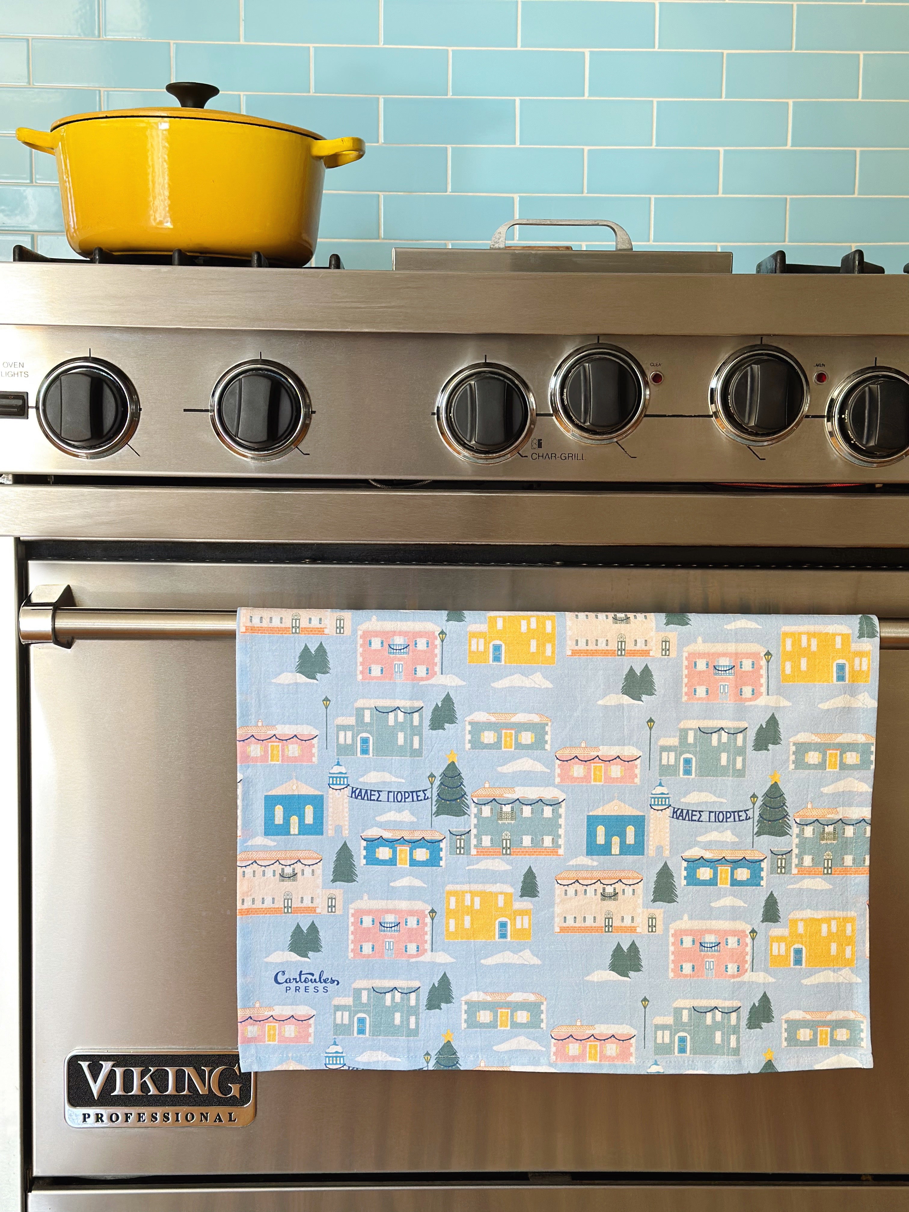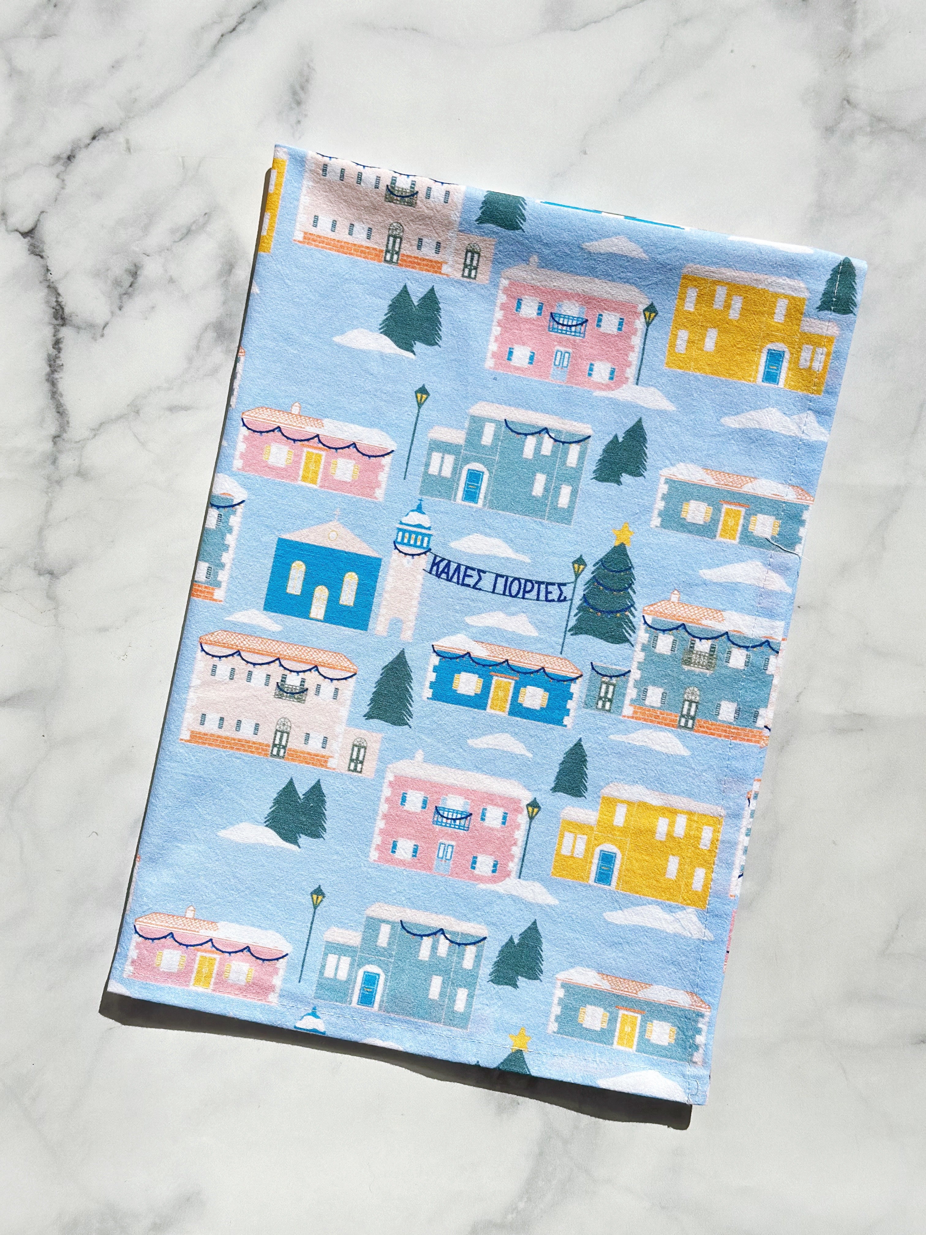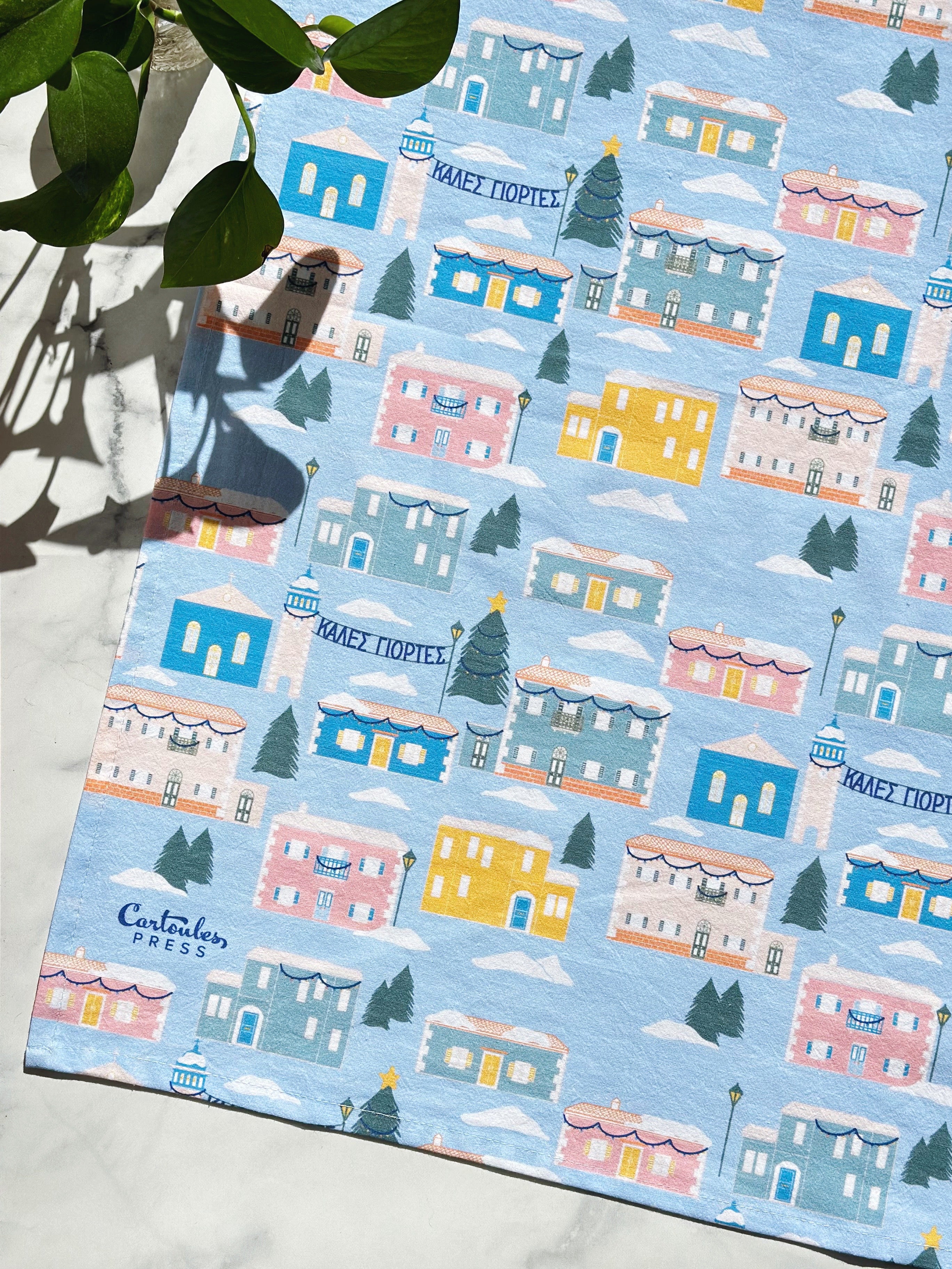 This tea towel captures the spirit of an Ionian Greek village during the holidays, featuring hand-illustrated homes in the classic Ionian architectural style, and town square shining with lights. Elements hand lettered by Cartoules Press. The text reads "Happy Holidays" in Greek.