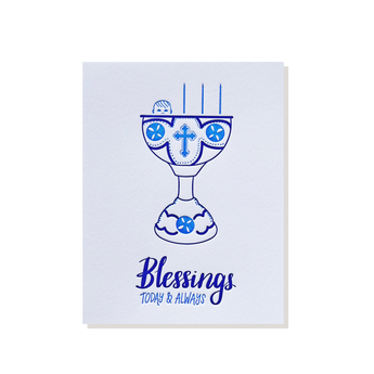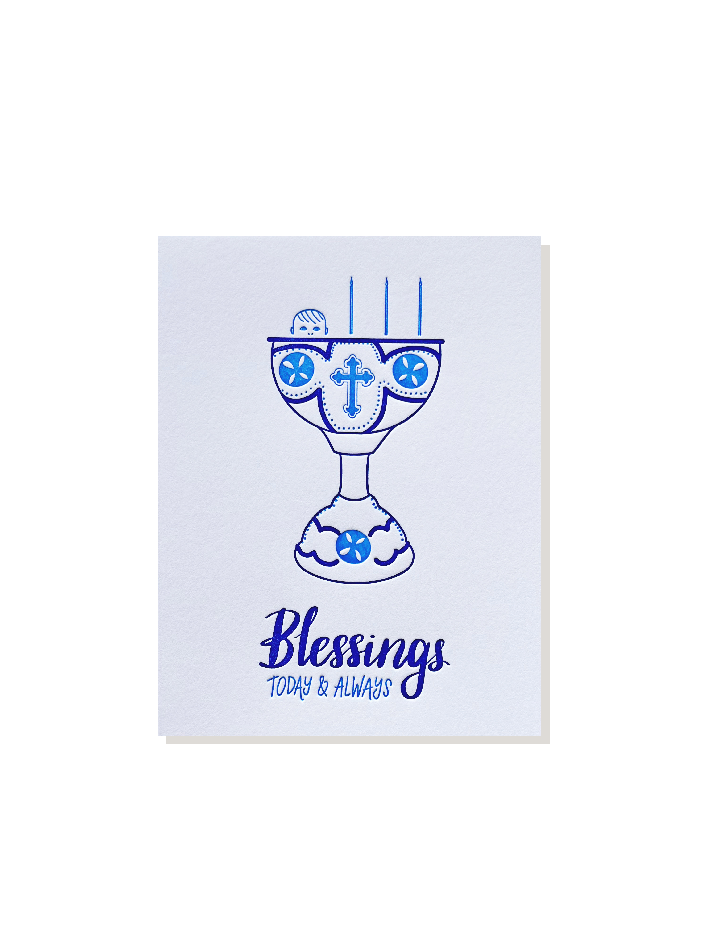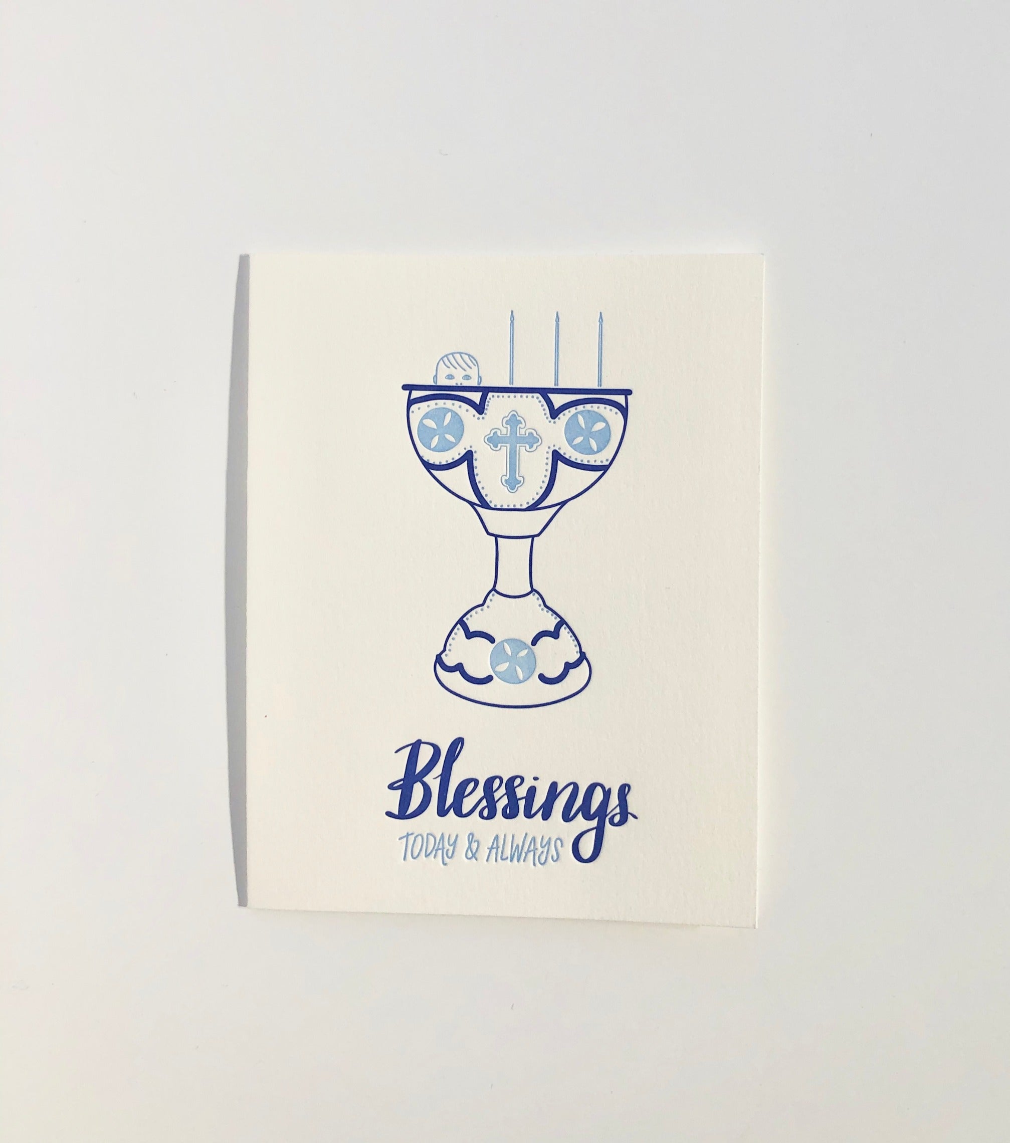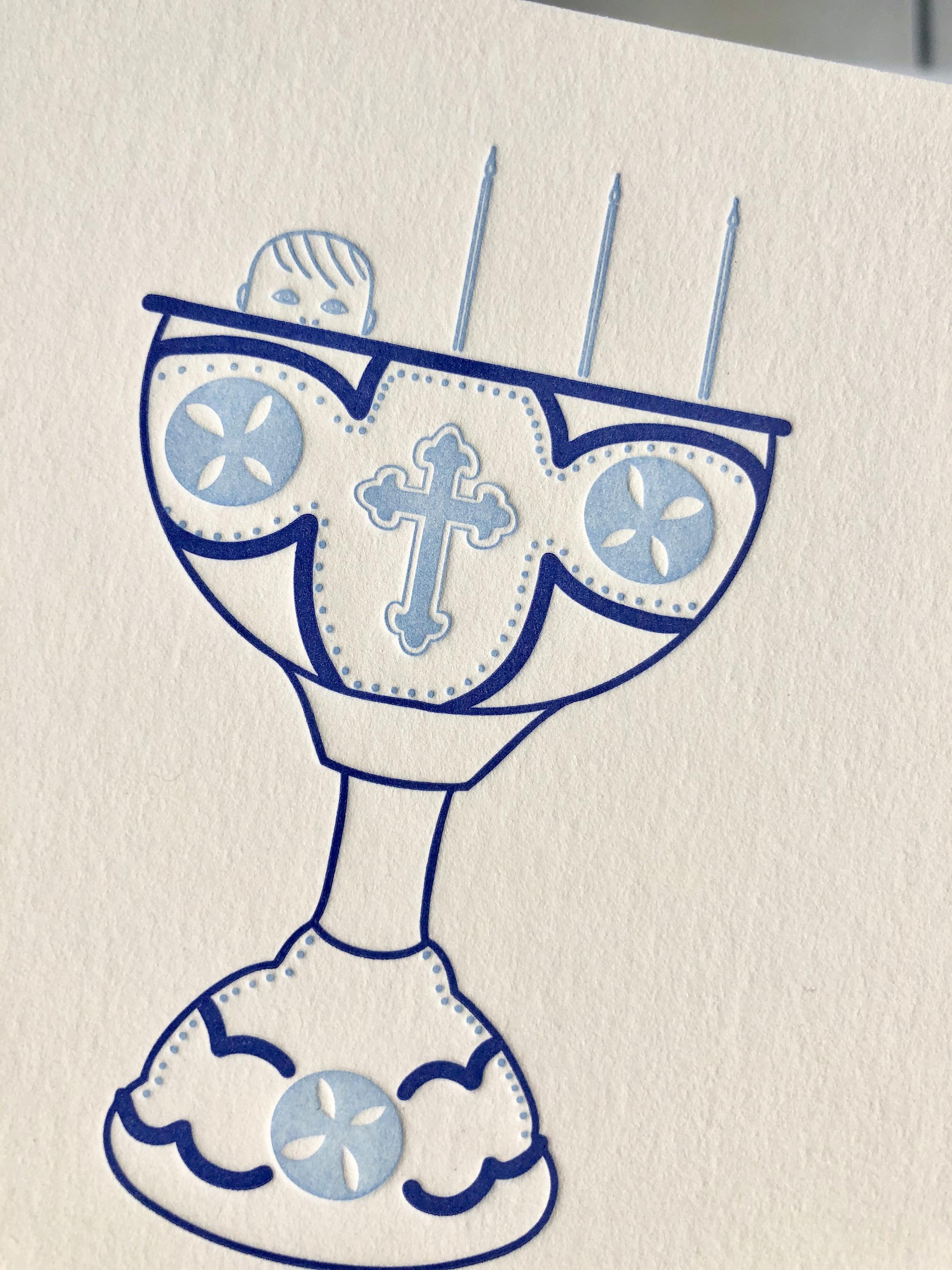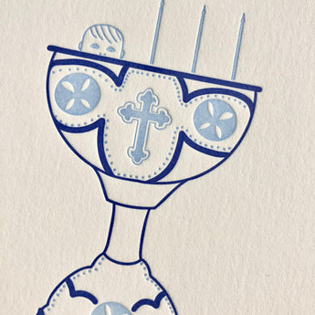 This handmade letterpress card showcases an illustration of a Greek Orthodox baptism font, with a tiny tyke peeking out from within. Share your congratulations with the newly baptized using this card!