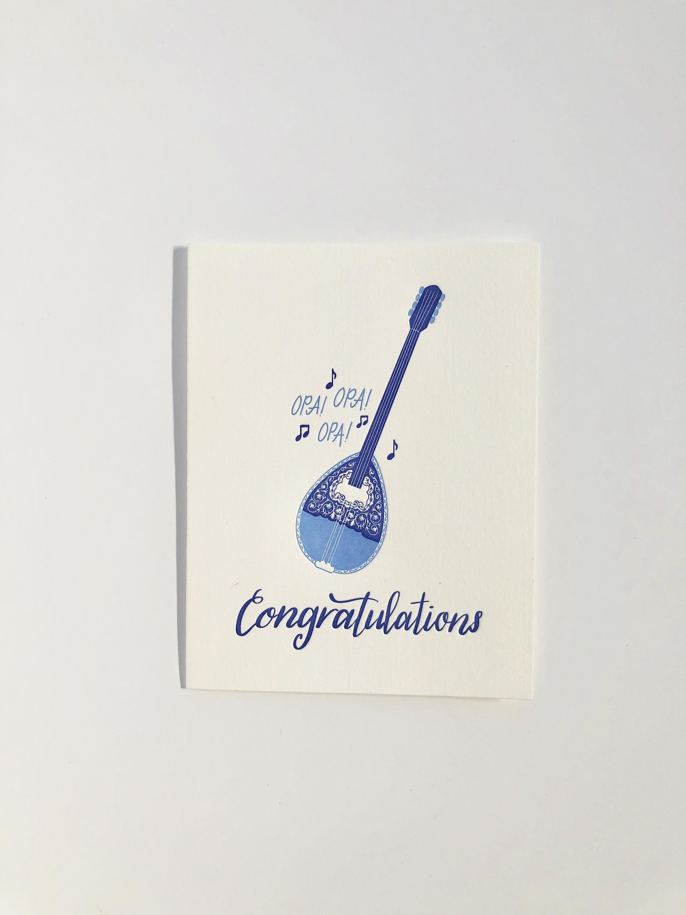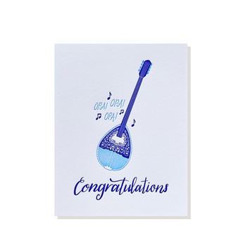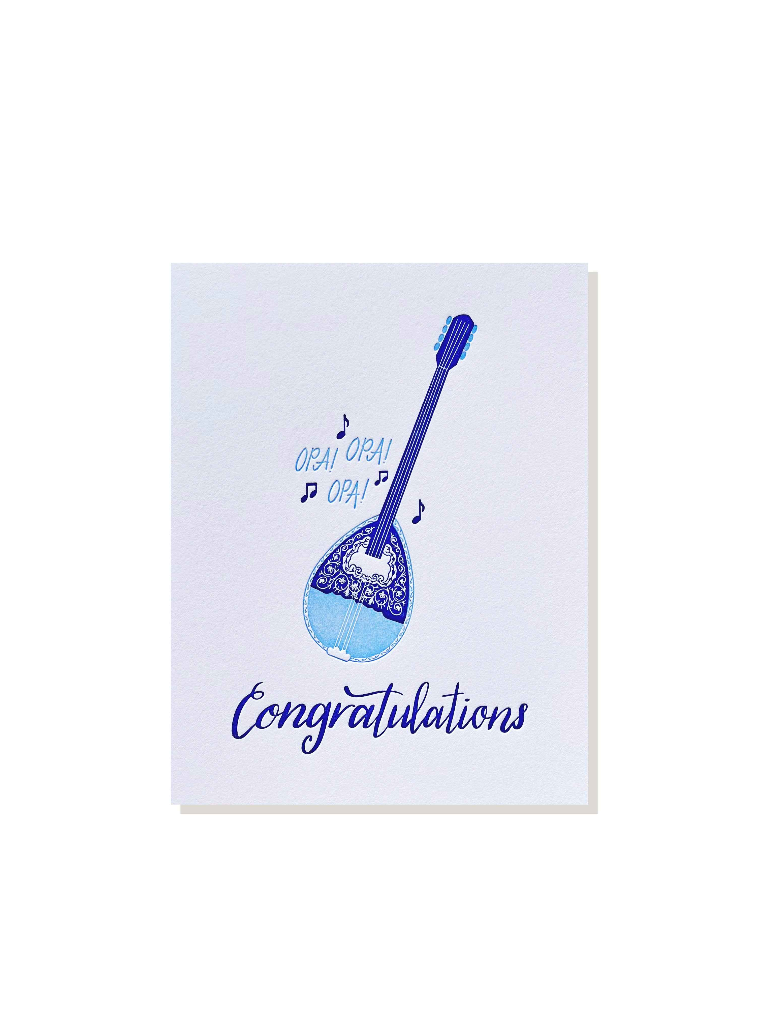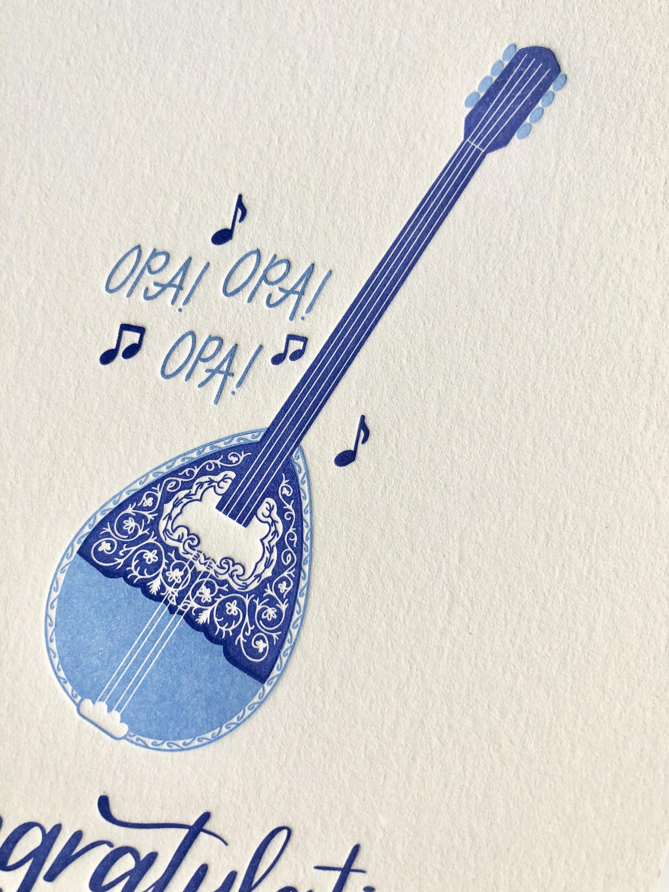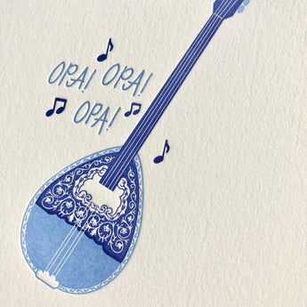 Congratulate your loved ones with a playful serenade by sending them this hand-printed Greek Bouzouki greeting card, complete with musical notes and the catchy words "opa, opa" radiating from the instrument. Opa!