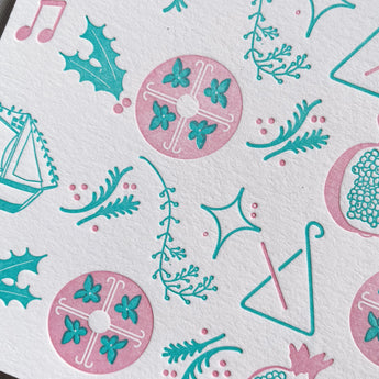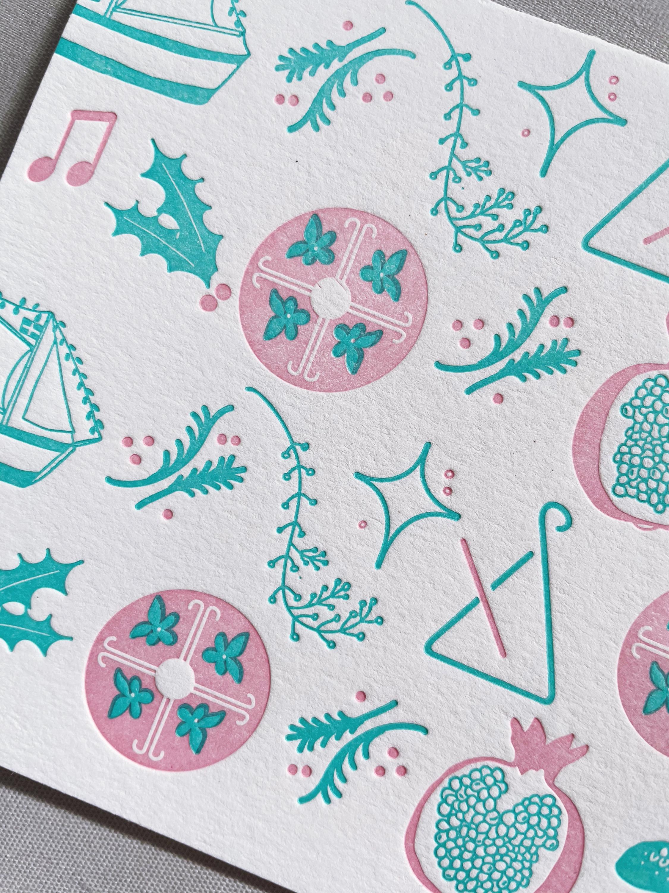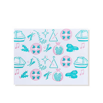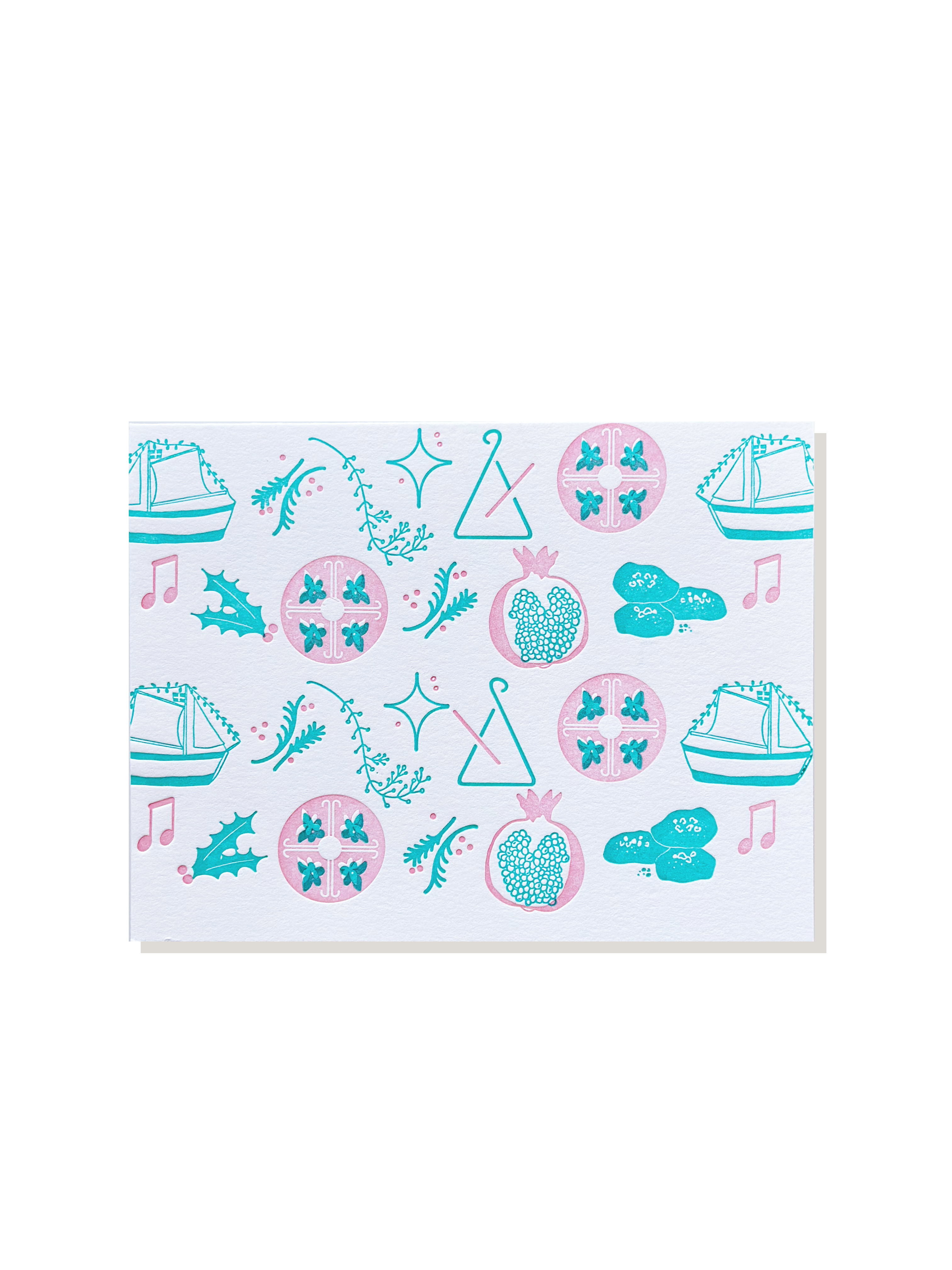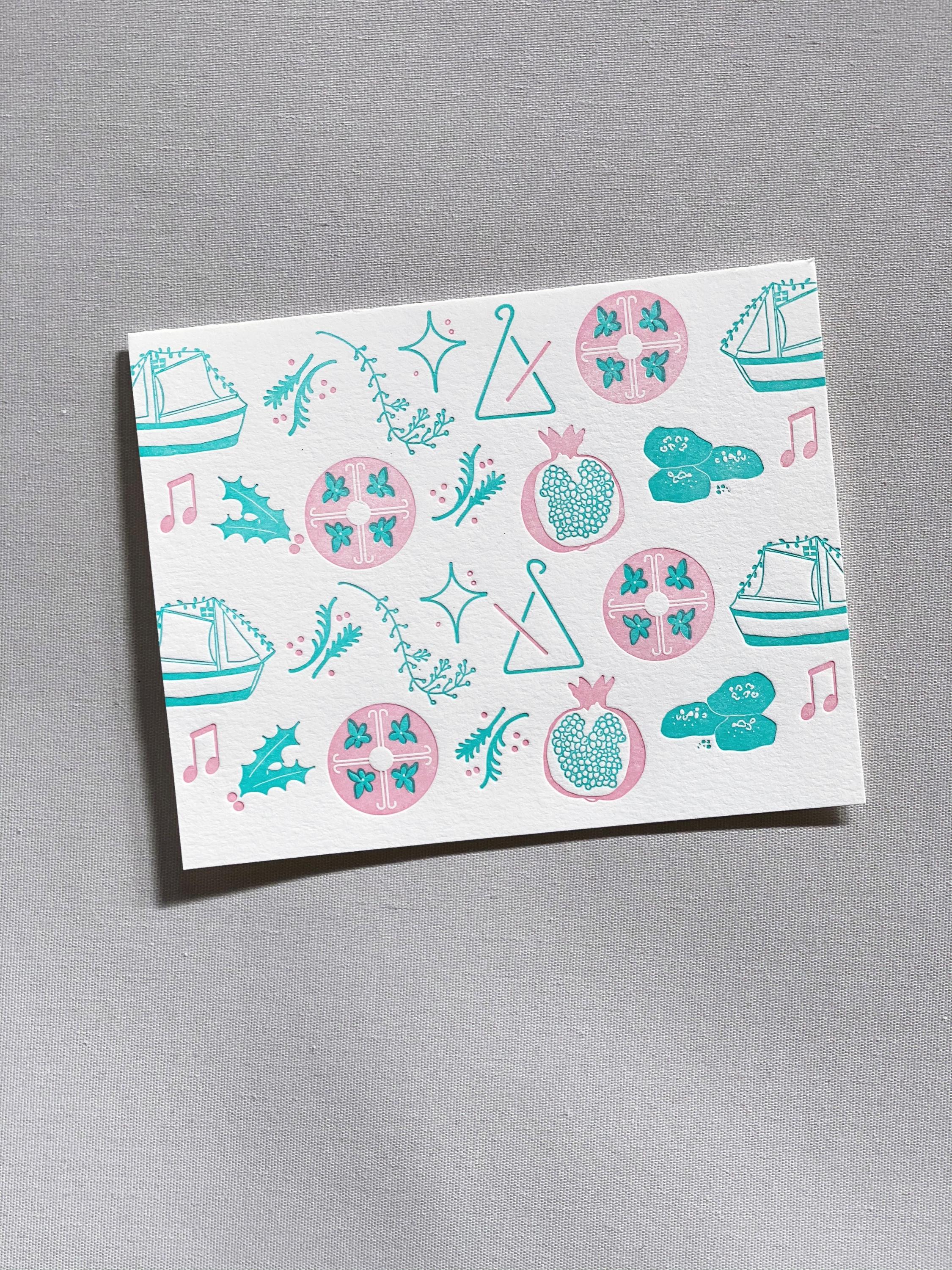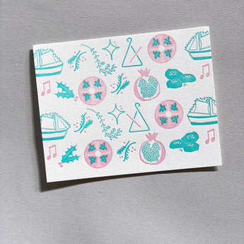 This hand-printed letterpress greeting card features hand-illustrated elements of a Greek Christmas including Melomakaronia cookies, trigona, which are used to sing the Christmas carols, a pomegranate for good luck, and the Christopsomo, or Christmas bread.