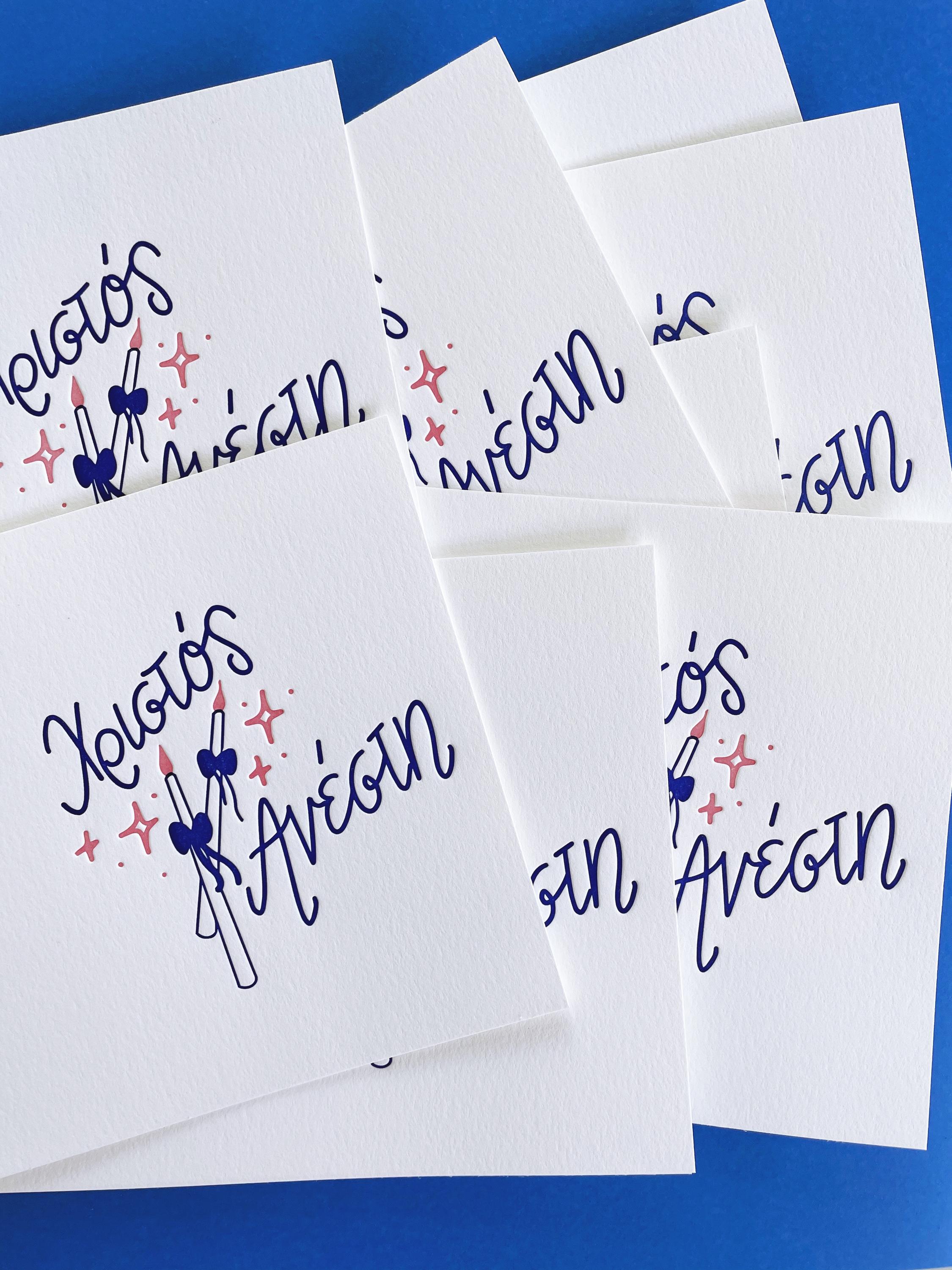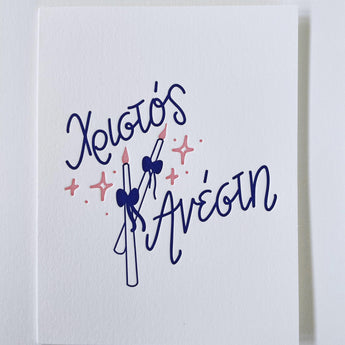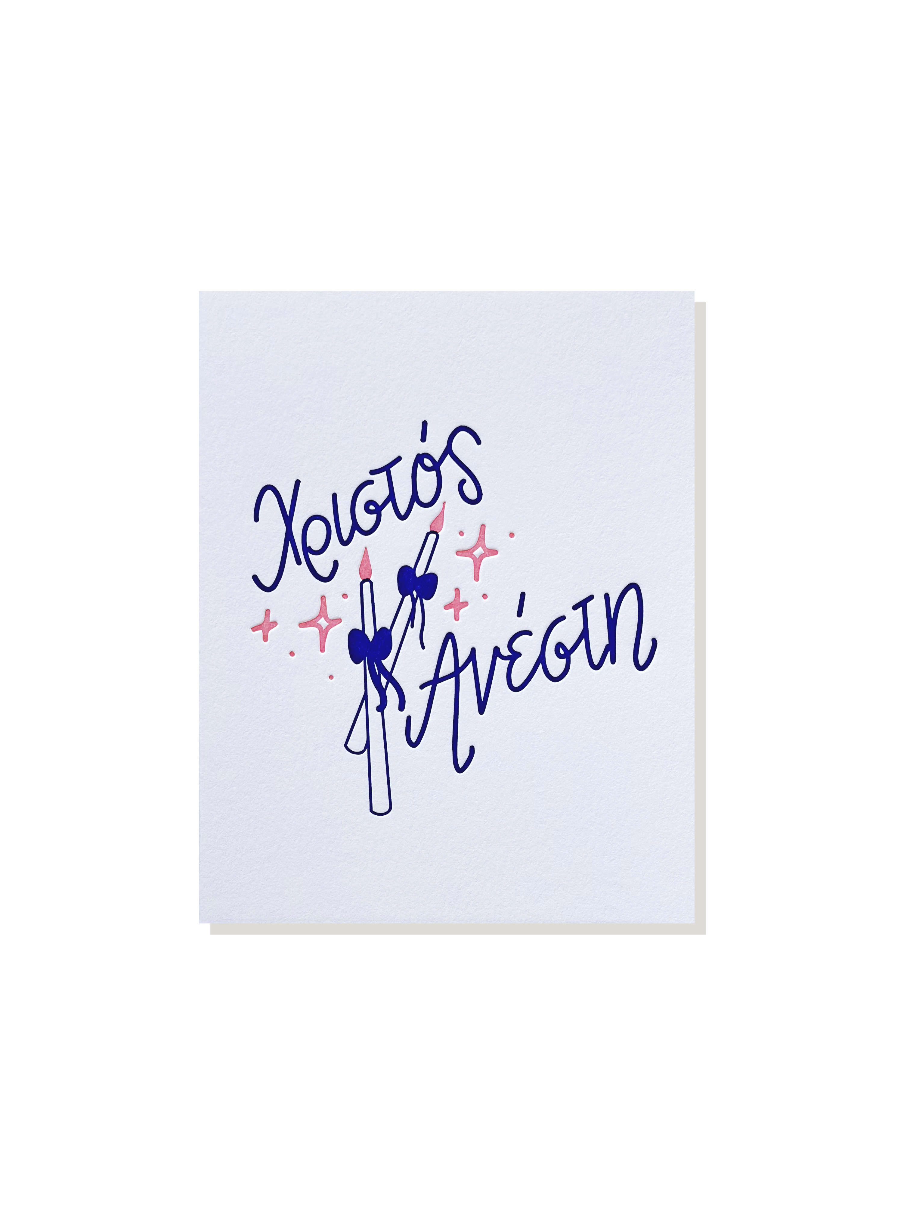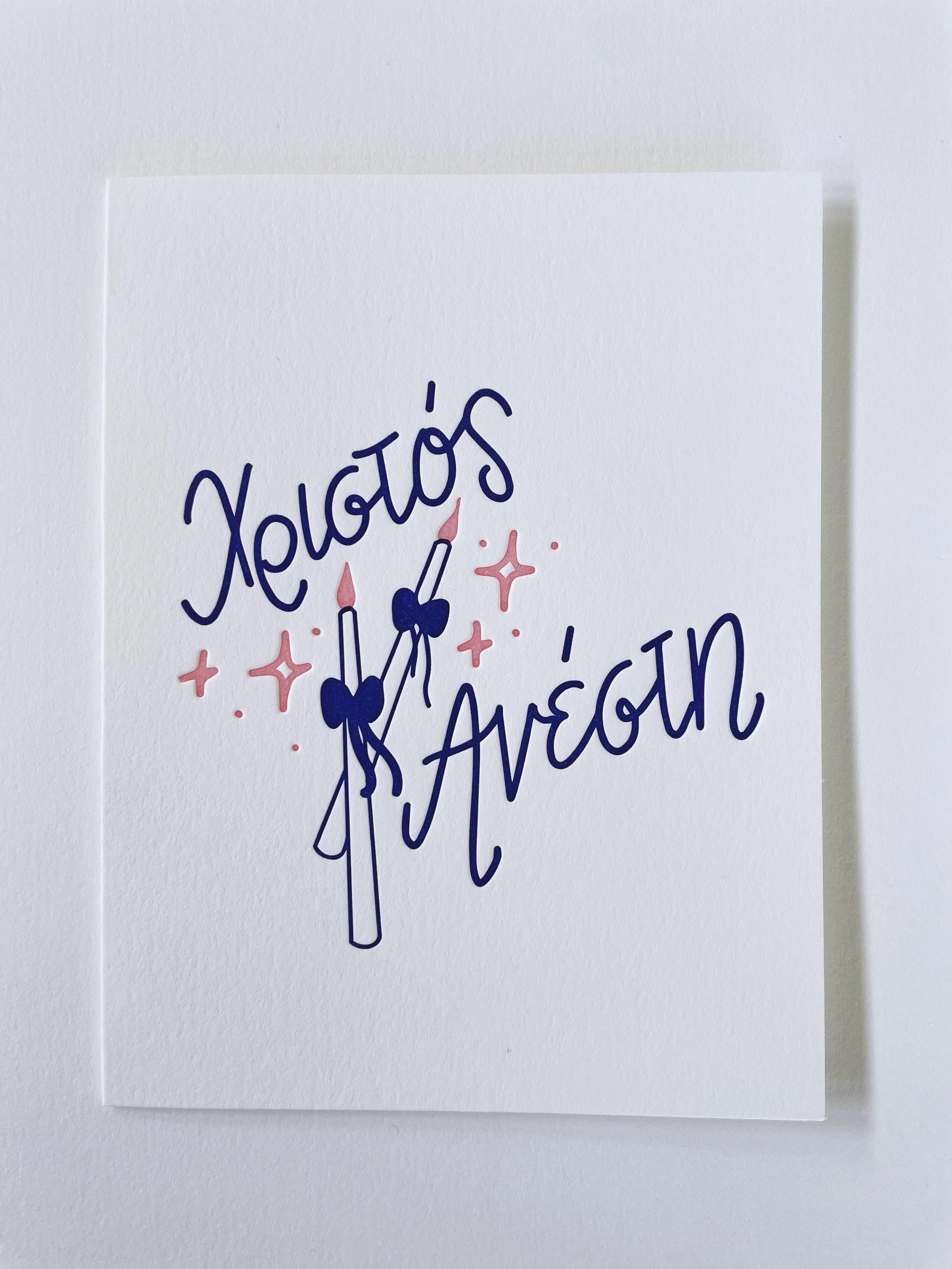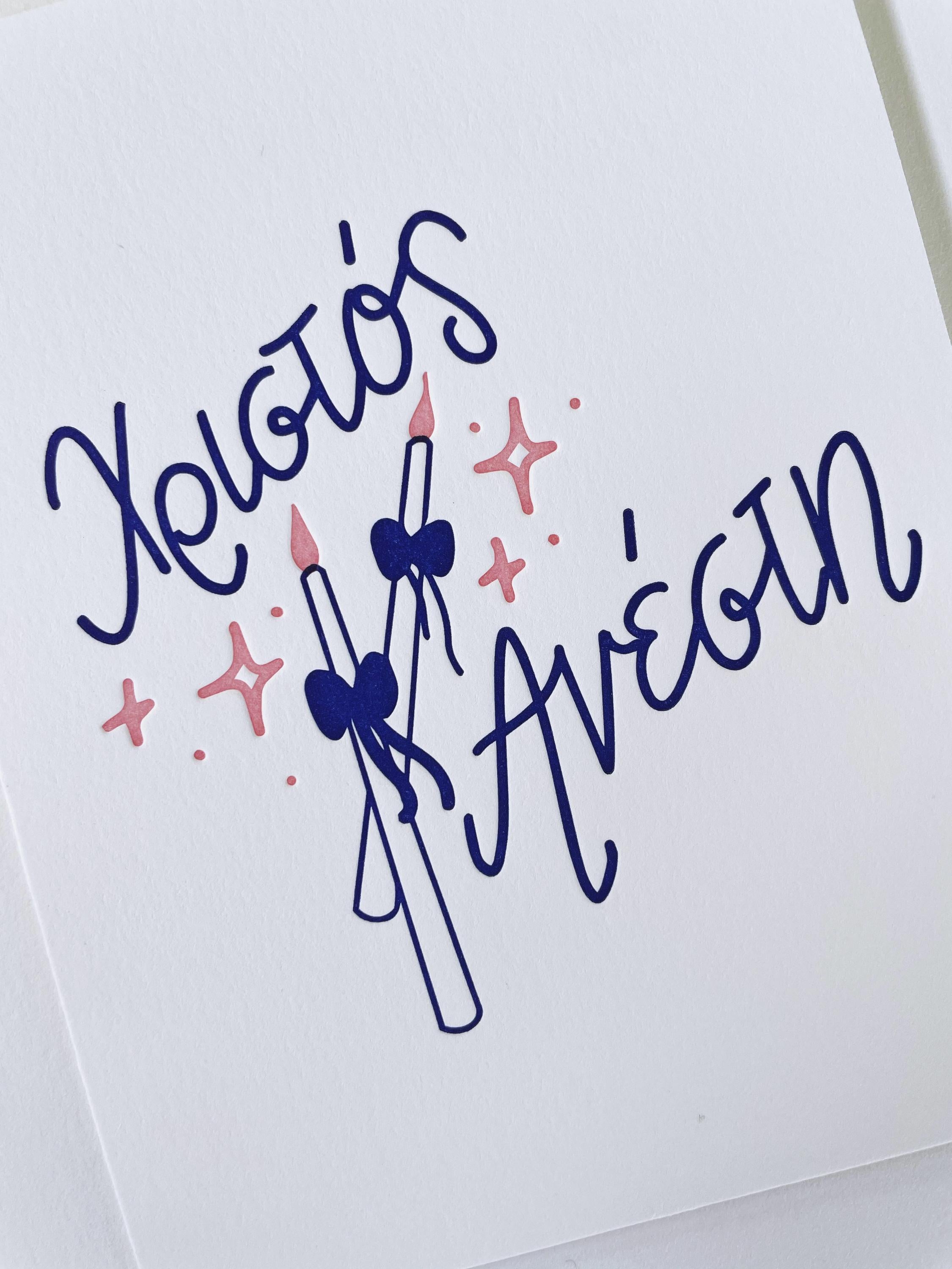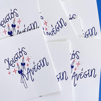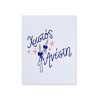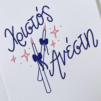 Send Easter wishes with our hand-lettered Hristos Anesti letterpress greeting card (translated to "Christ Is Risen" in Greek). The card features candles - in the Greek Orthodox church lit during the Anastasi/Resurrection service - to represent the risen Christ. A symbol of light and life, dispelling darkness and death.