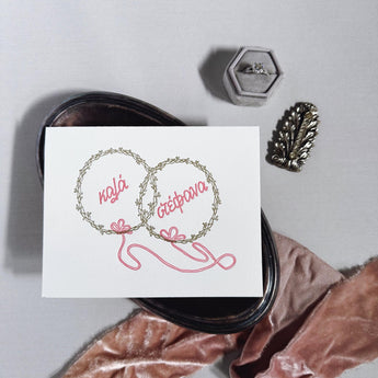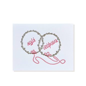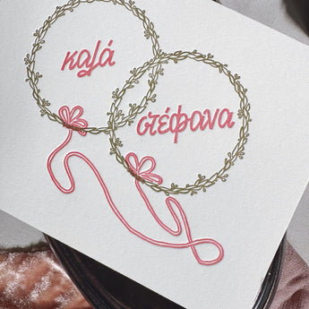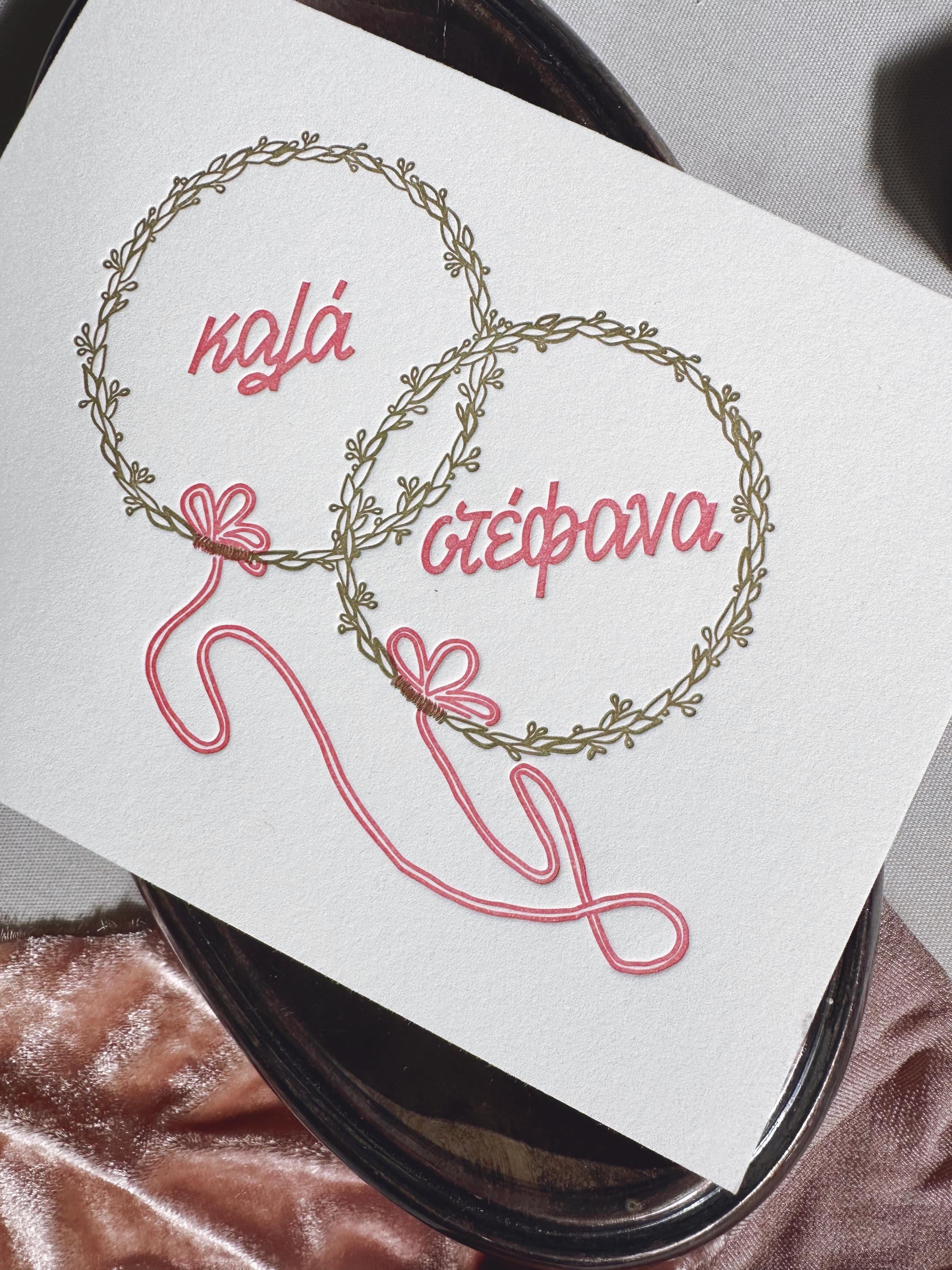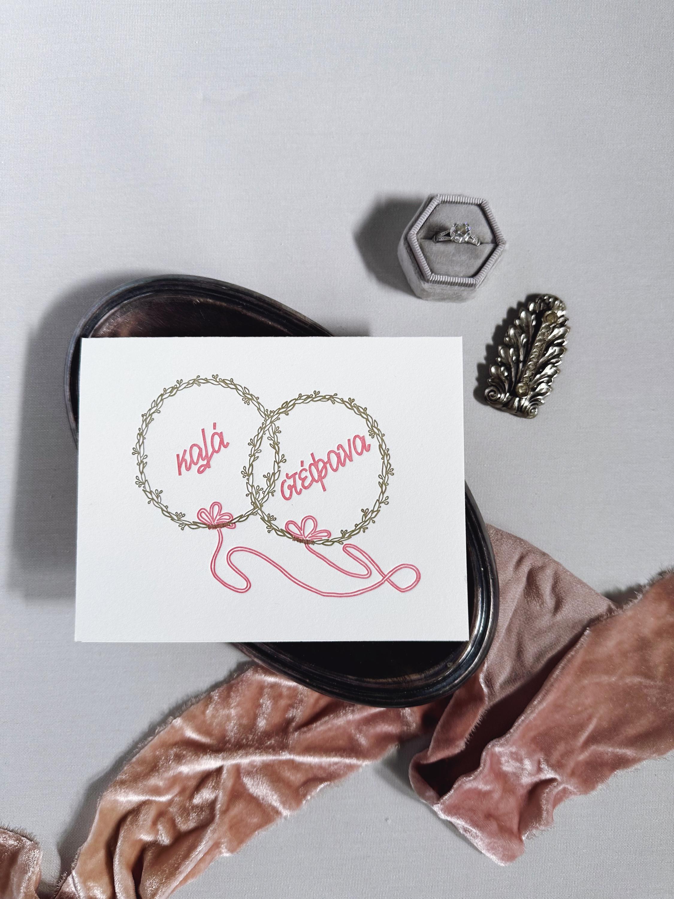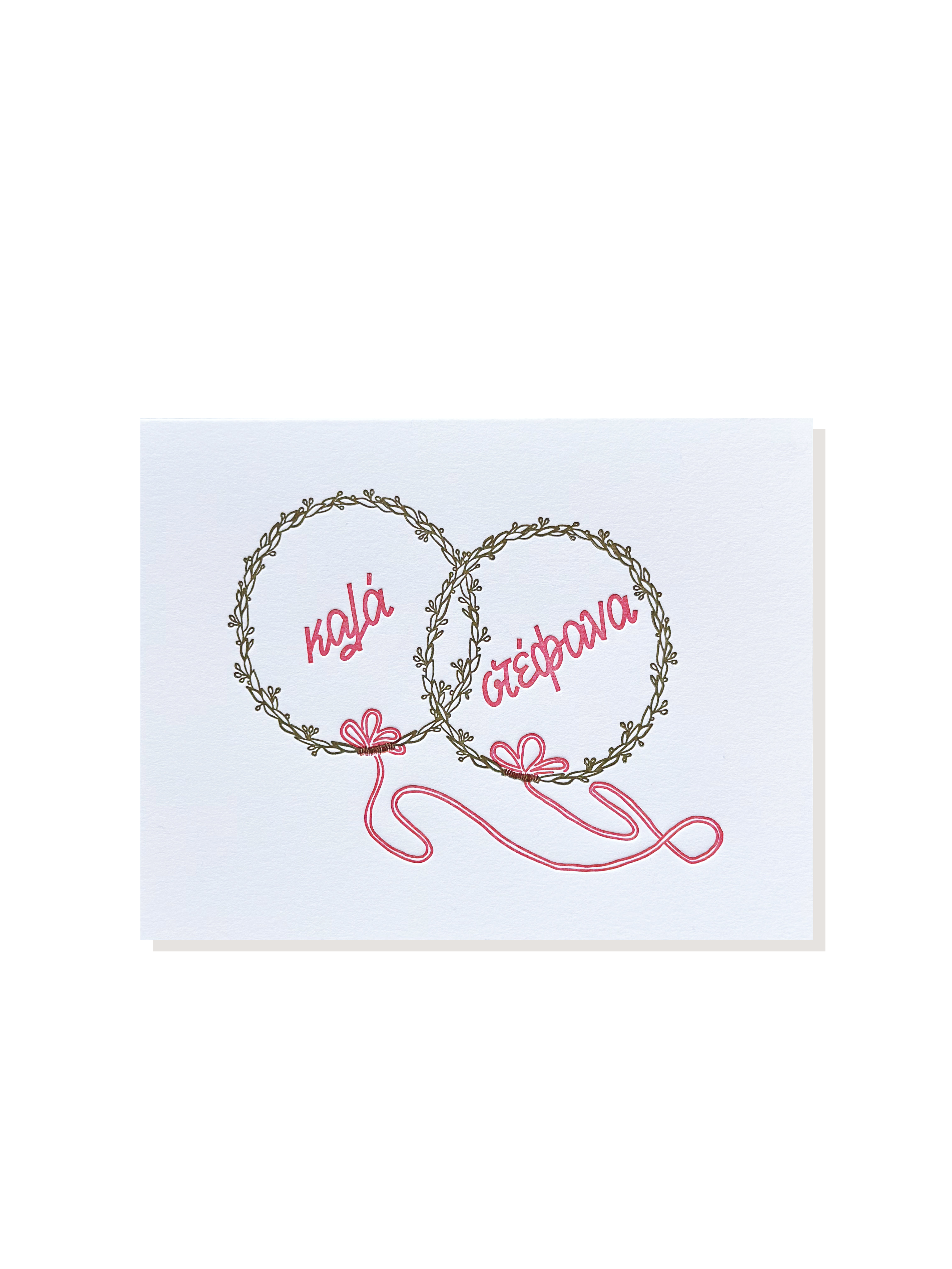 These stefana, or traditional Greek wedding crowns, signify the bond between the Bride and Groom and are worn during a Greek Orthodox wedding ceremony. Send your wedding wishes with this letterpress printed card!