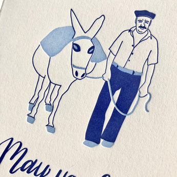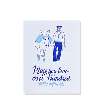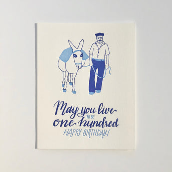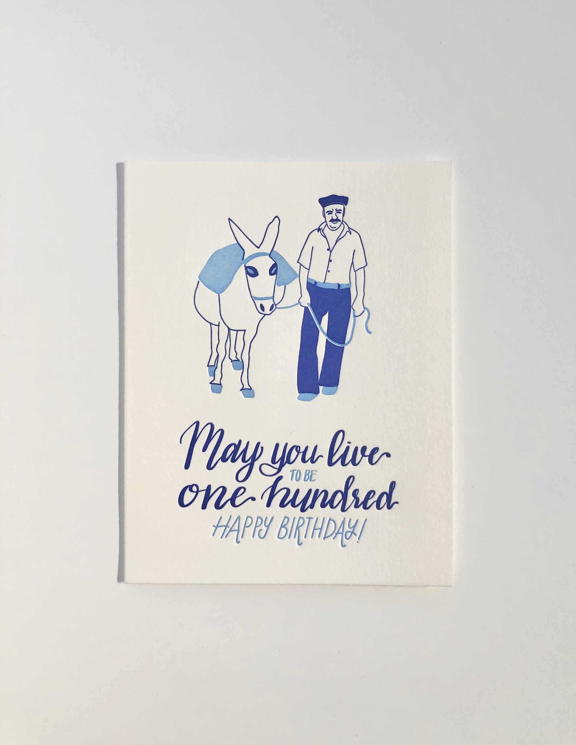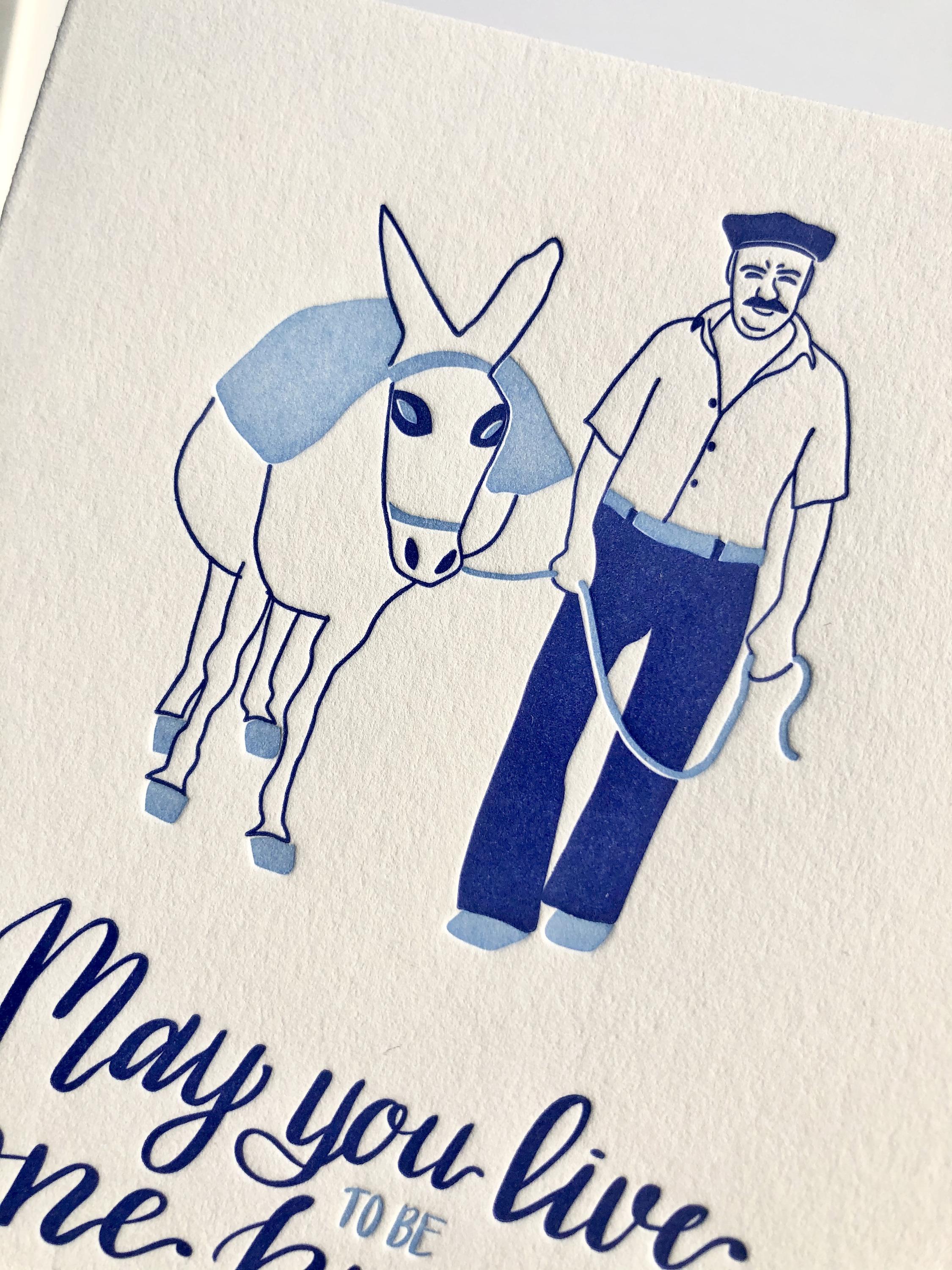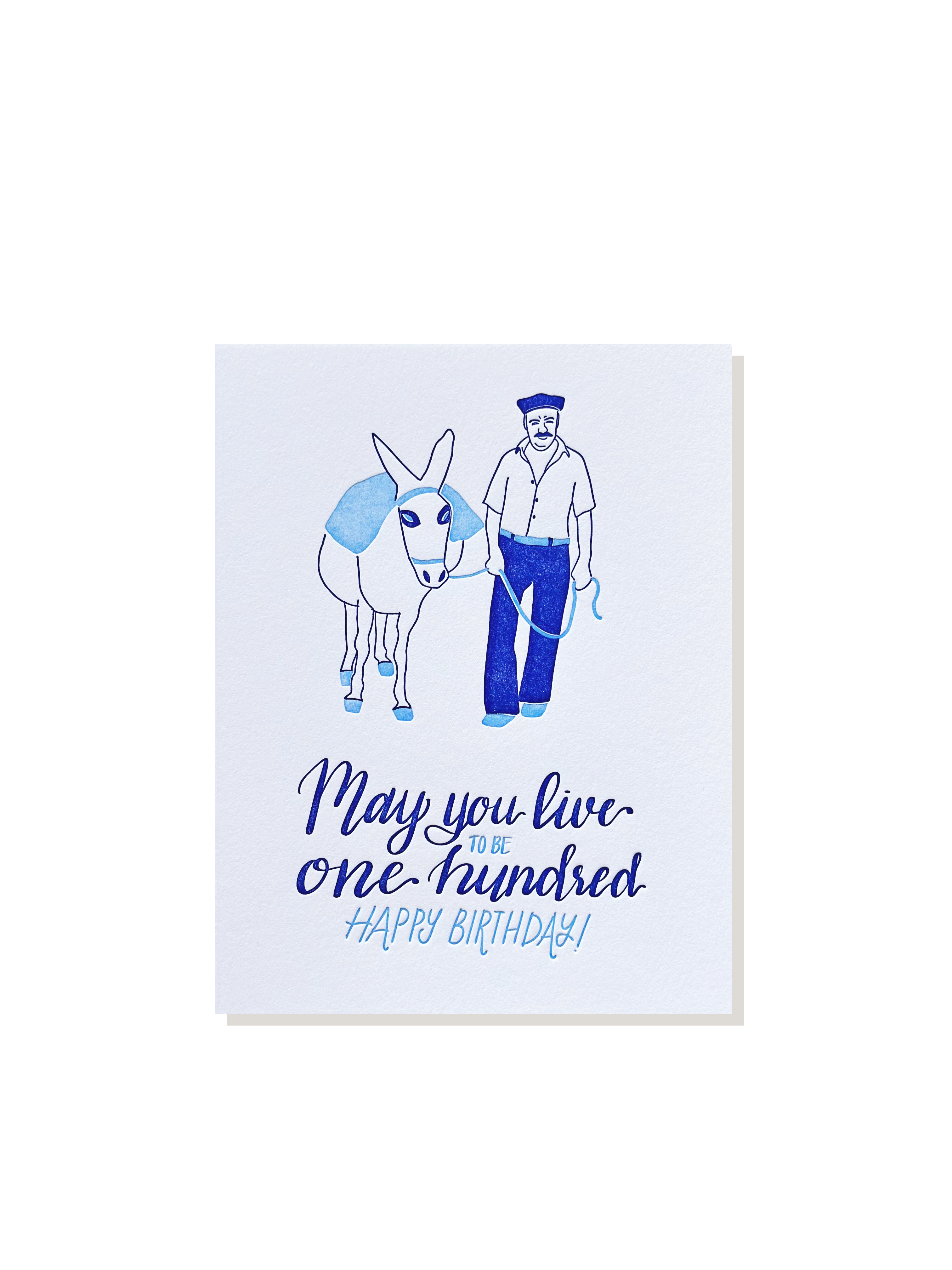 This letterpress printed greeting card features a hand-illustrated Greek farmer and his donkey. The text reads, "May you live to be one hundred" a translation of the Greek saying you would tell someone on their birthday, "να τα εκατοστήσεις."