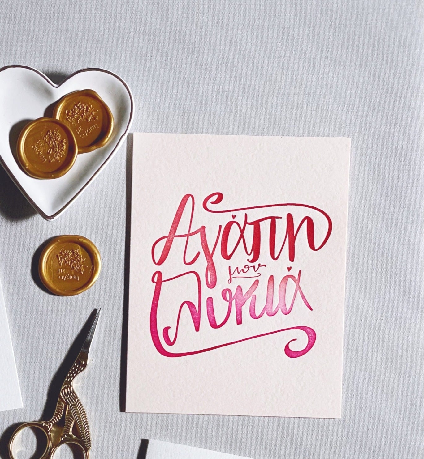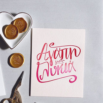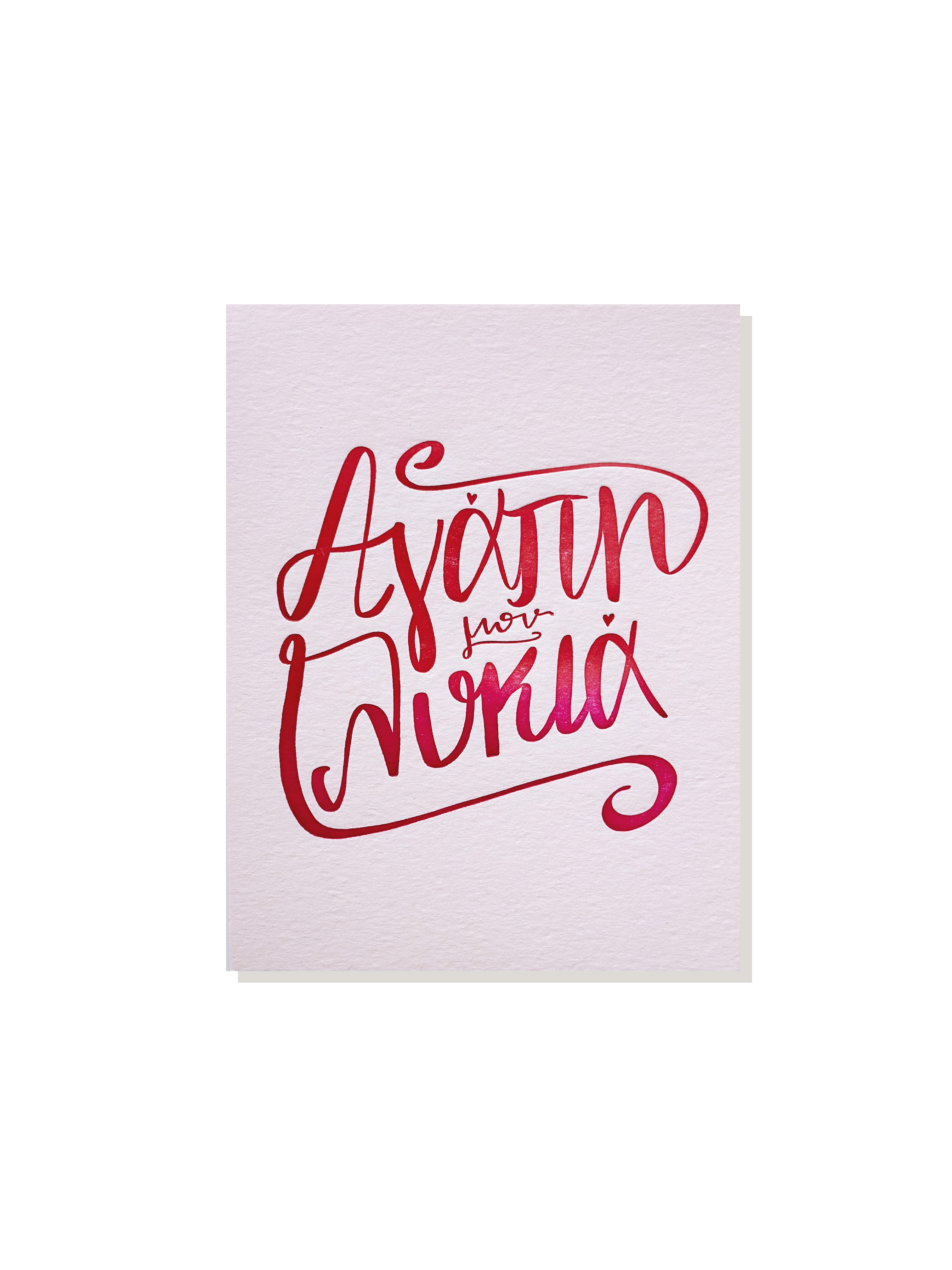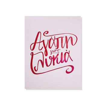 Αγαπη μου Γλυκια (My Sweet Love) greeting card in Greek. This letterpress printed phrase will help express your sweetest love. This card was hand lettered and hand printed using a split fountain inking method (ombre) on an antique printing press.