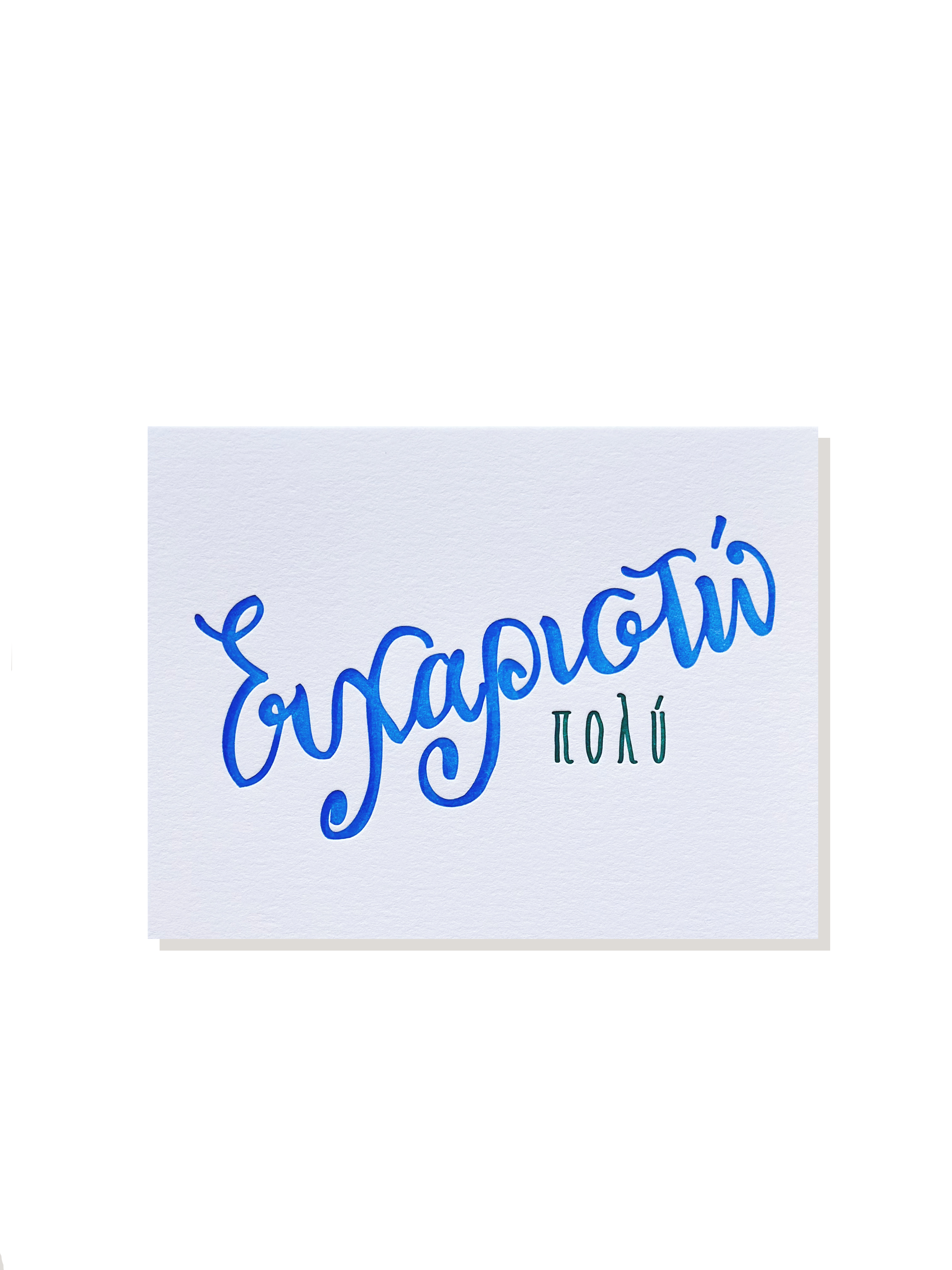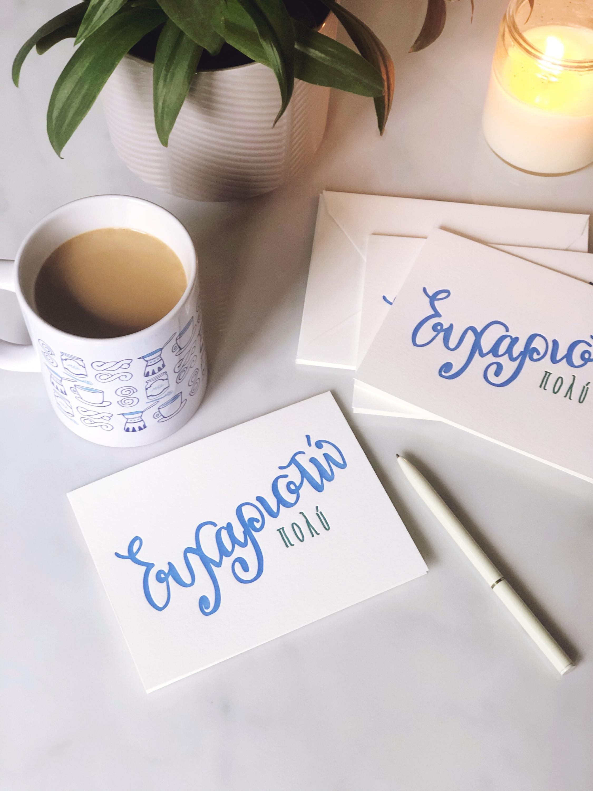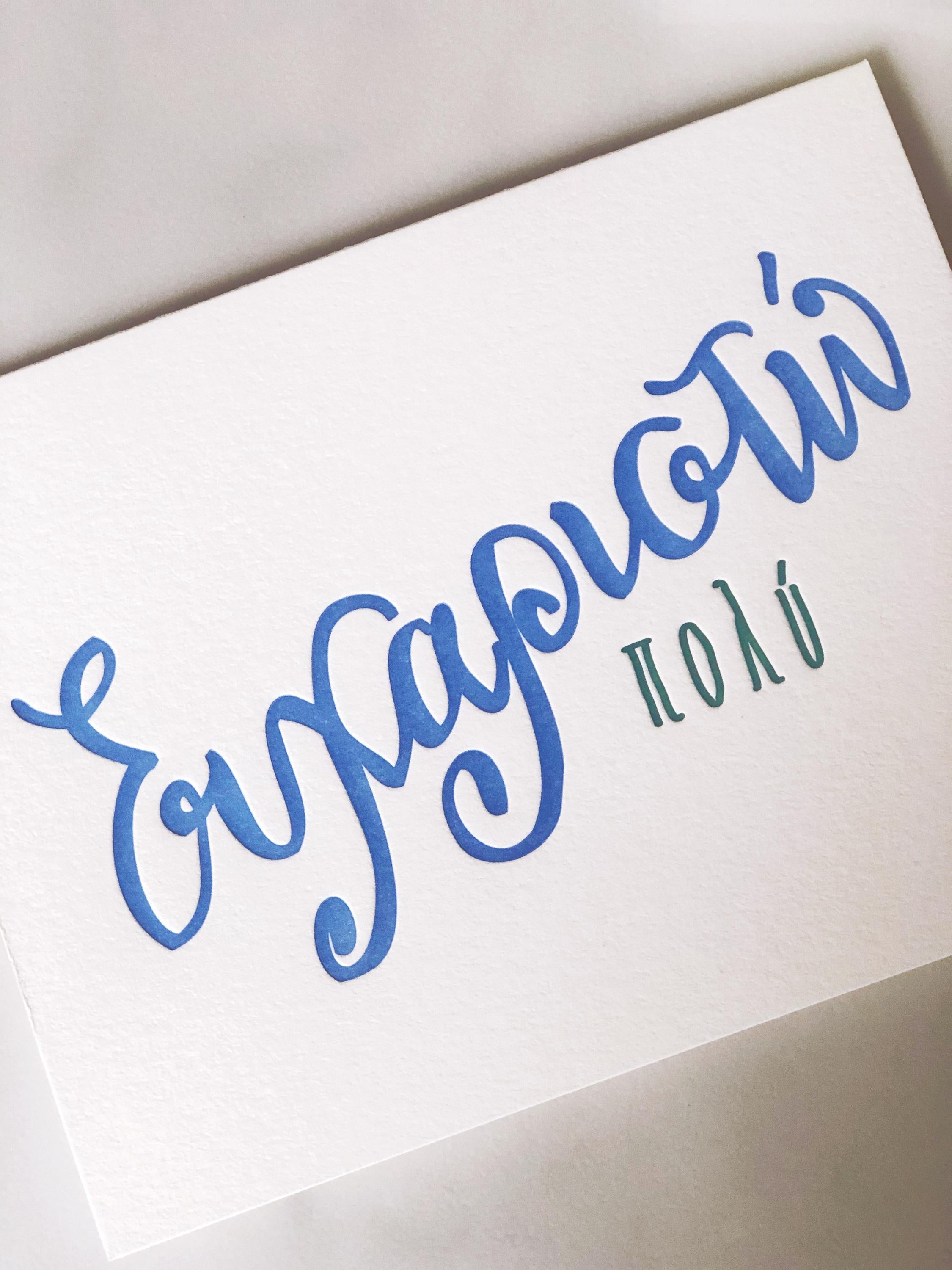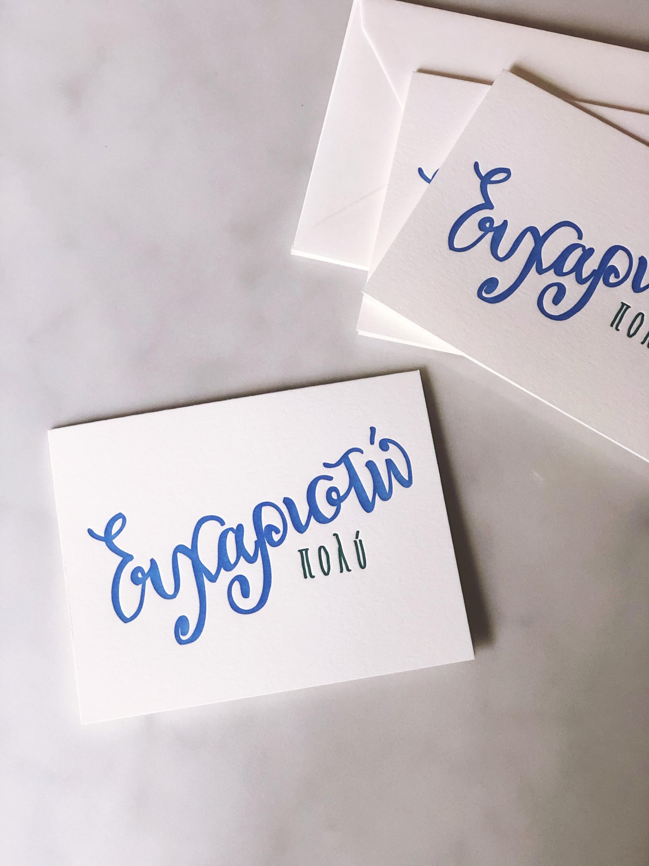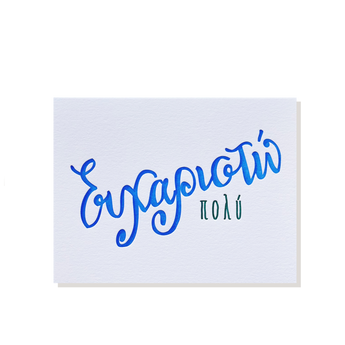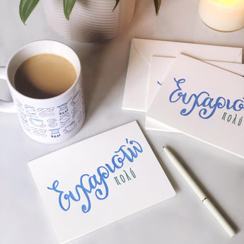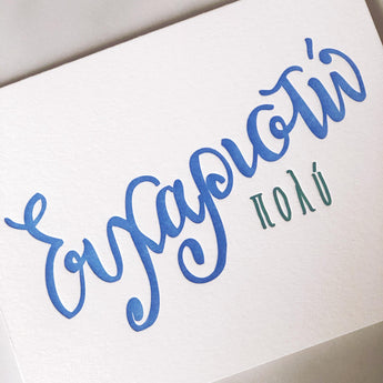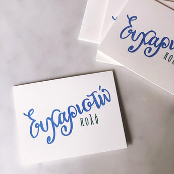 Simple and straight to the point - say "Ευχαριστω πολυ" or "Thanks a lot" with these letterpress printed, hand-lettered Thank You cards in Greek.