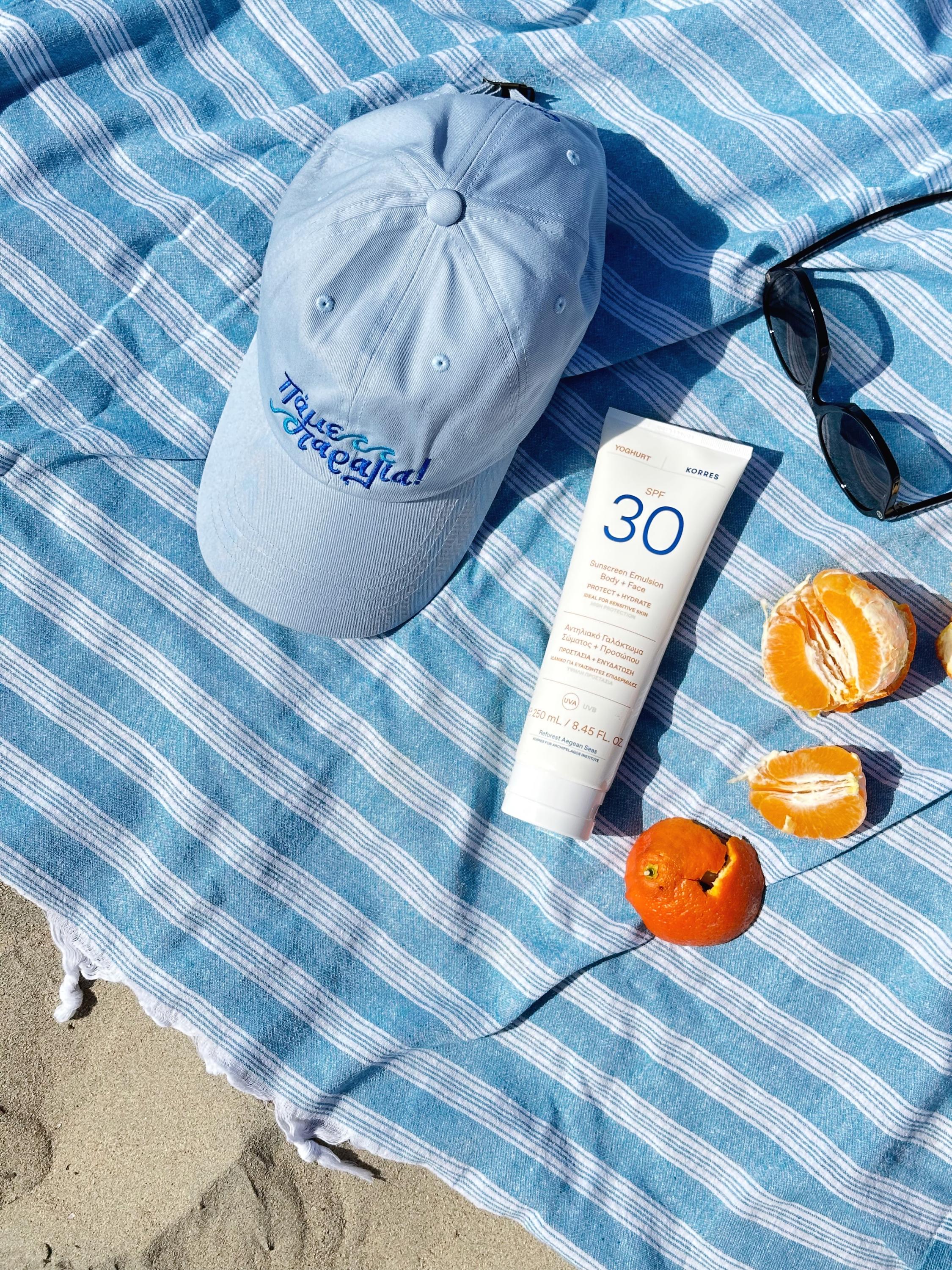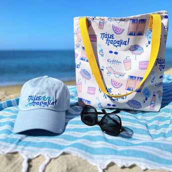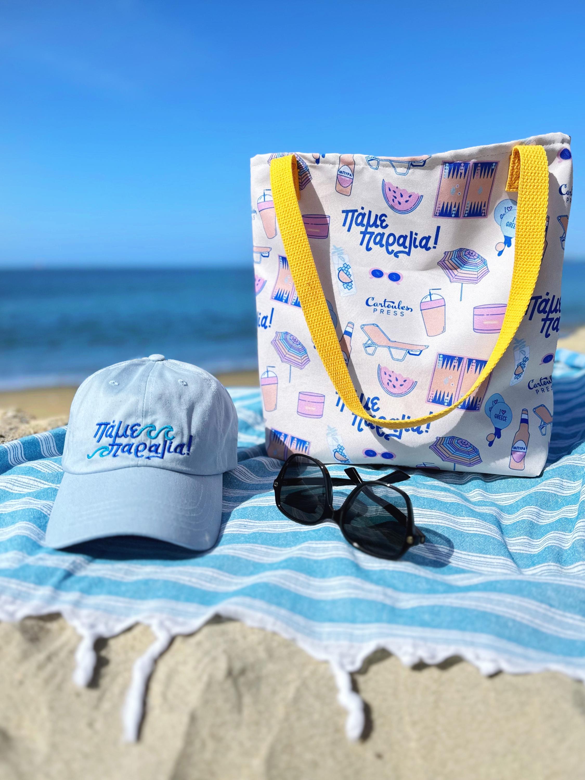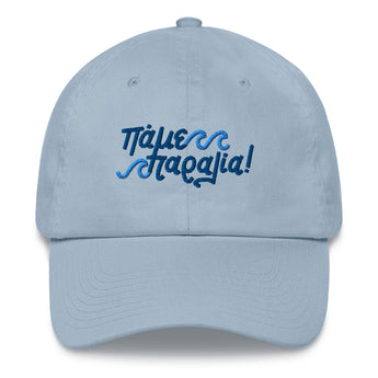 Let's go to the beach! This cap will protect you from the sun and provide ample shade. It features original hand-lettered text that reads in Greek, "Let's go to the beach!" by Cartoules Press. Youth size available as well here.