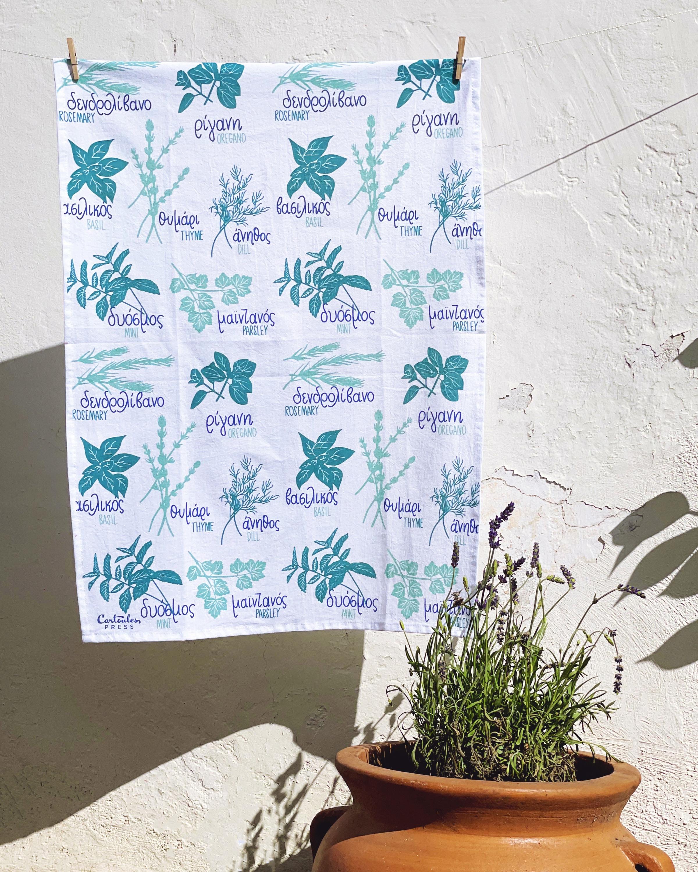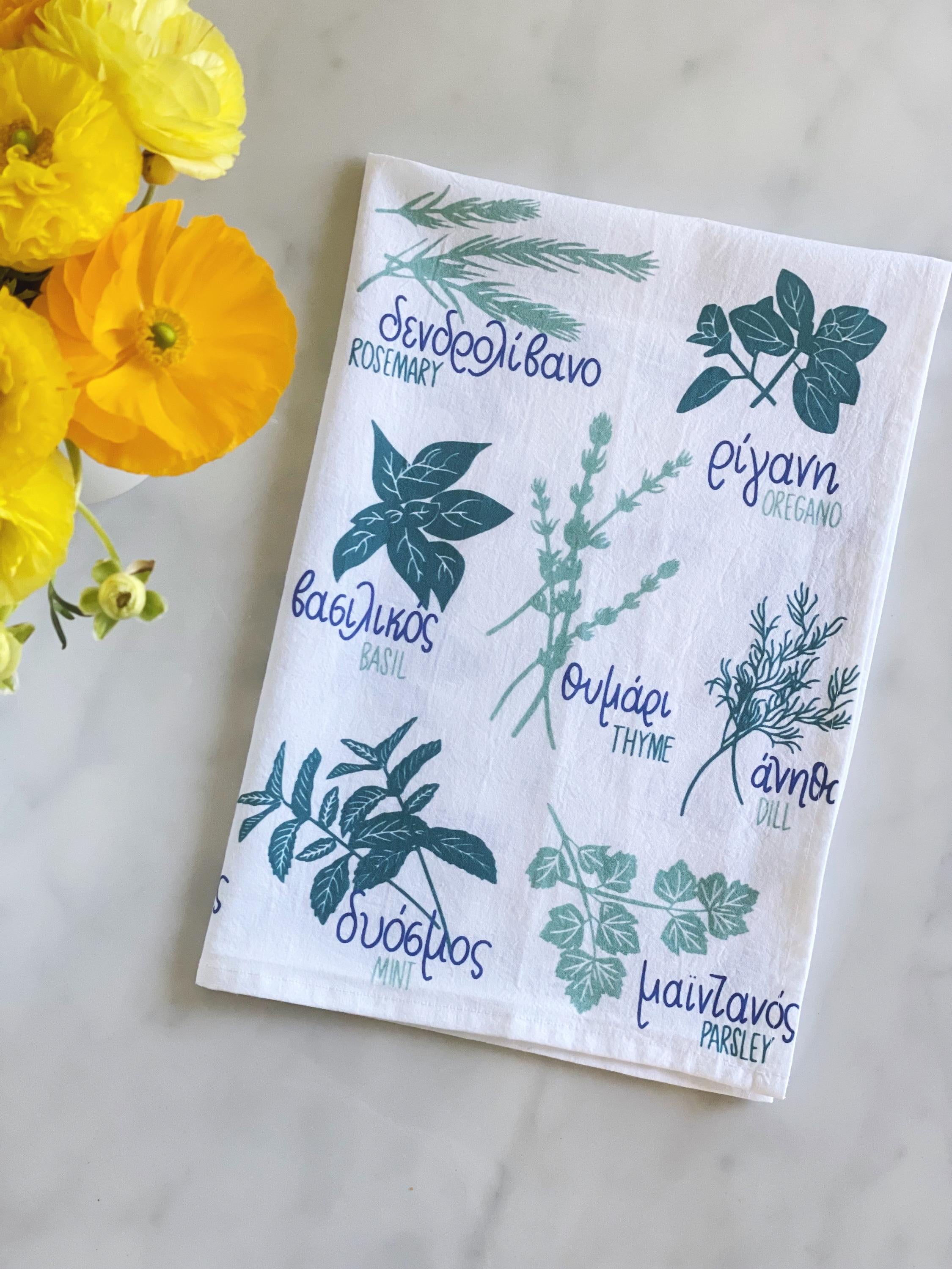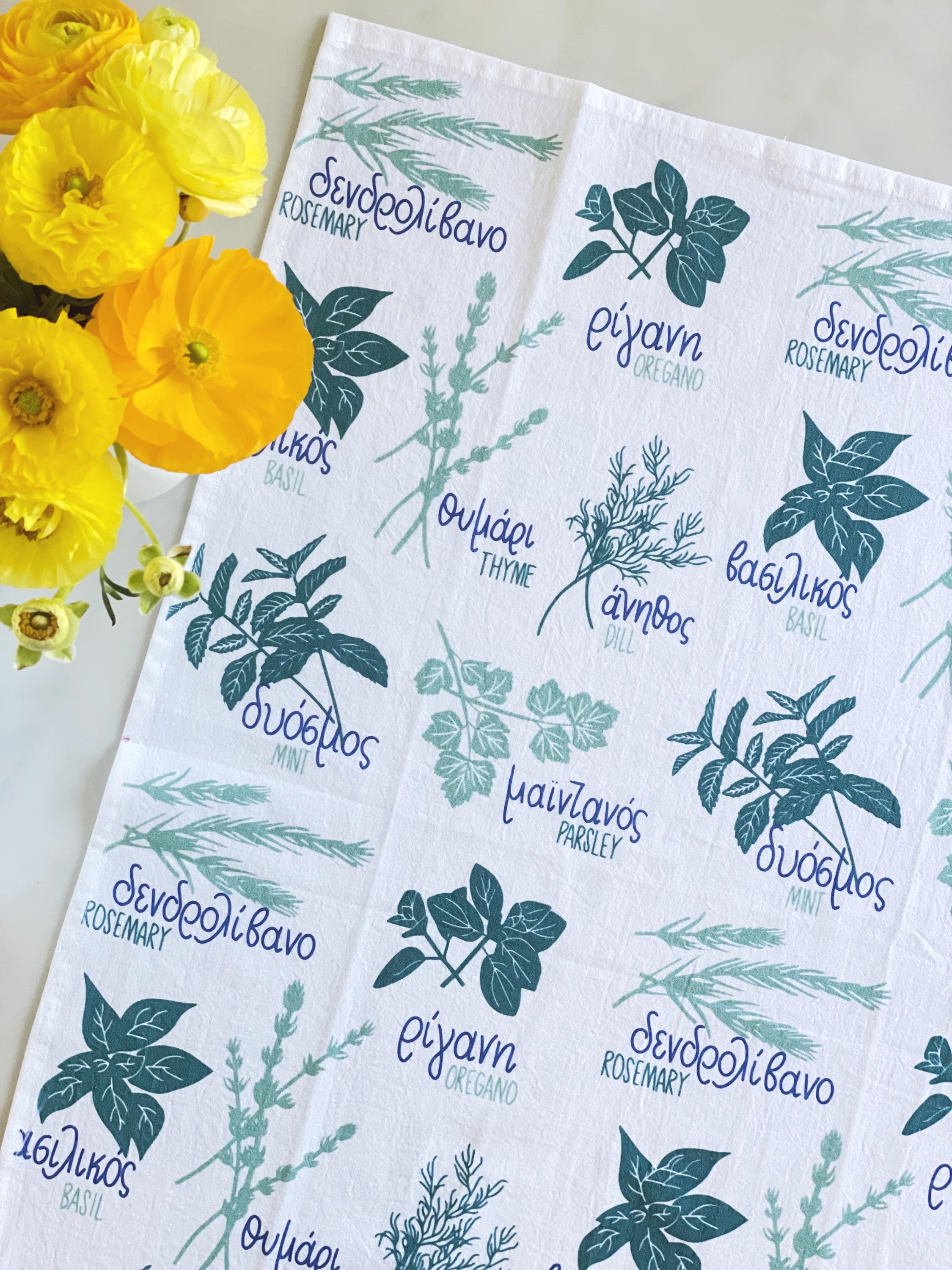 Greek cuisine is flavored with an abundance of herbs. Reference them on this tea towel in your kitchen, and it doubles as decor too!