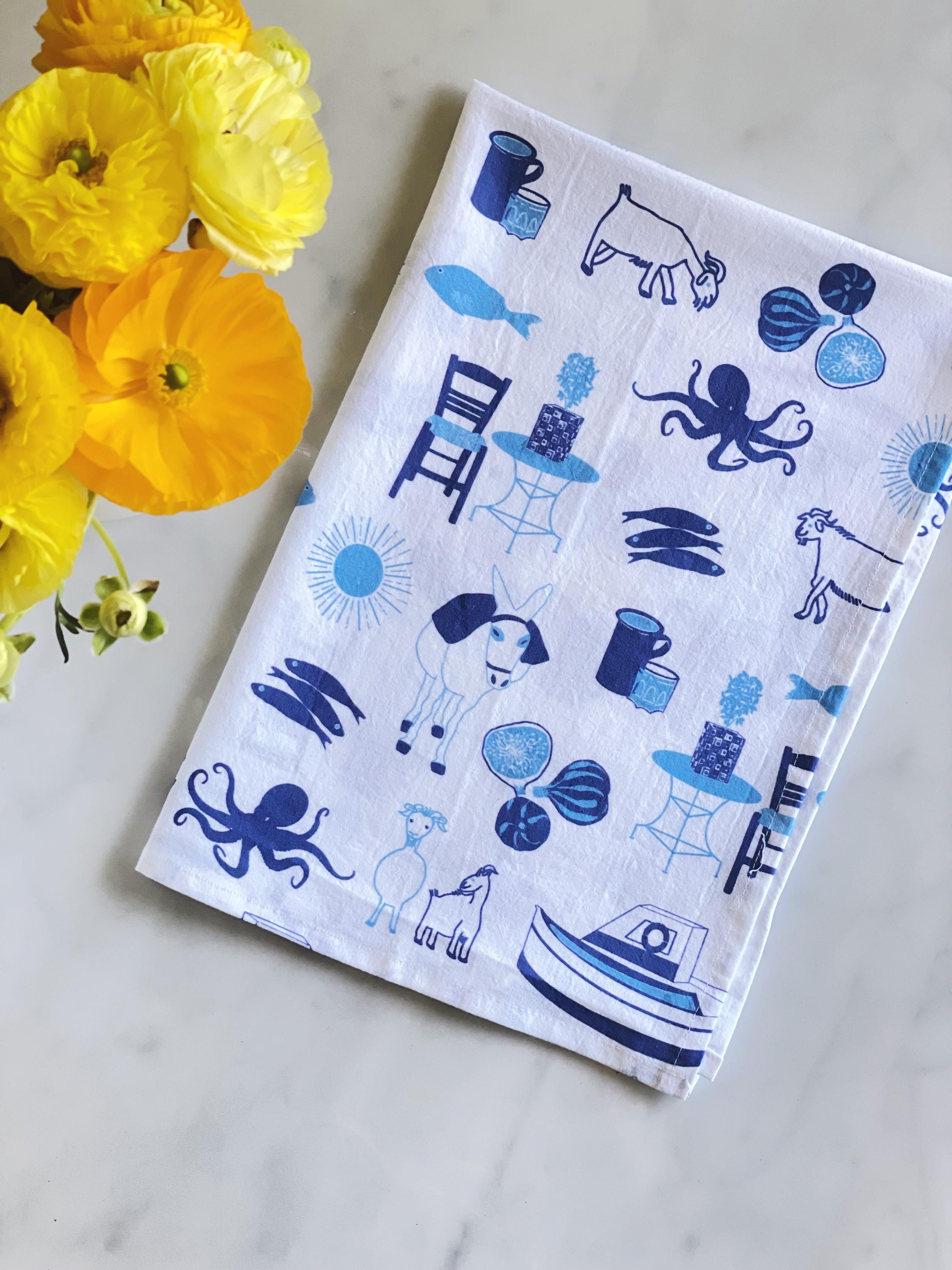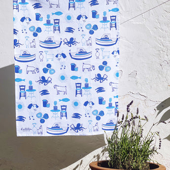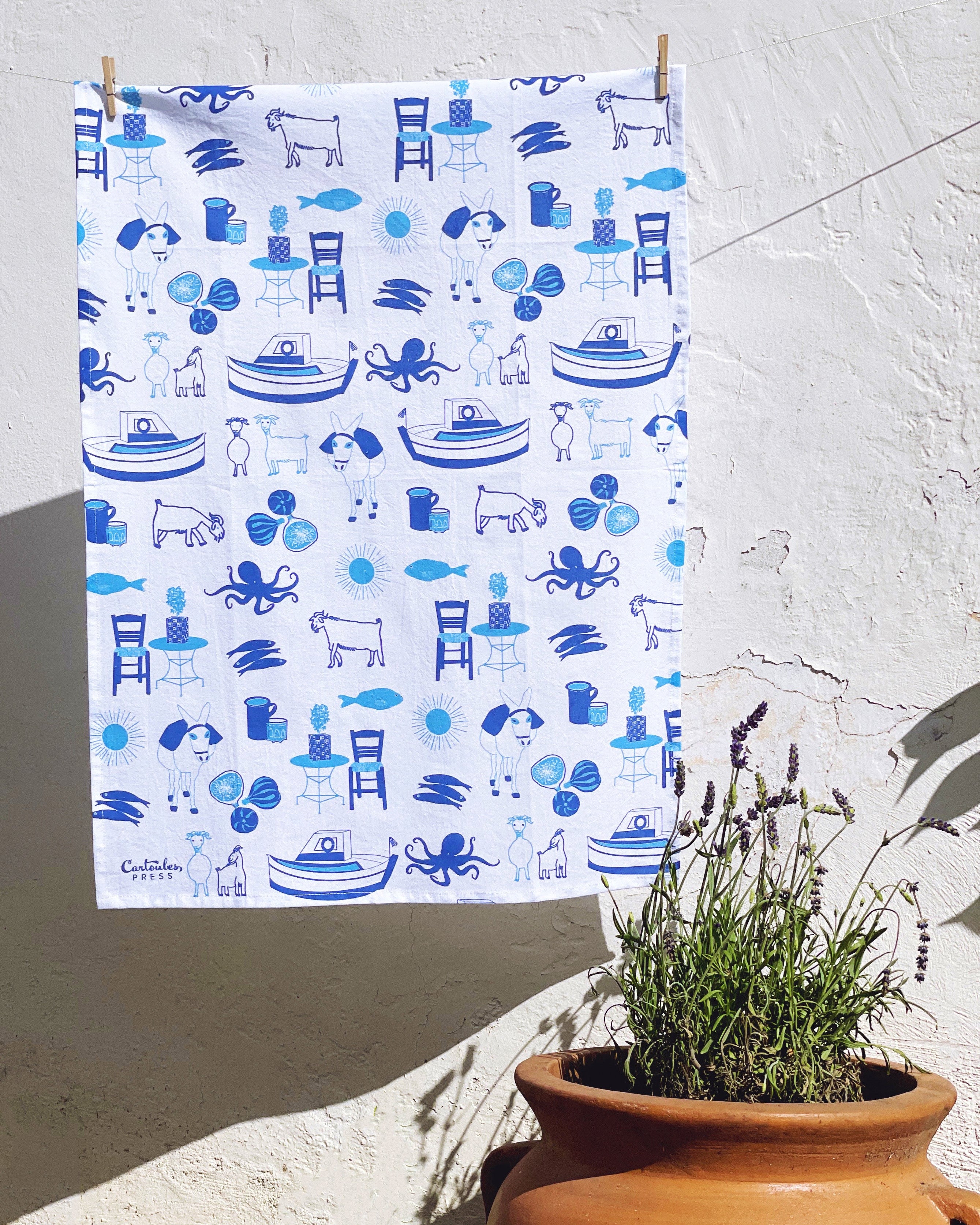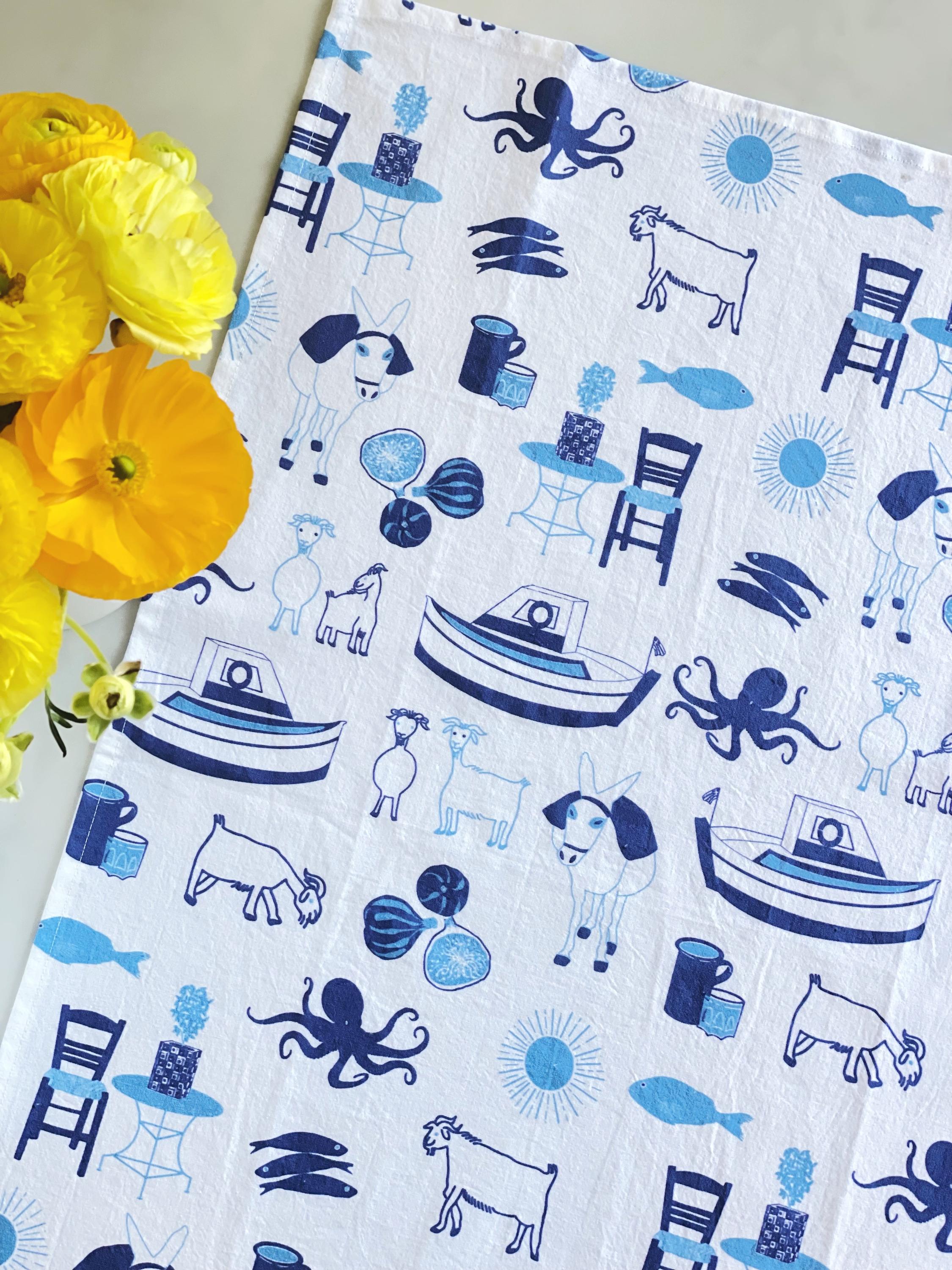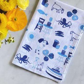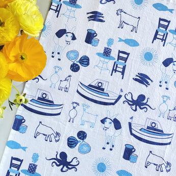 Decorate your kitchen with this tea towel, which features hand-illustrated elements of a summer in Greece by Cartoules Press. Images include a greek fishing boat, goats, donkey, figs, octopus, fish, iconic greek cafe chair and table, greek wine carafe.