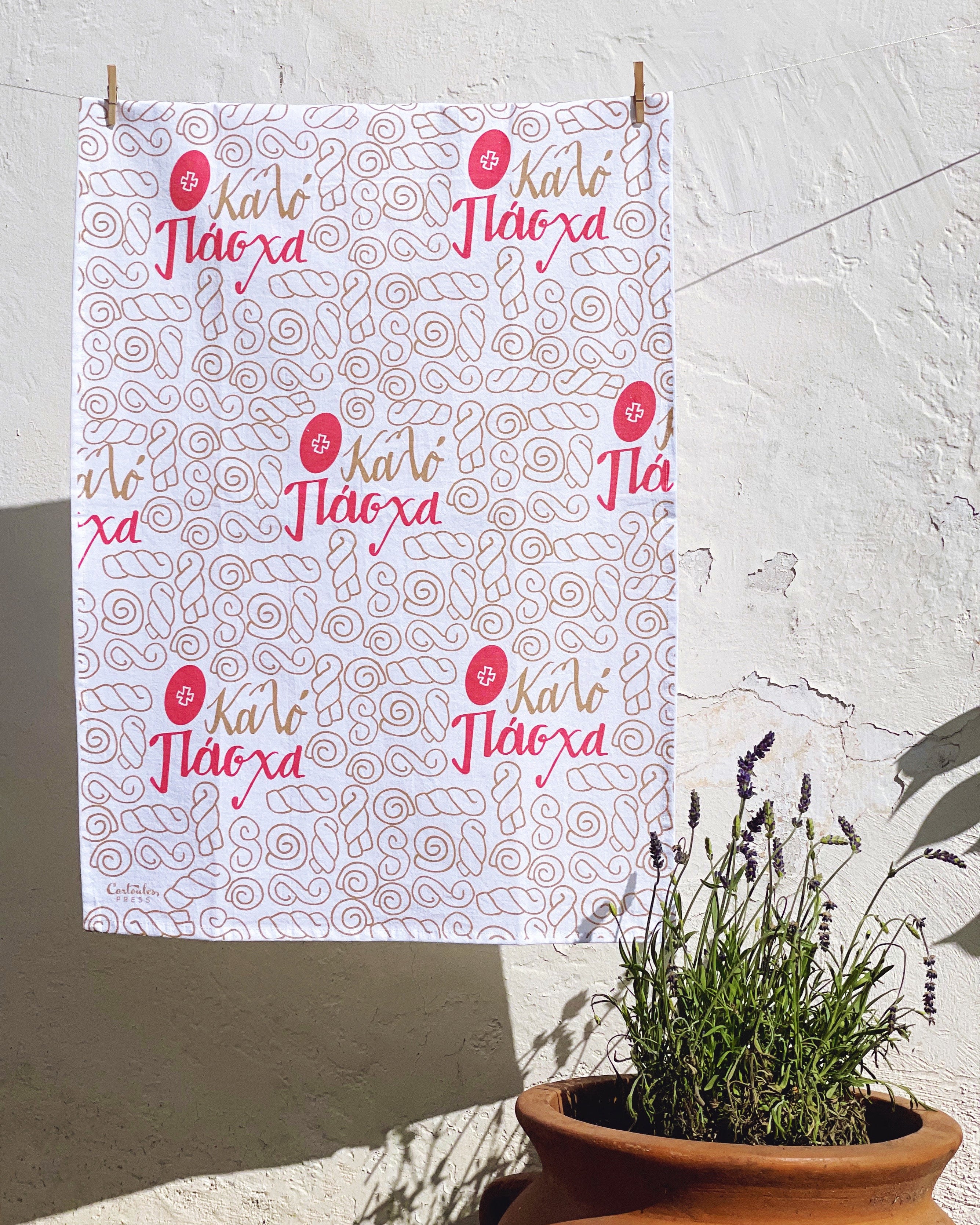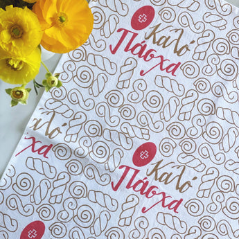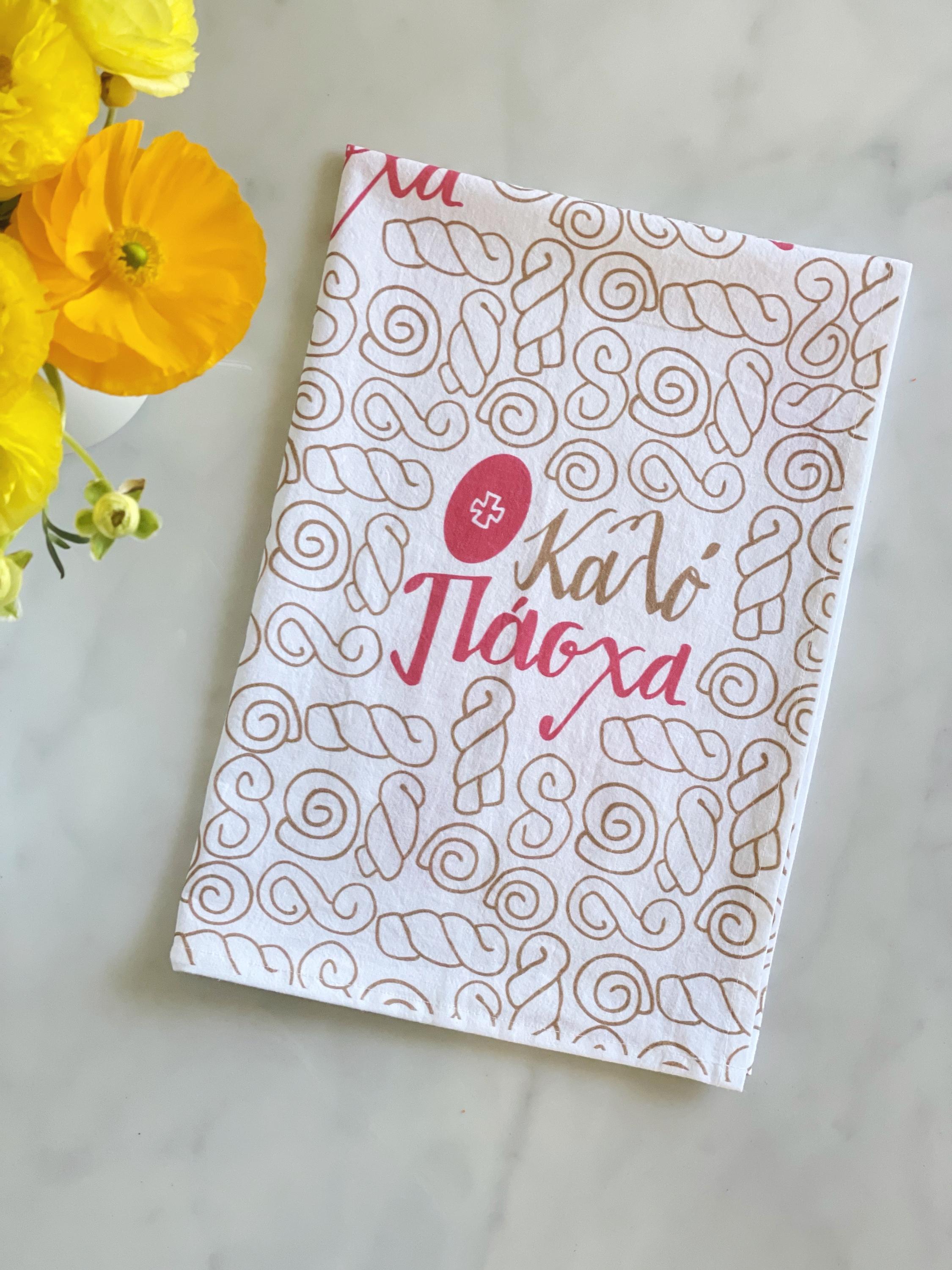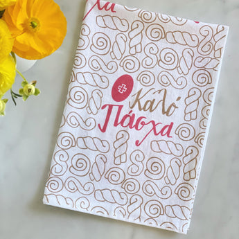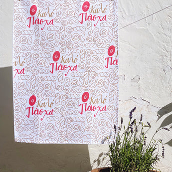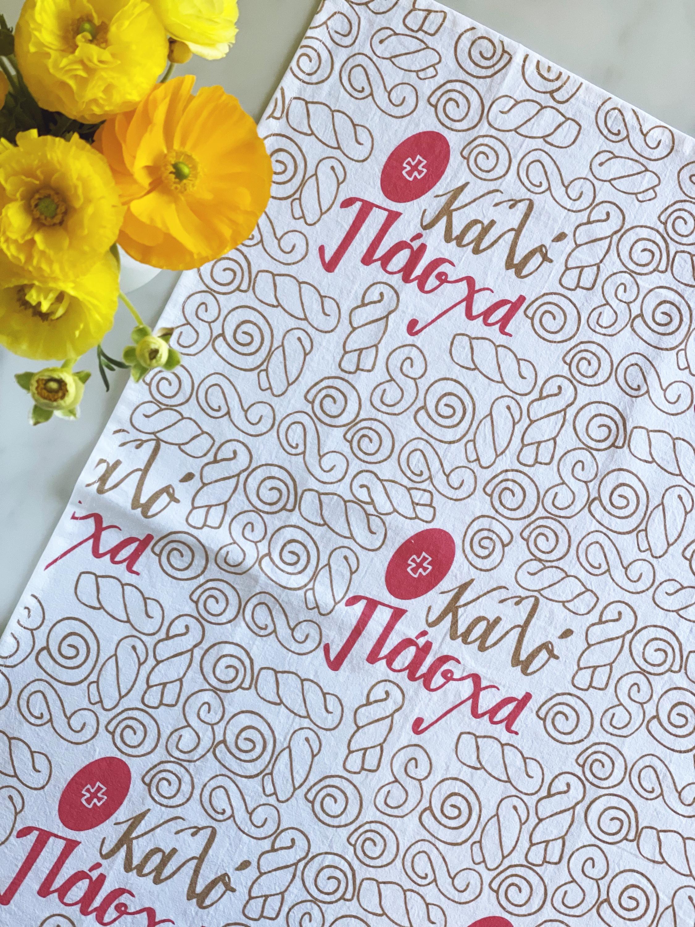 Decorate your kitchen with this festive Easter tea towel, which features the traditional koulourakia (pasxa butter cookies) and deep red eggs.