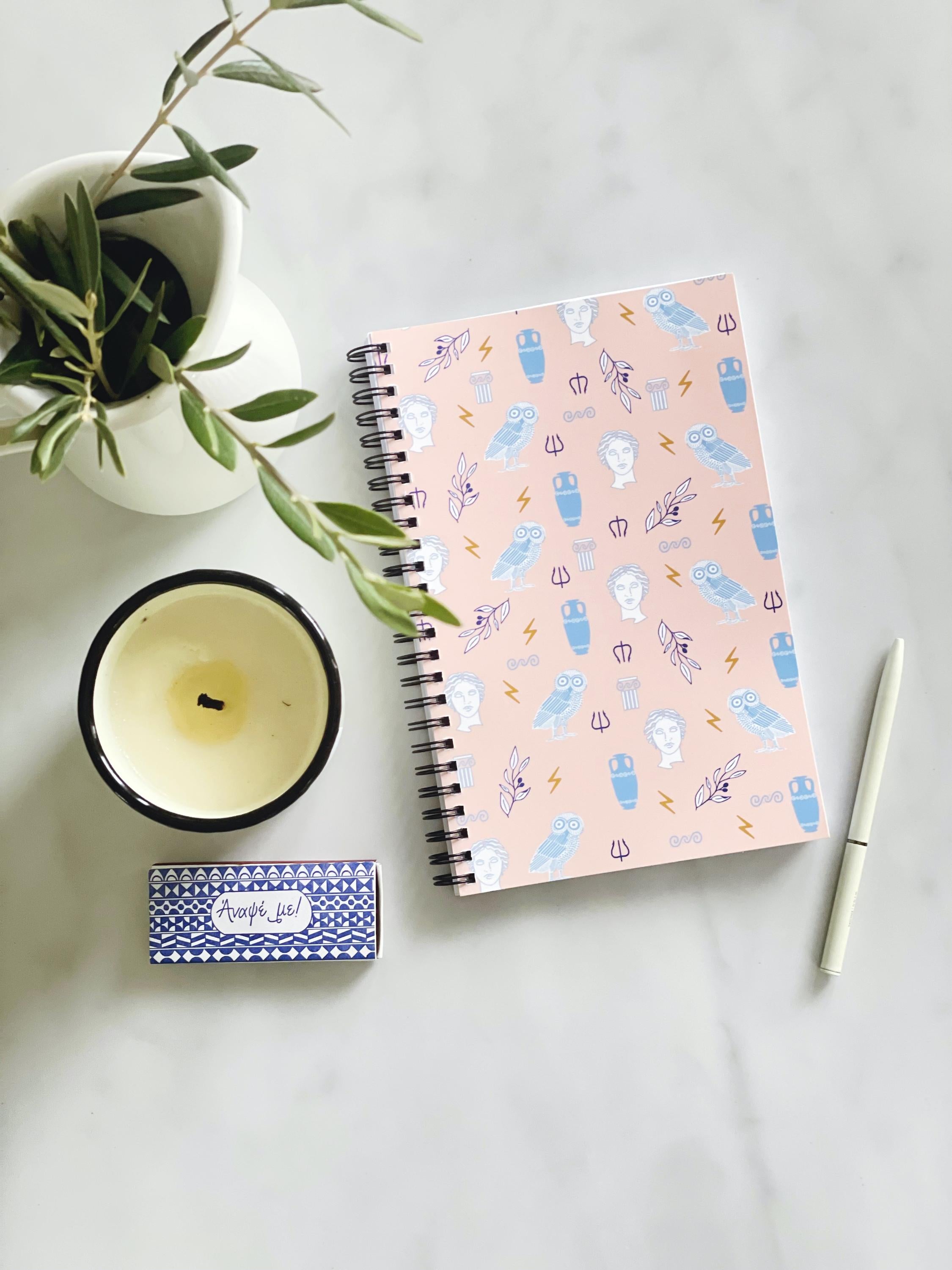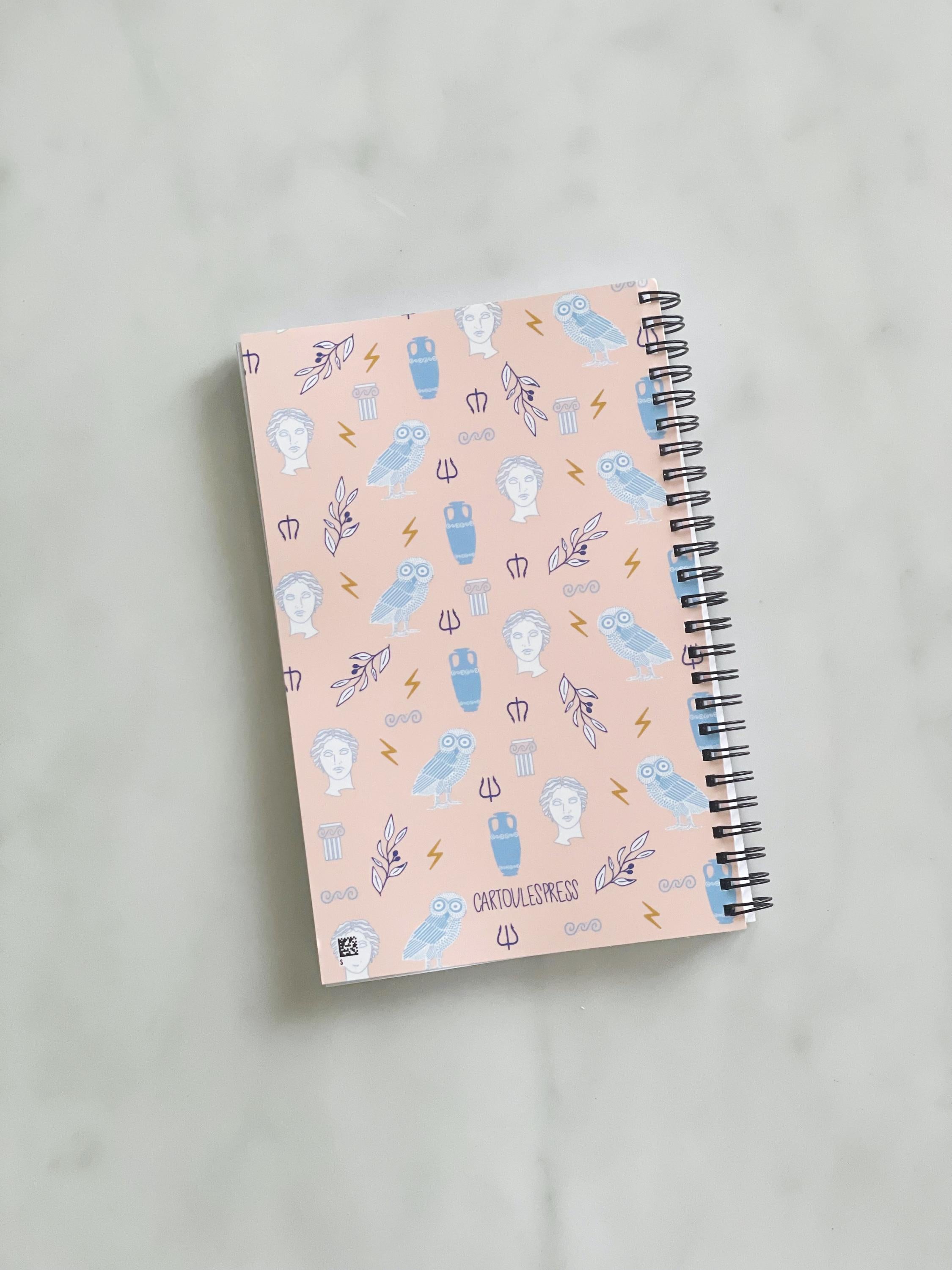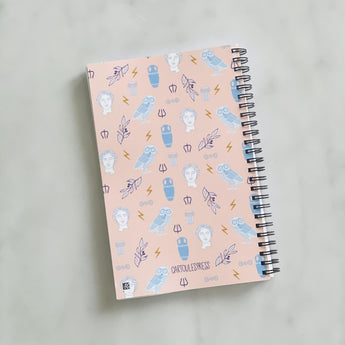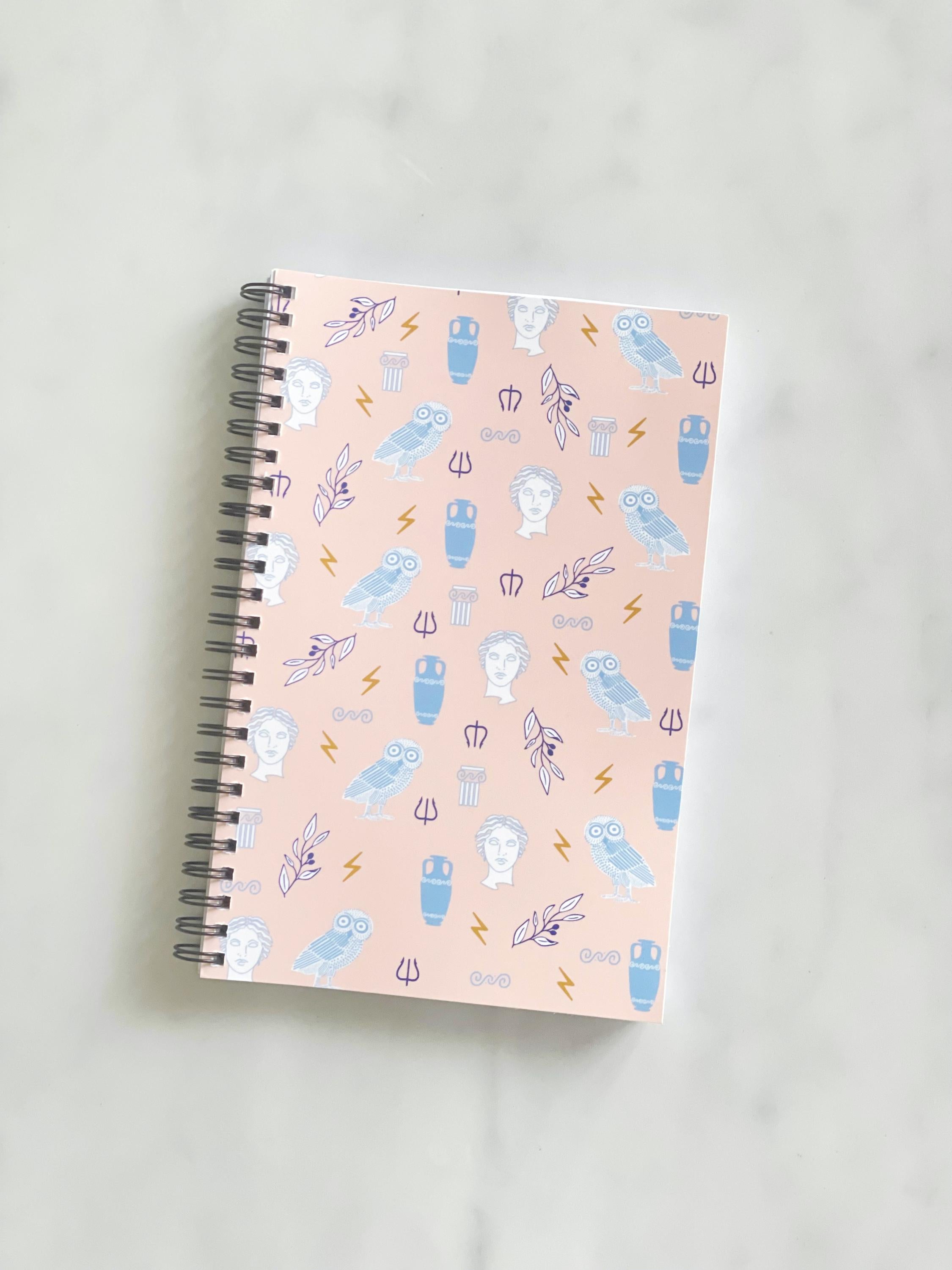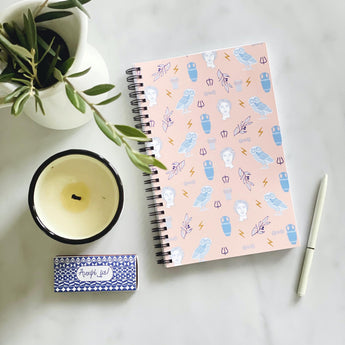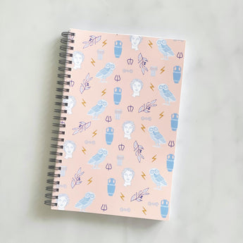 Write down ideas, or list future dreams with our Ancient Greek Symbols Journal. This wire-bound, bullet journal features hand-illustrated ancient Greek symbols by Cartoules Press. They include an ancient Greek statue bust, a Greek column, an olive branch, the Athenian owl, an amphora, Zeus' lightning bolt, and Poseidon's trident.