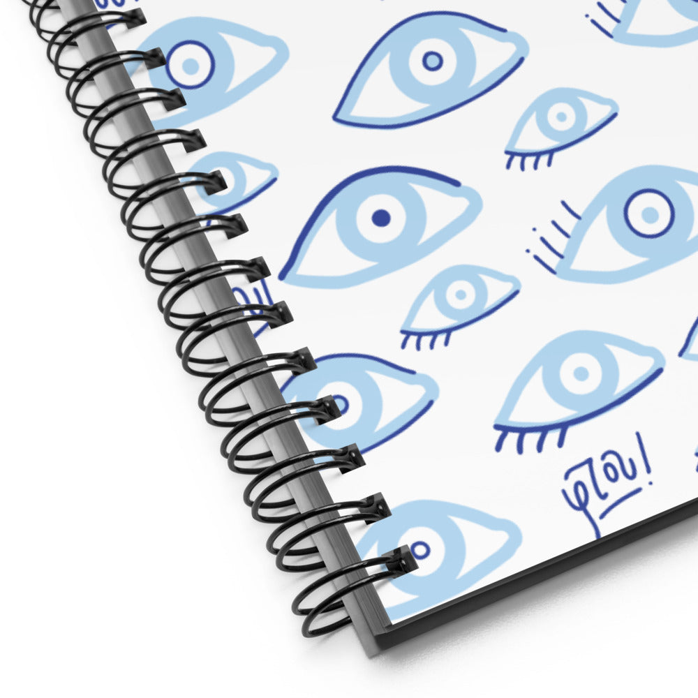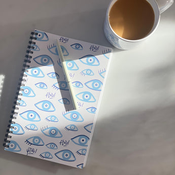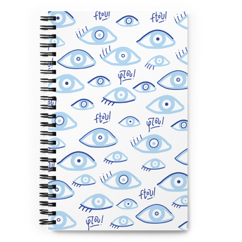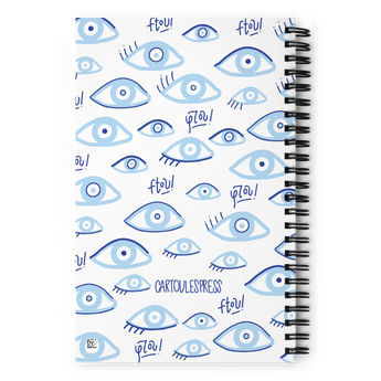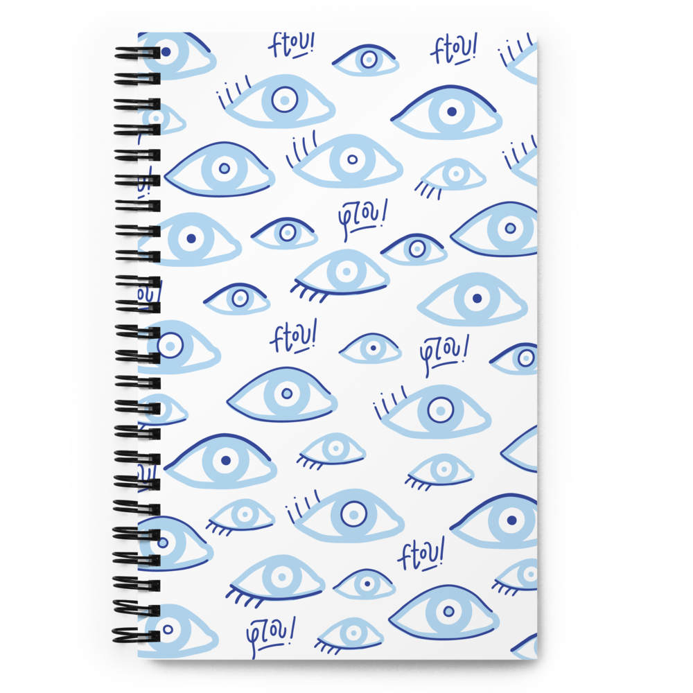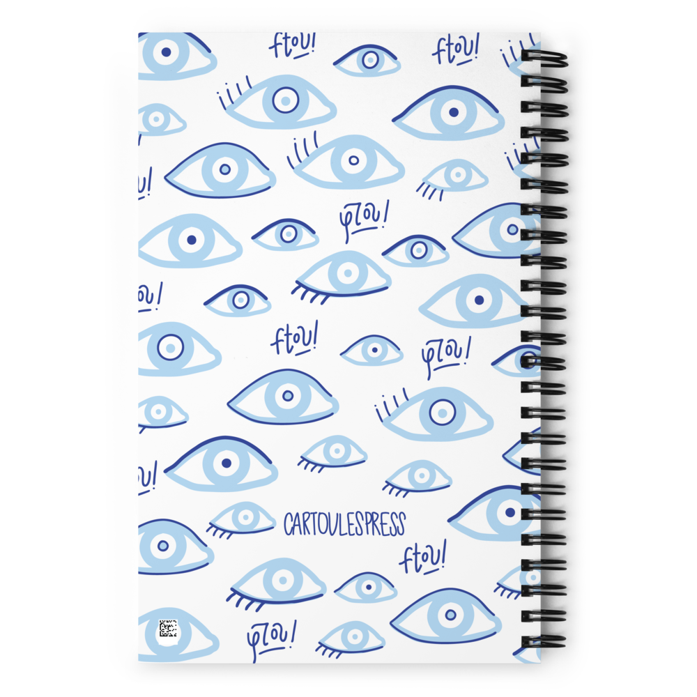 Write down ideas, or list future dreams with this Mati Journal. This design features hand-illustrated matakia, or evil eyes, to ward away misfortune. All elements are hand-lettered by Cartoules Press. The text reads "ftou!" - an onomatopoeic word. The sound of spitting is used by Greeks to ward off the evil eye.