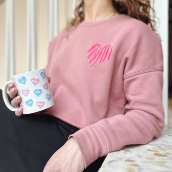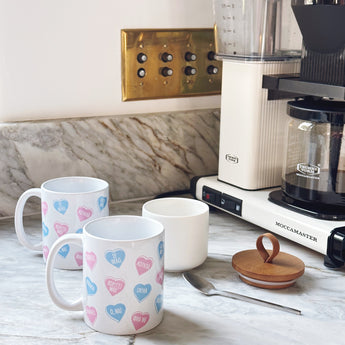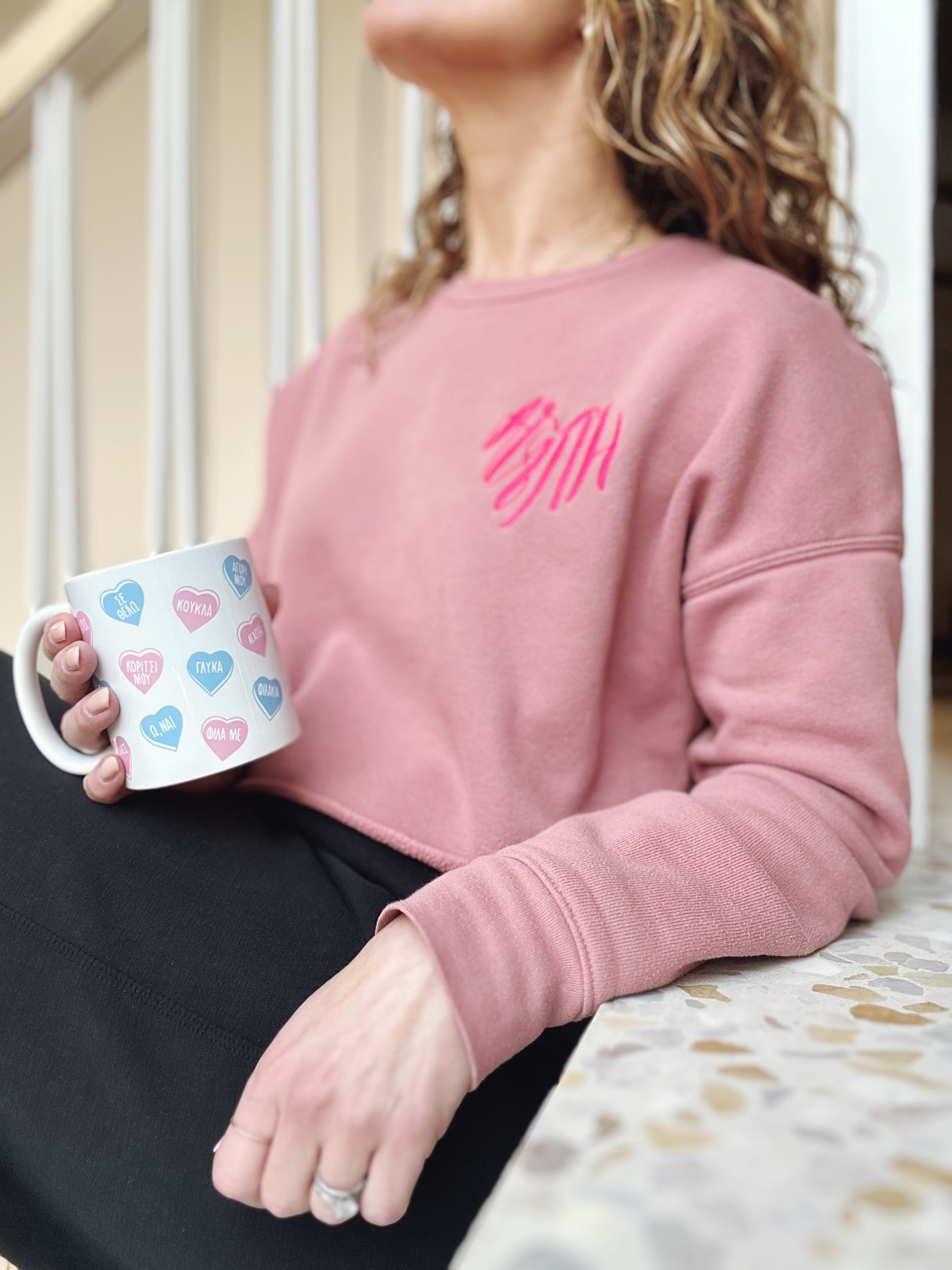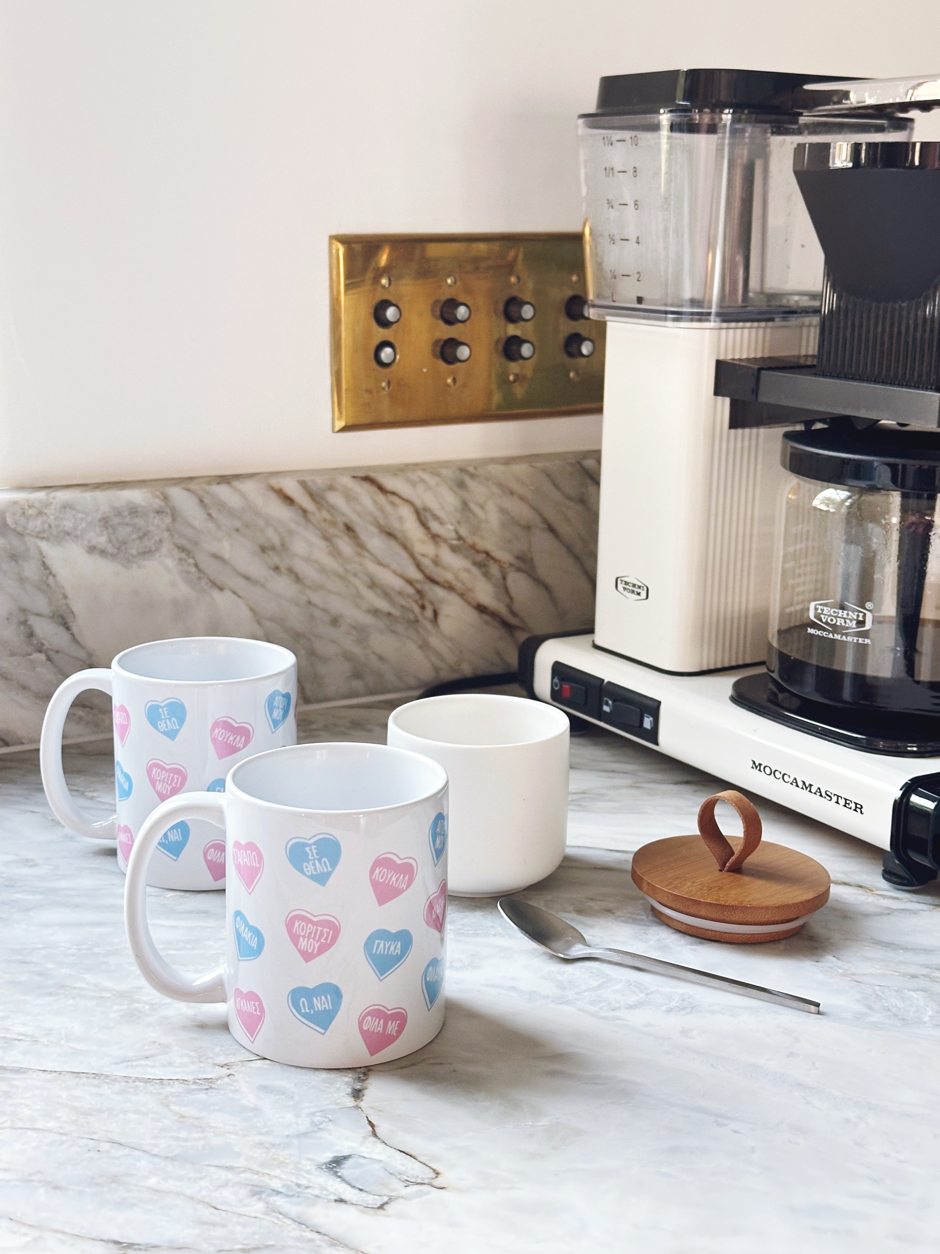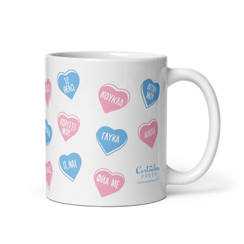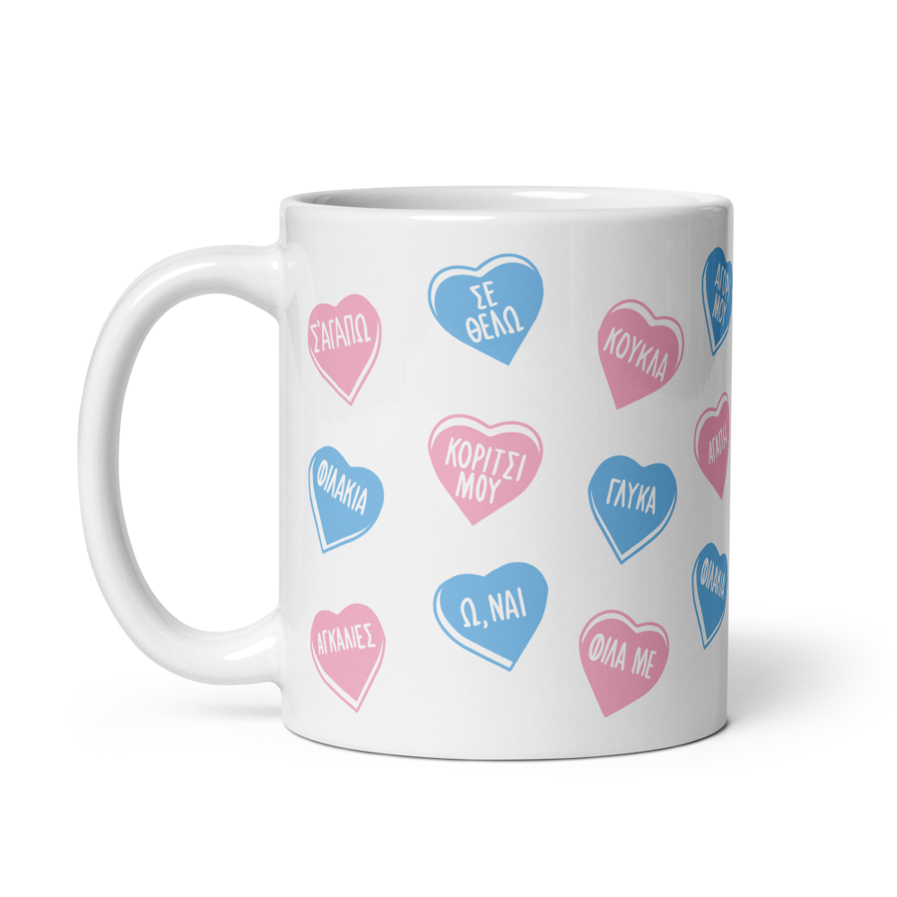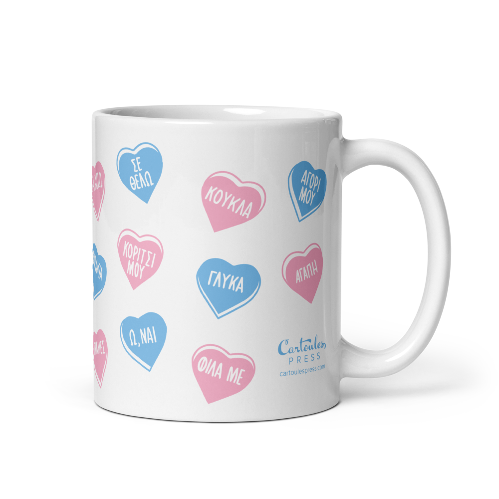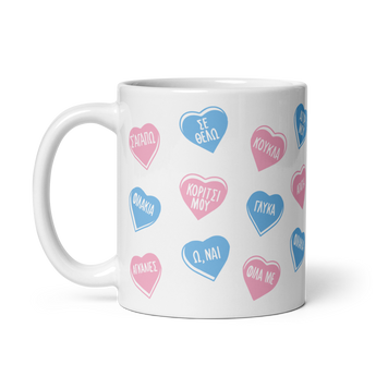 Gift the coffee lover this ceramic mug featuring fun little Greek sayings designed like heart candy! The sayings read: I love you, I want you, sweet, kisses, kiss me, hugs, my girl, my boy, pretty/doll, love, and o, yes
