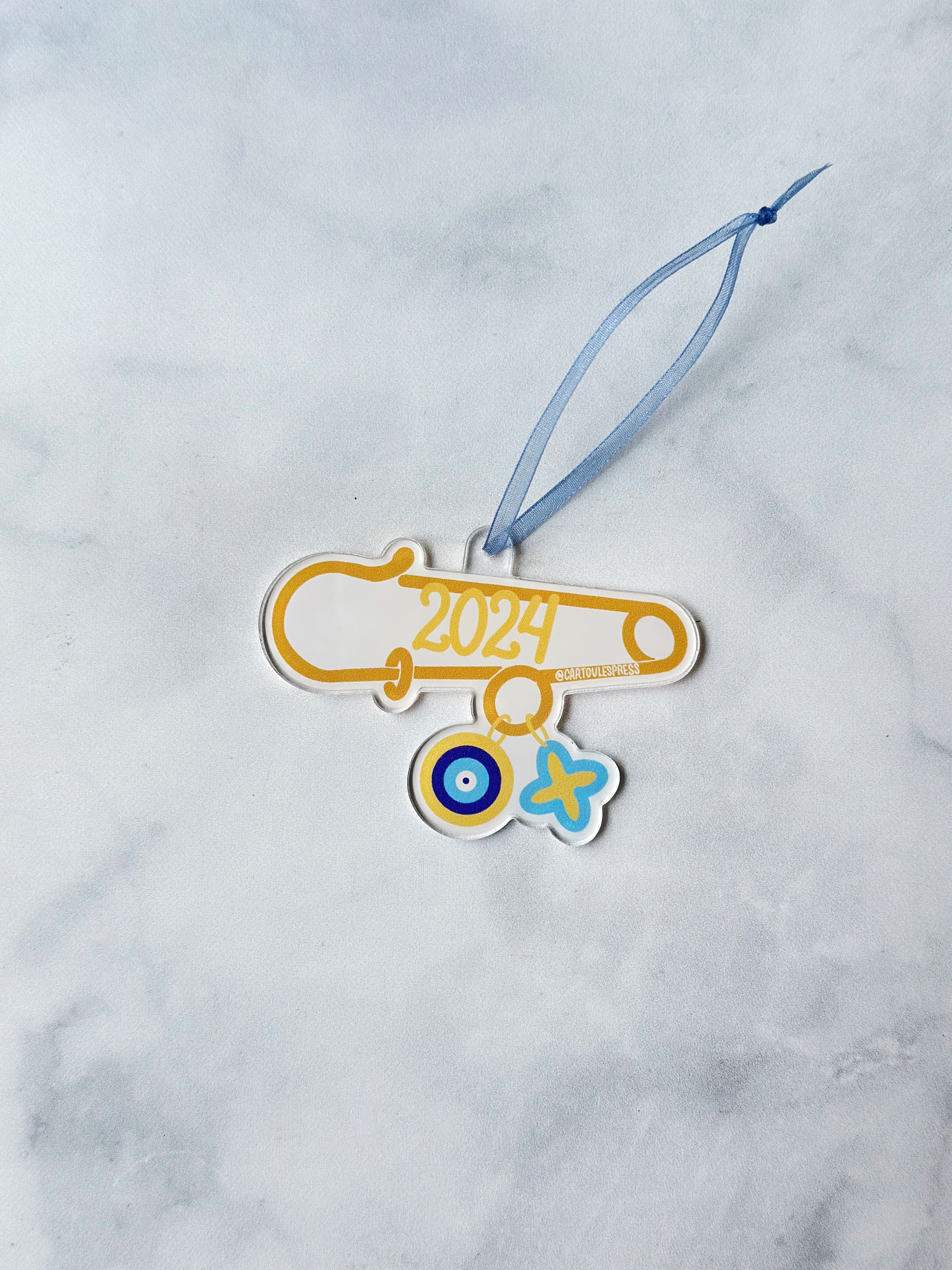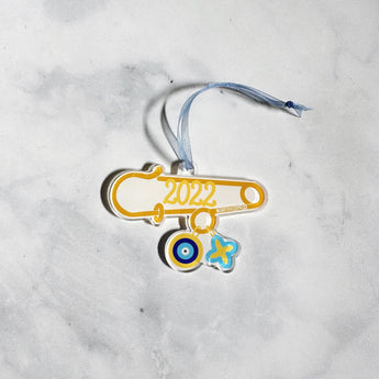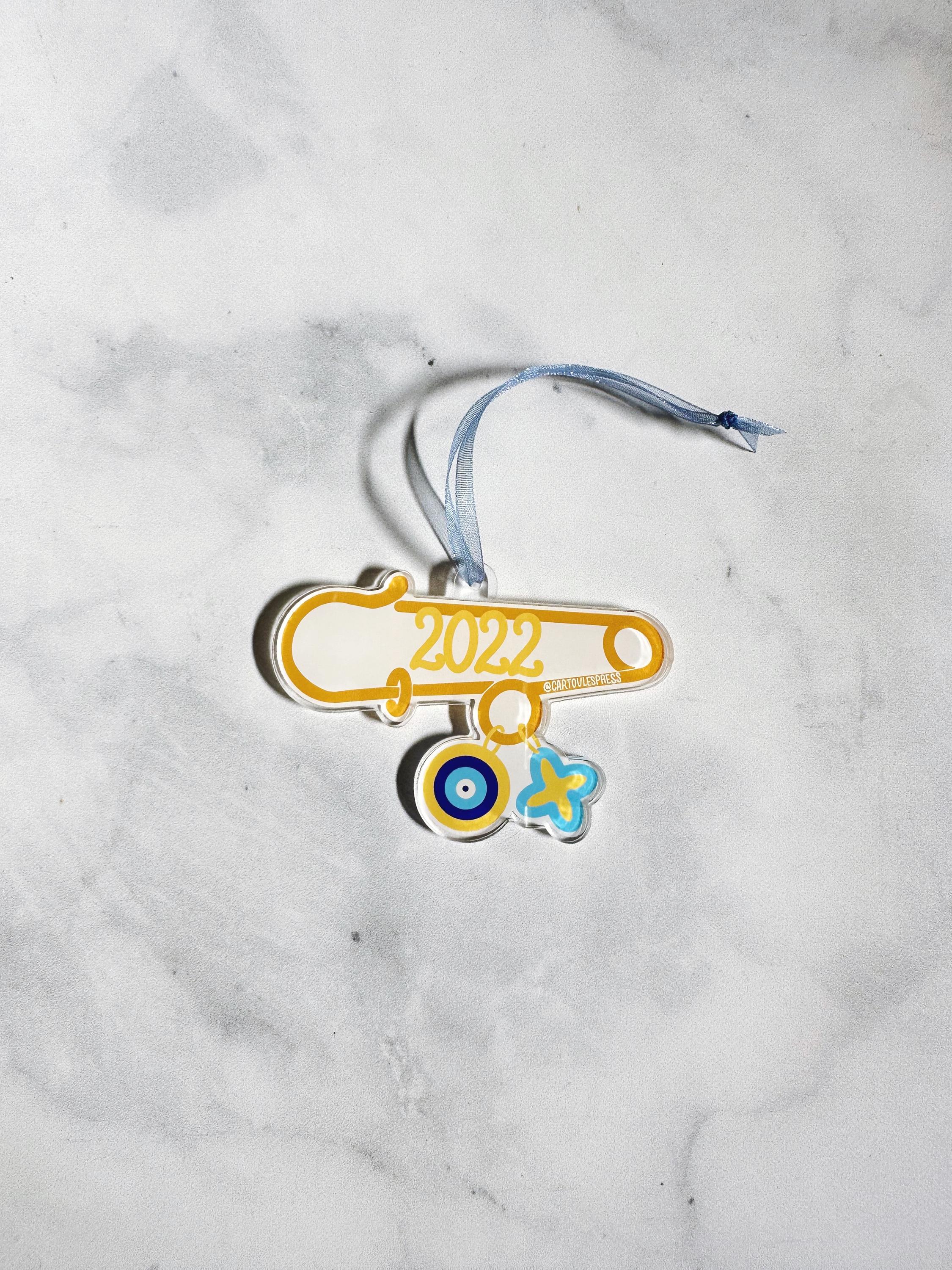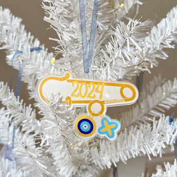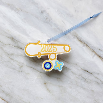 Commemorate the birth of a new baby with this "filaxto" acrylic ornament. In Greece, these "filaxto" religious charms are traditionally pinned to the clothes or crib of a baby to keep them safe by chasing away evil. Choose from 2022, 2023, 2024 or 2025