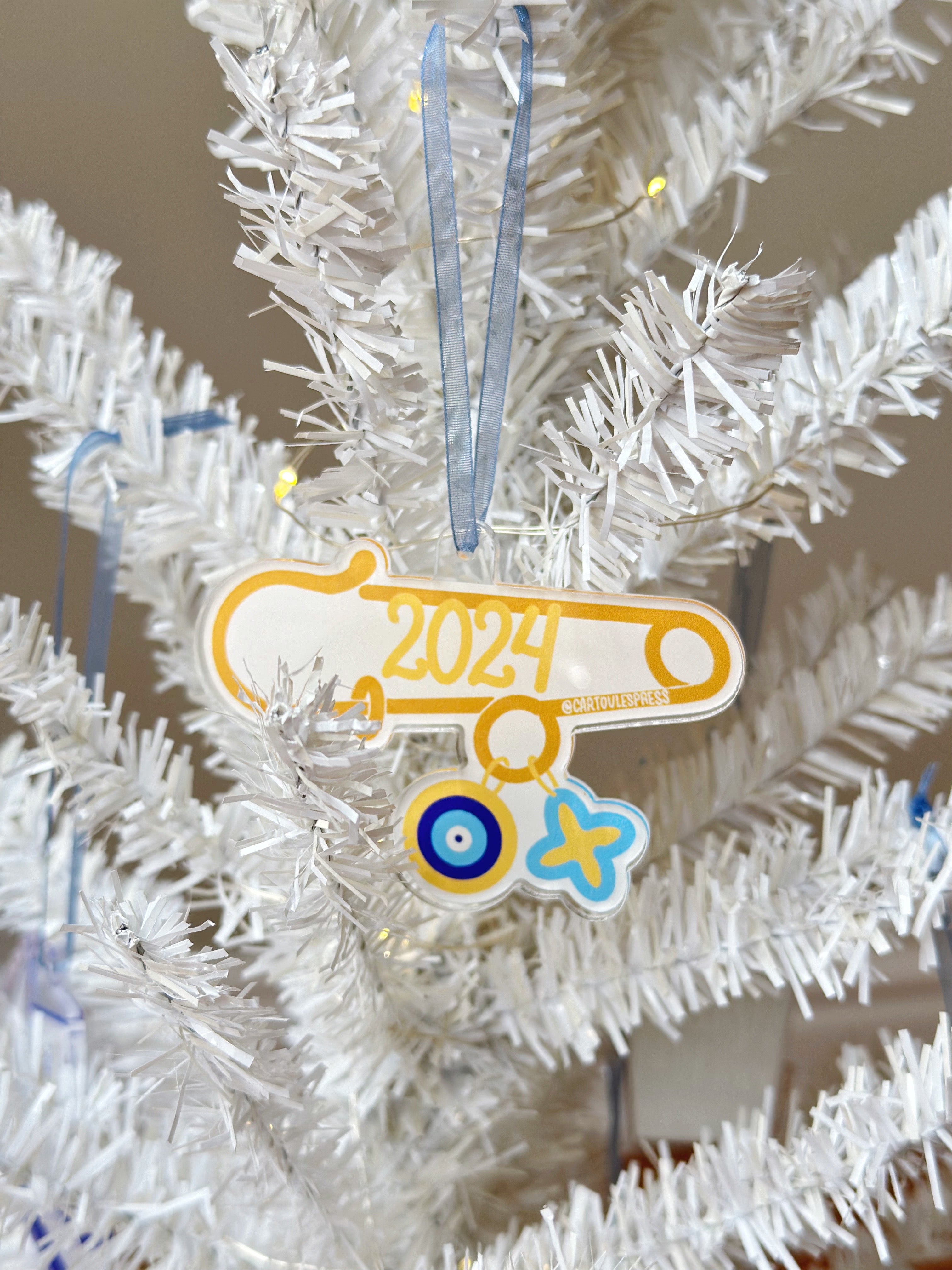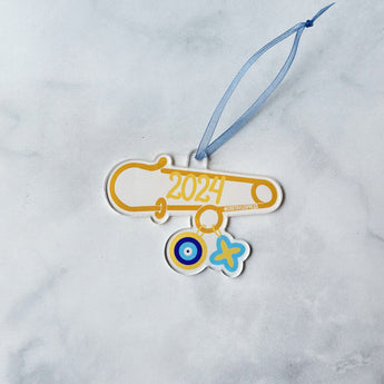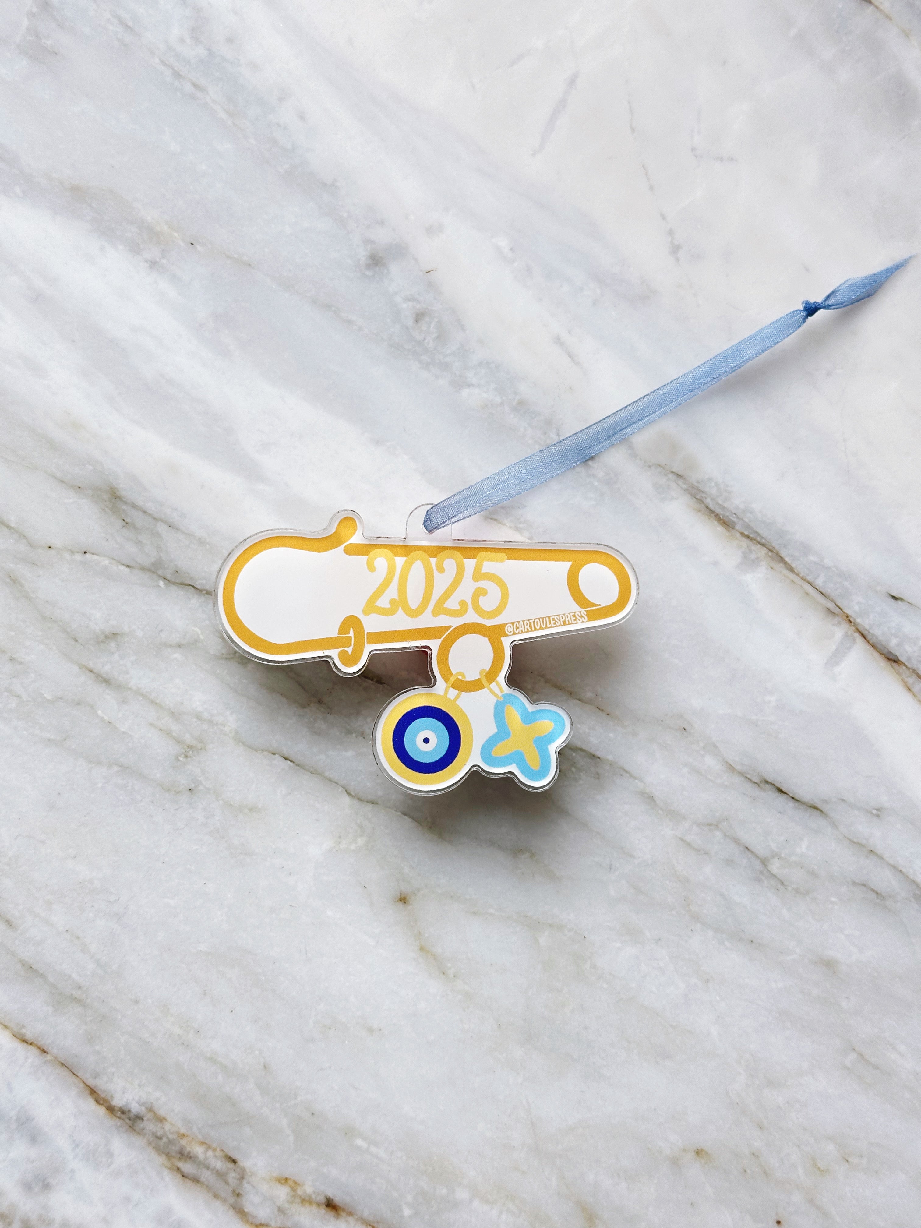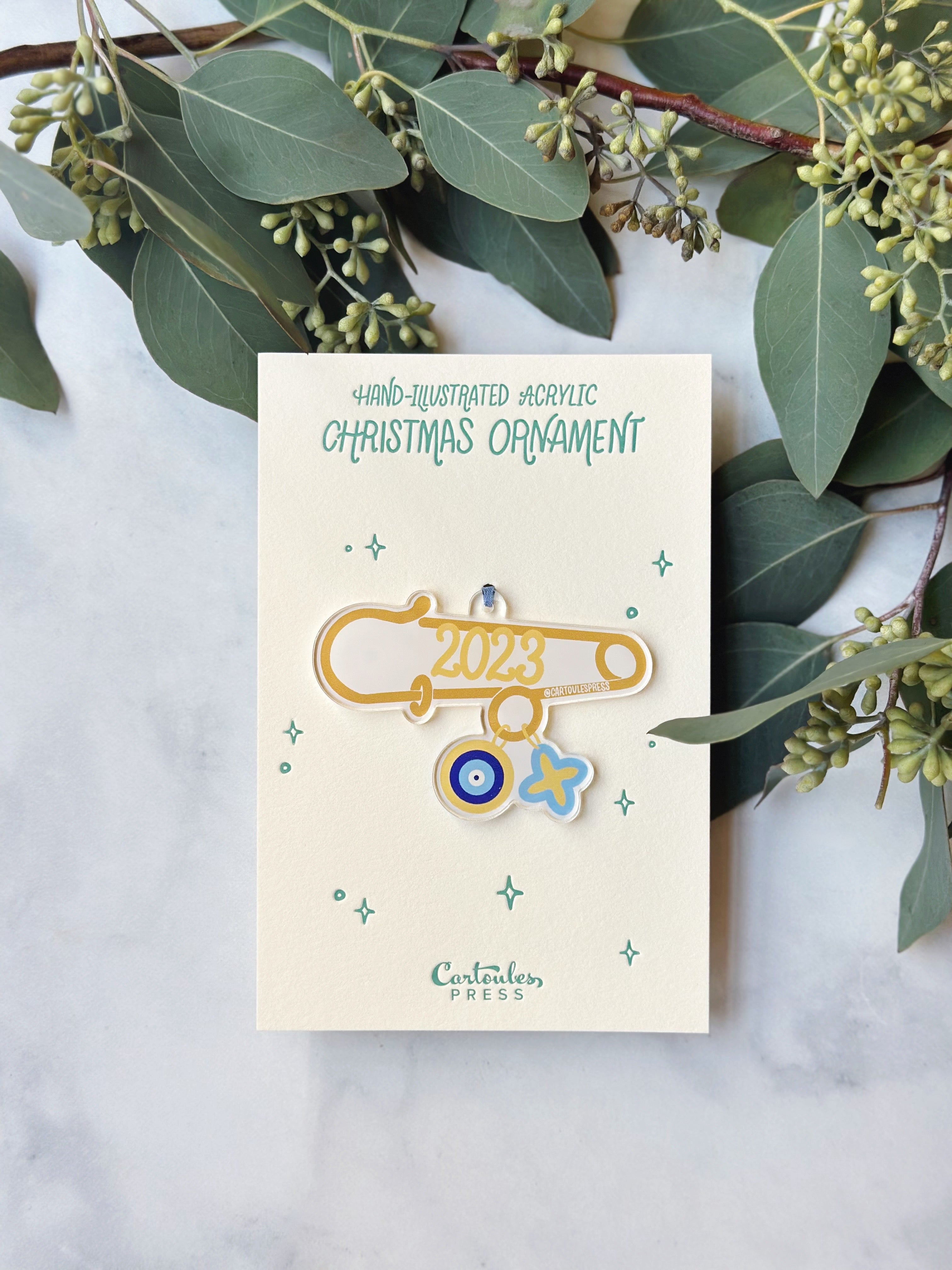 Commemorate the birth of a new baby with this "filaxto" acrylic ornament. In Greece, these "filaxto" religious charms are traditionally pinned to the clothes or crib of a baby to keep them safe by chasing away evil. Choose from 2022, 2023, 2024 or 2025