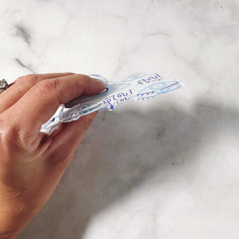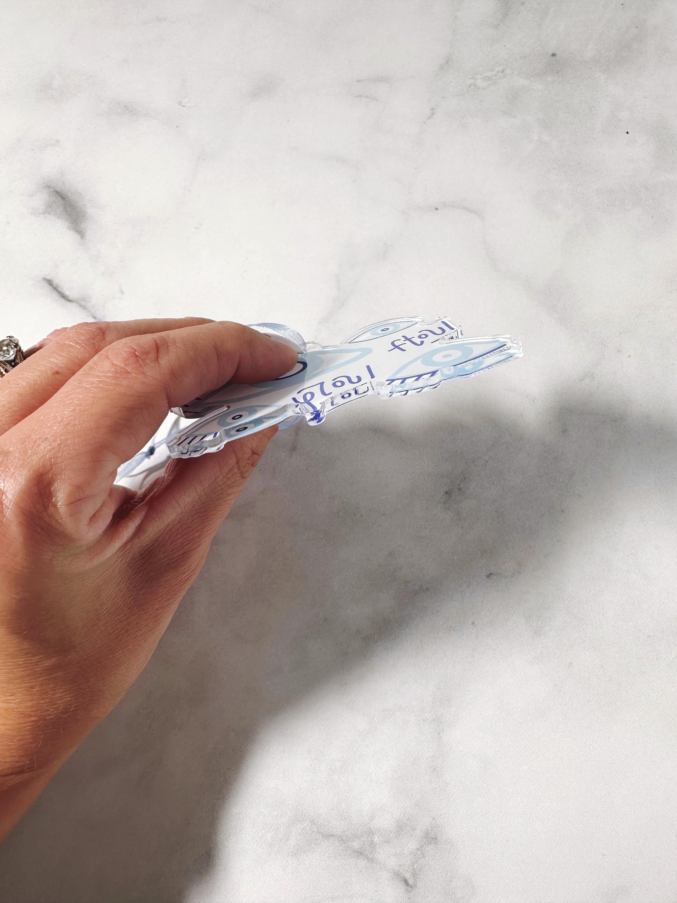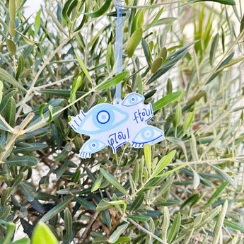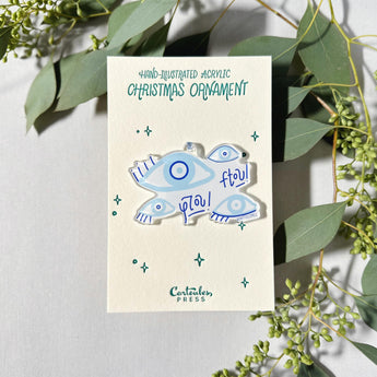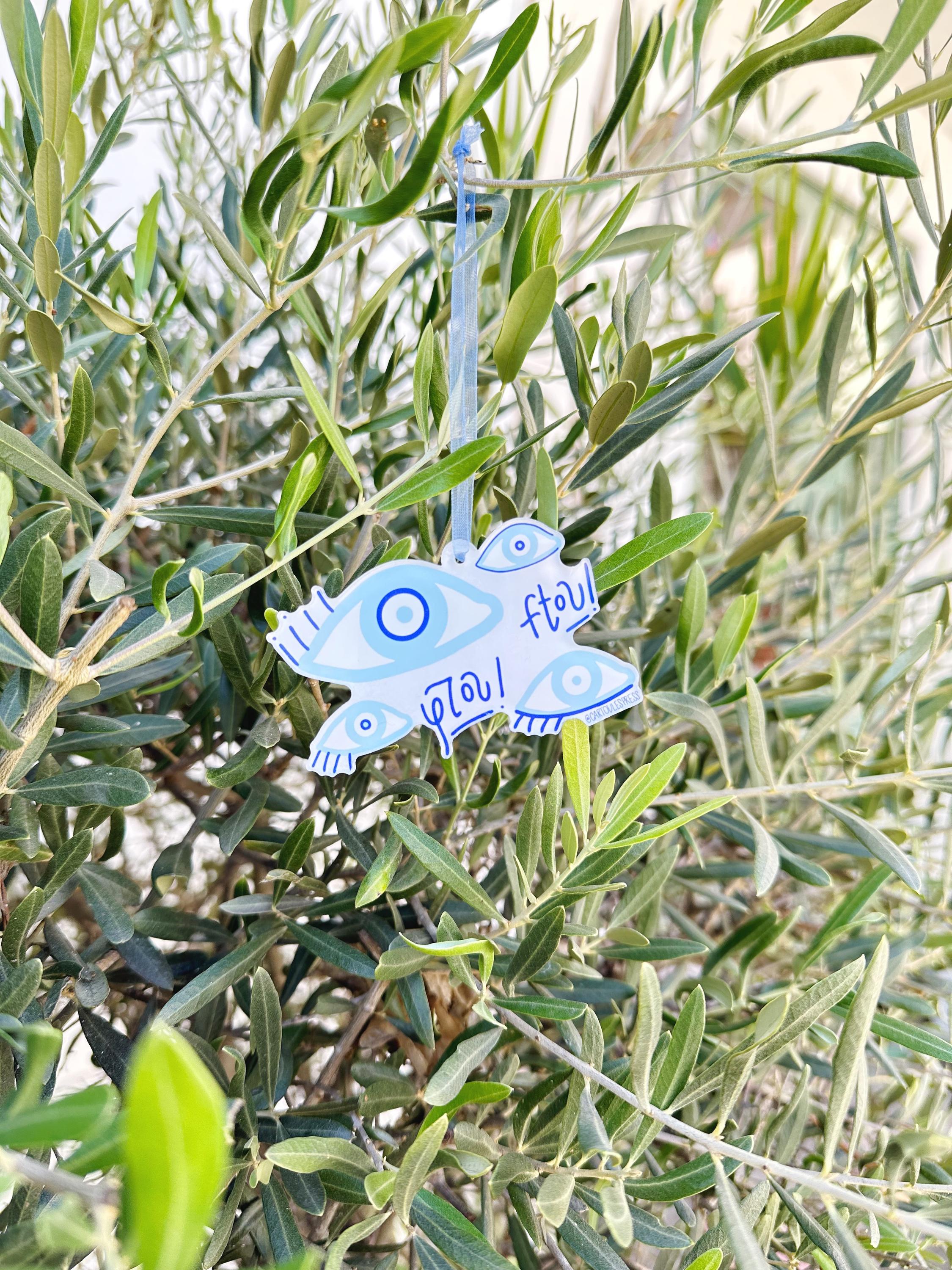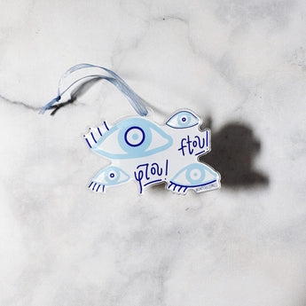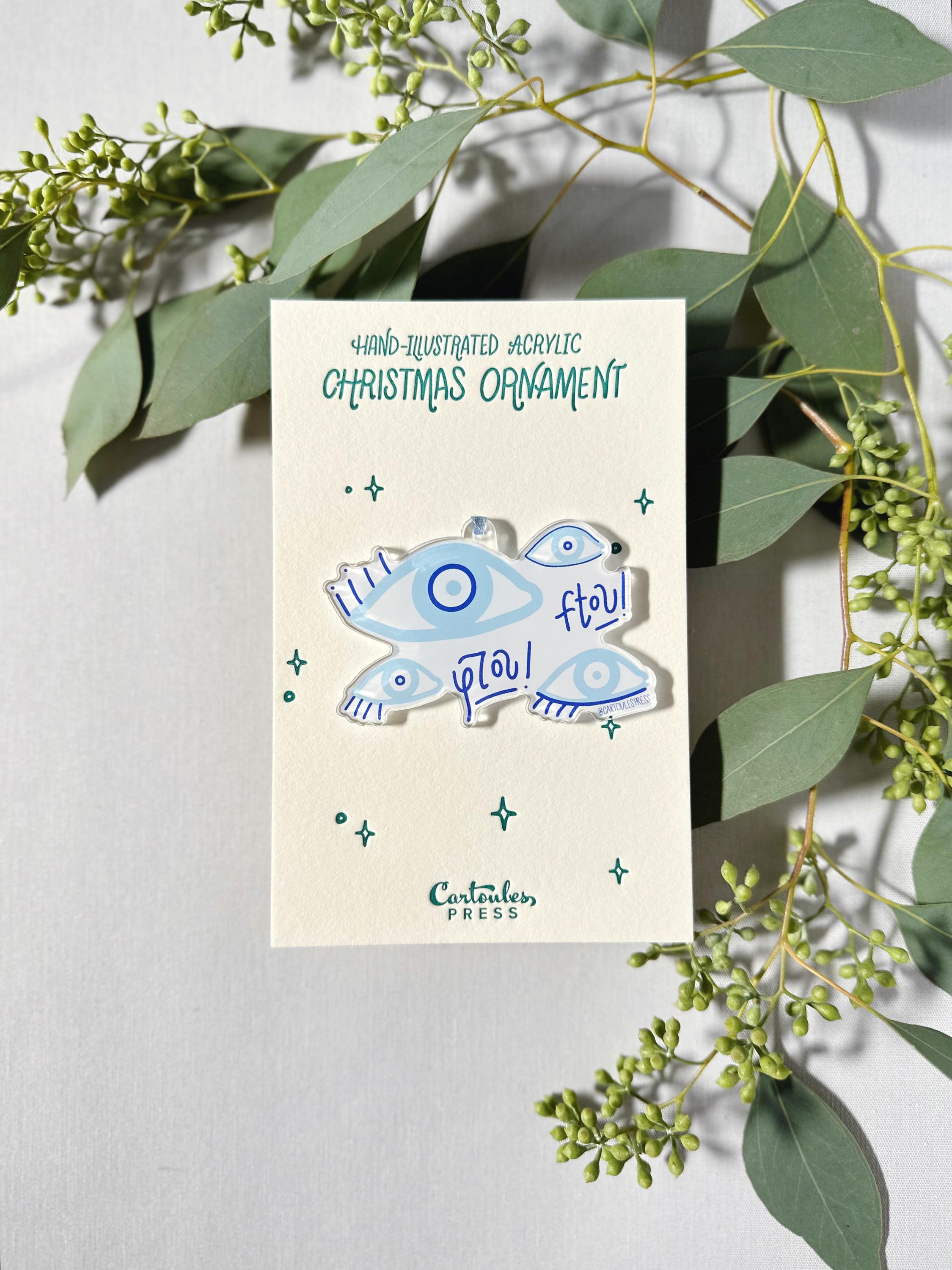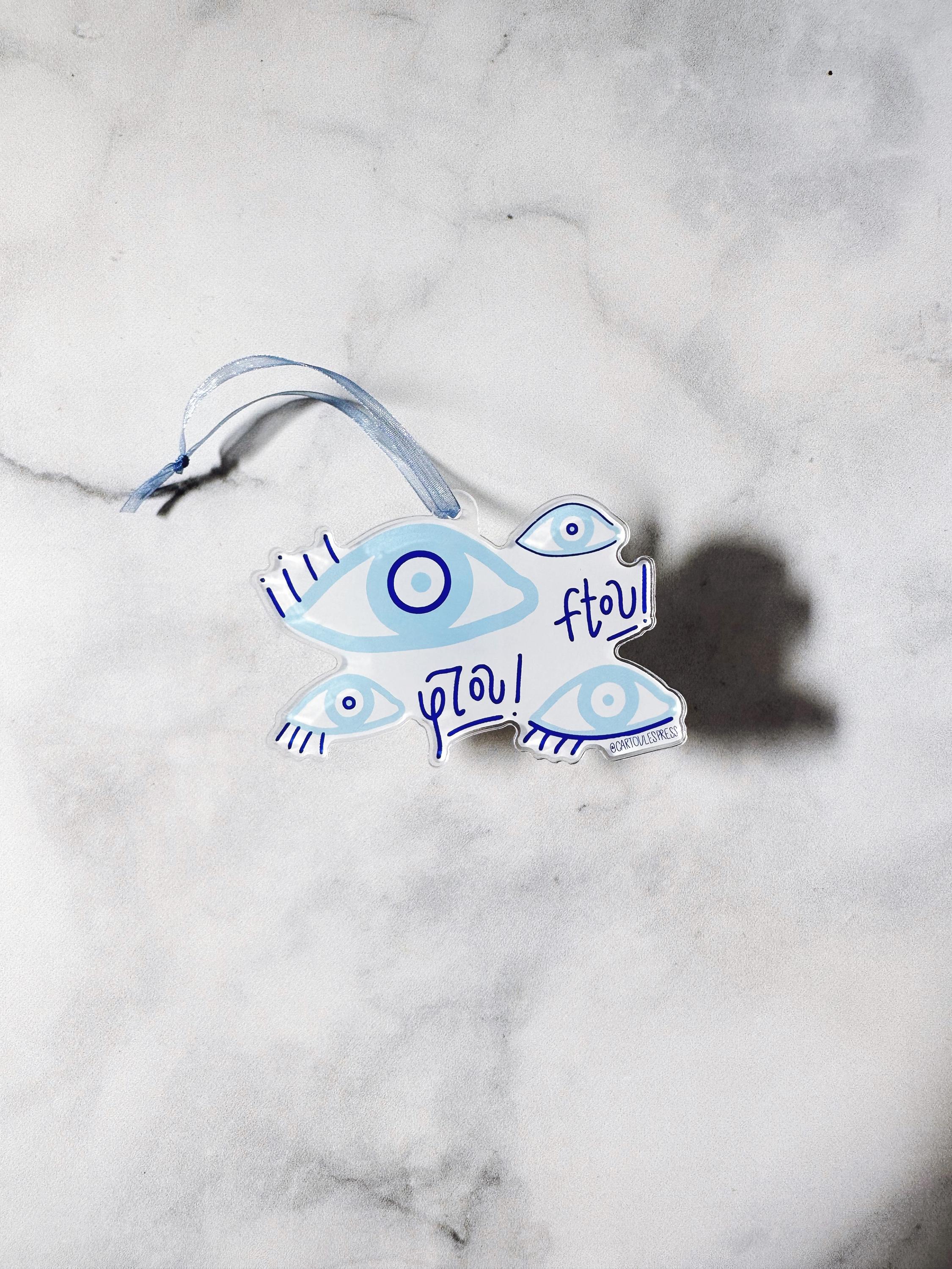 This acrylic ornament features hand-illustrated matakia, or evil eyes, to ward away misfortune. All elements are hand-lettered by Cartoules Press. The text reads "ftou!" - an onomatopoeic word. The sound of spitting is used by Greeks to ward off the evil eye. Send it to someone who needs good luck! 🧿