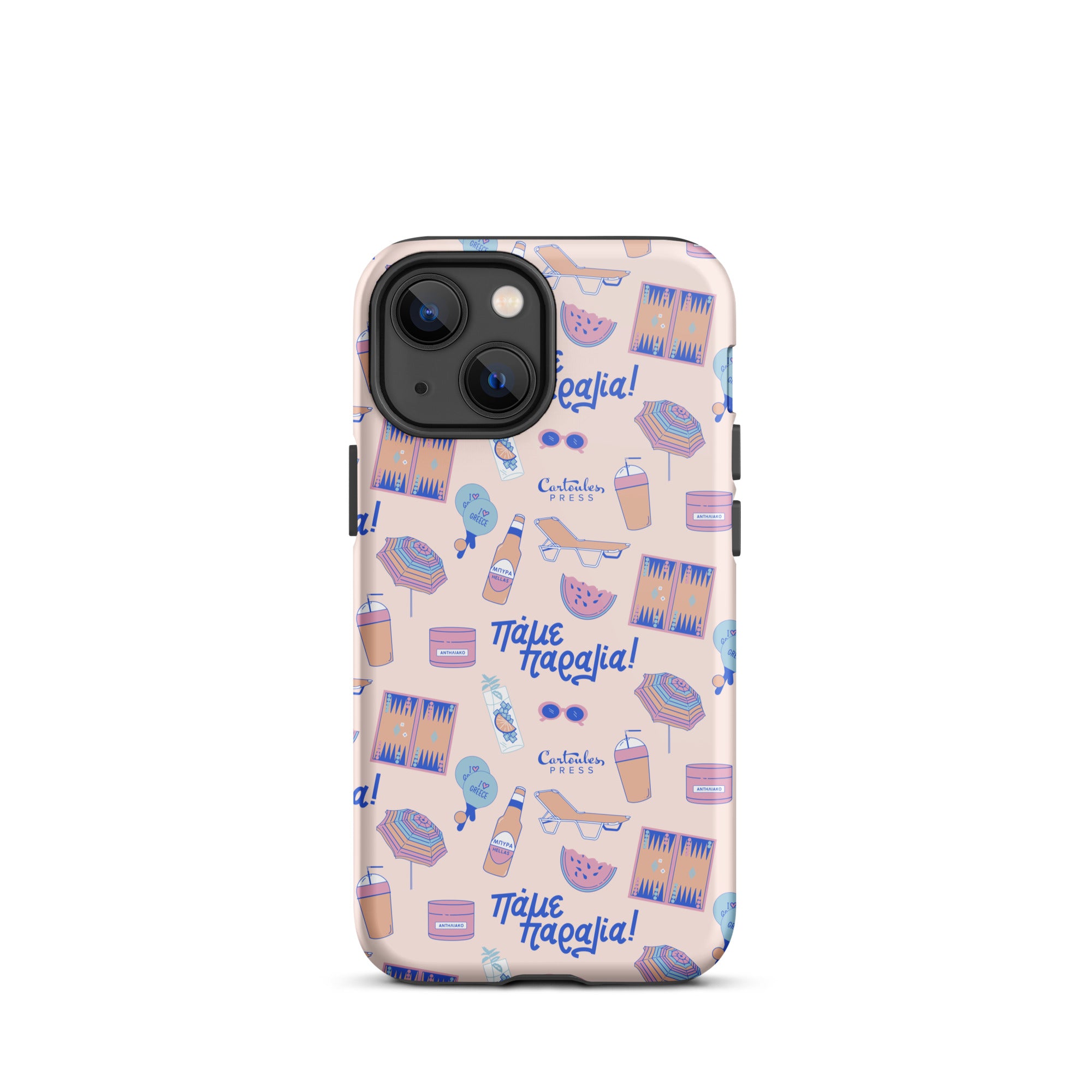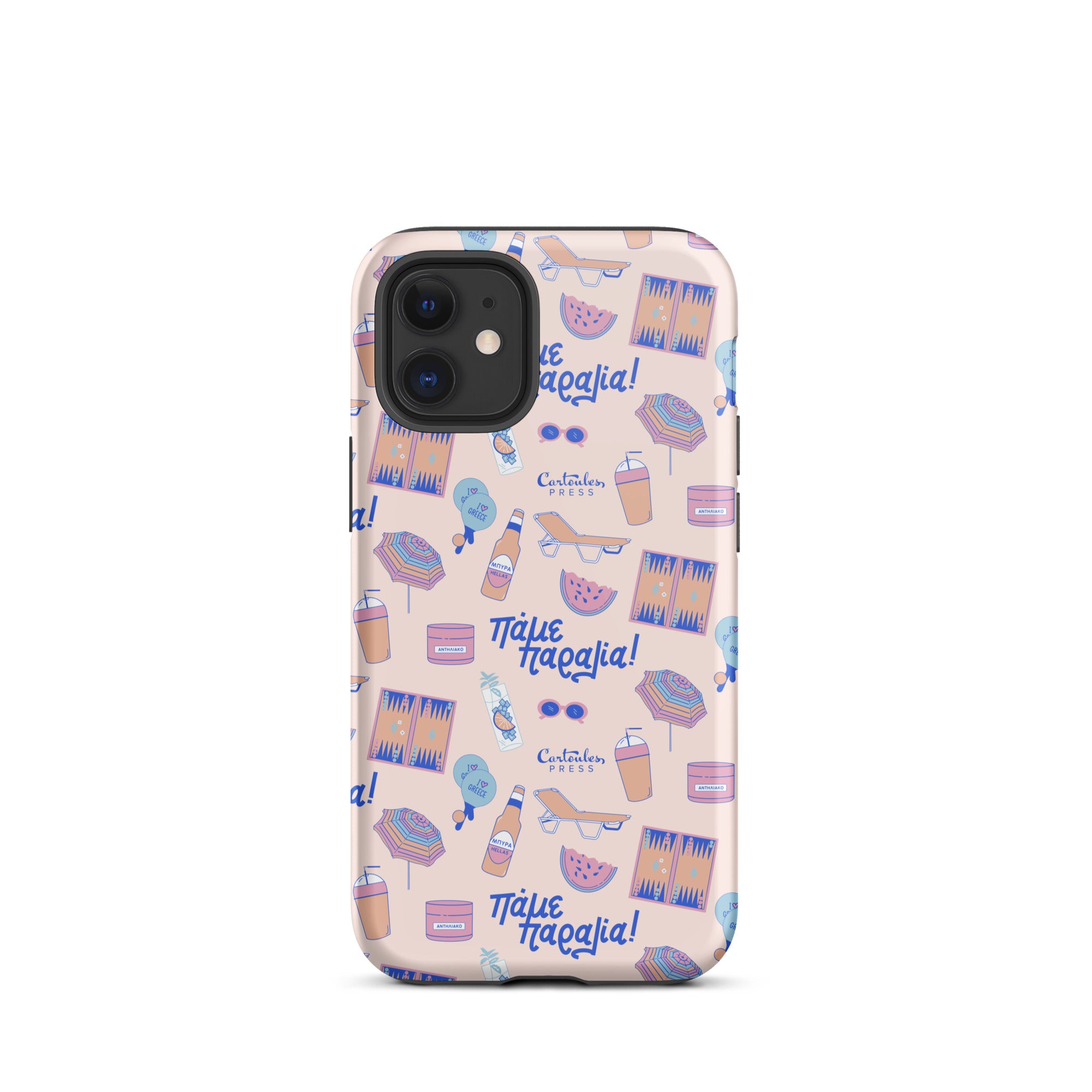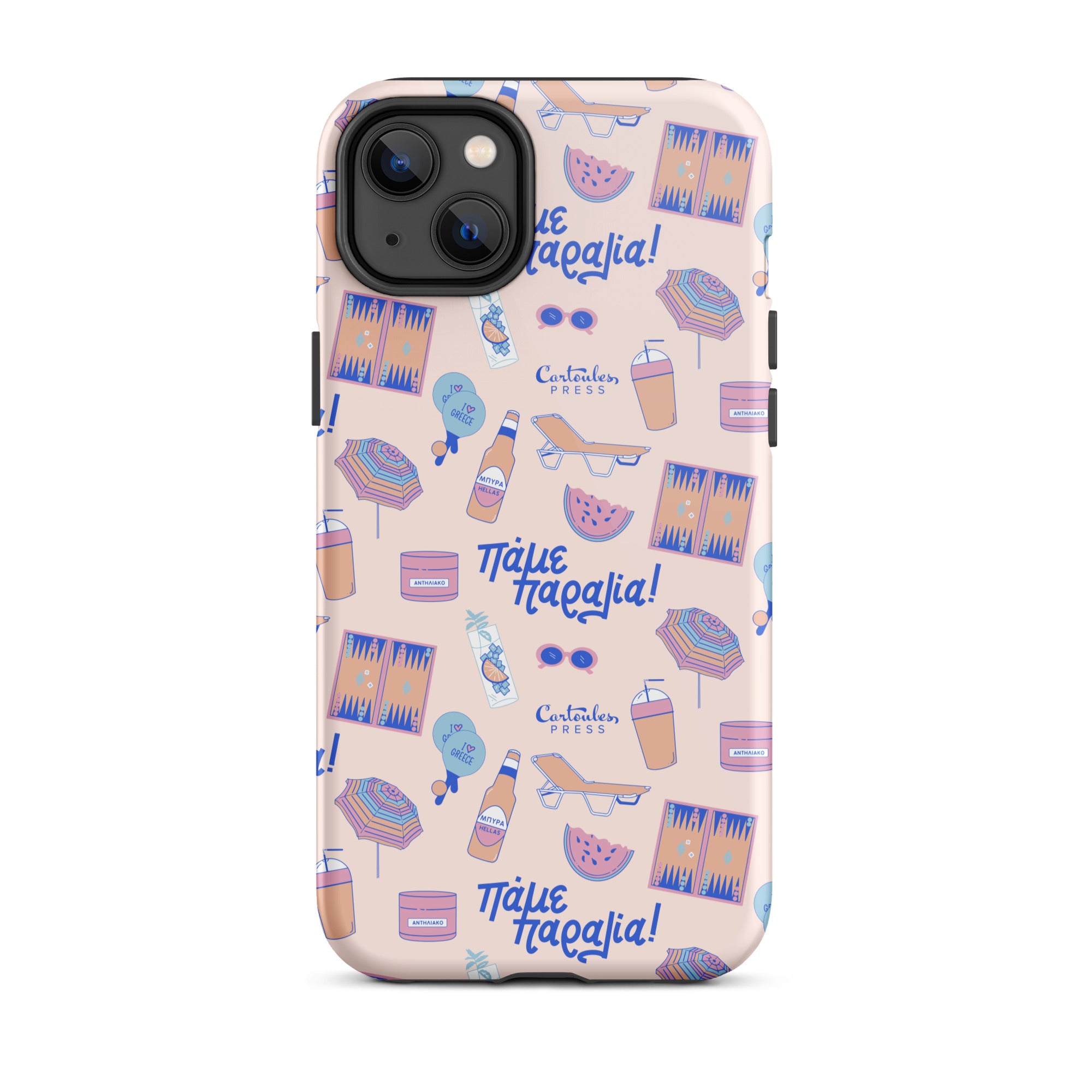 This phone case will remind you of summers in Greece on the beach featuring original illustrations by Cartoules Press. This repetitive pattern includes tavli board, frappe coffee, a beach cocktail, sunscreen, raketes, watermelon, beach chair and umbrella, and sunglasses.