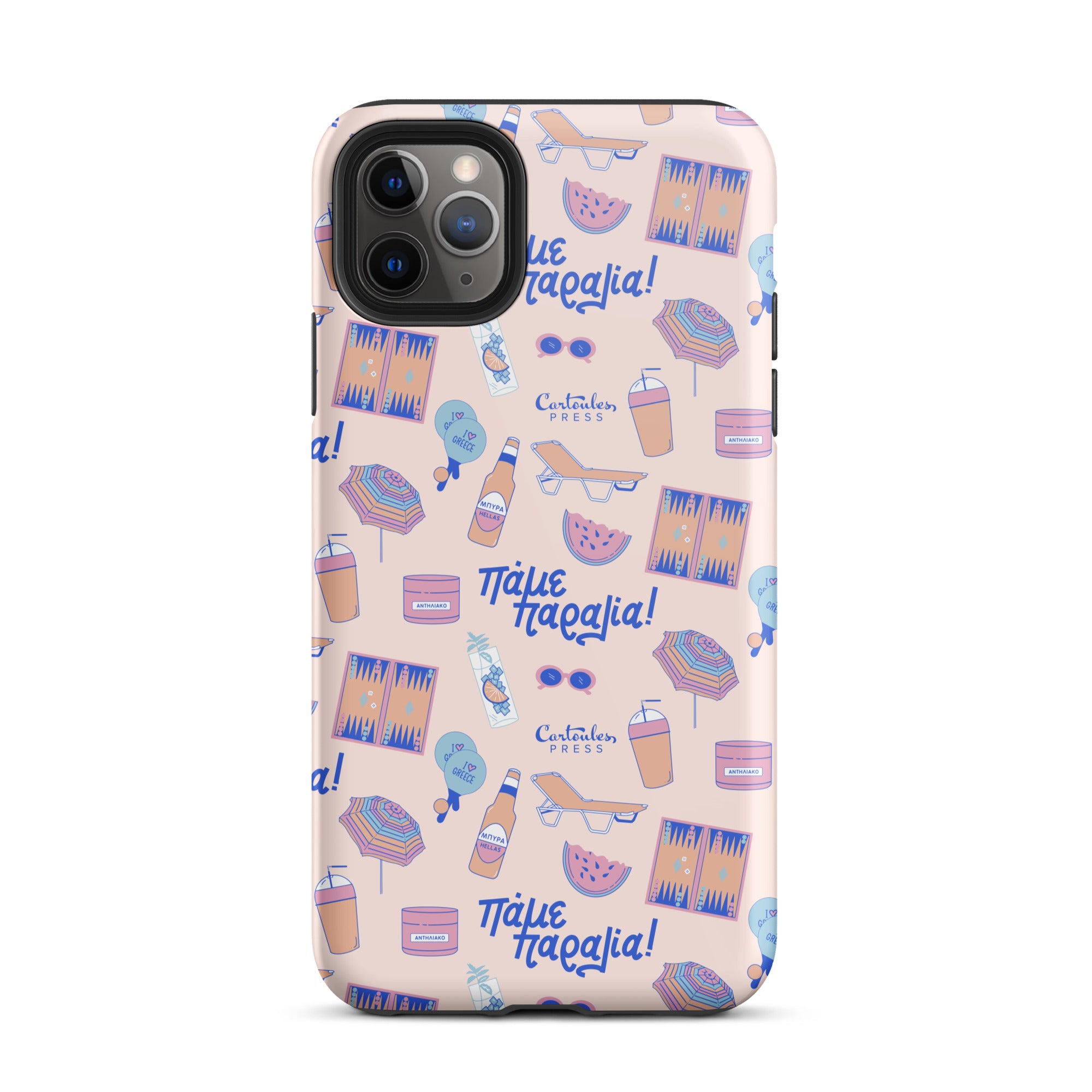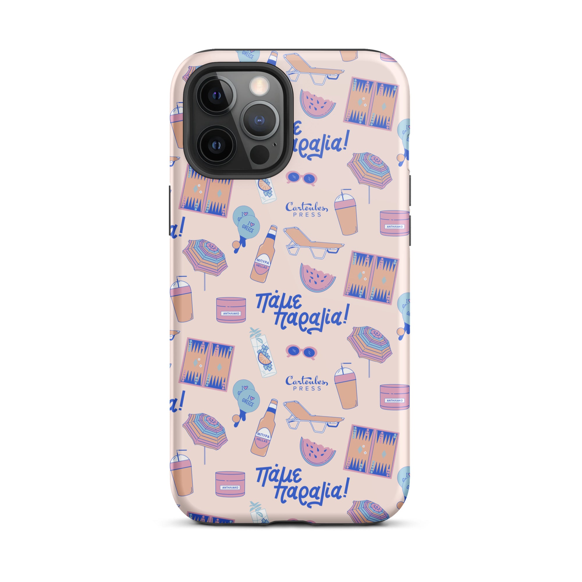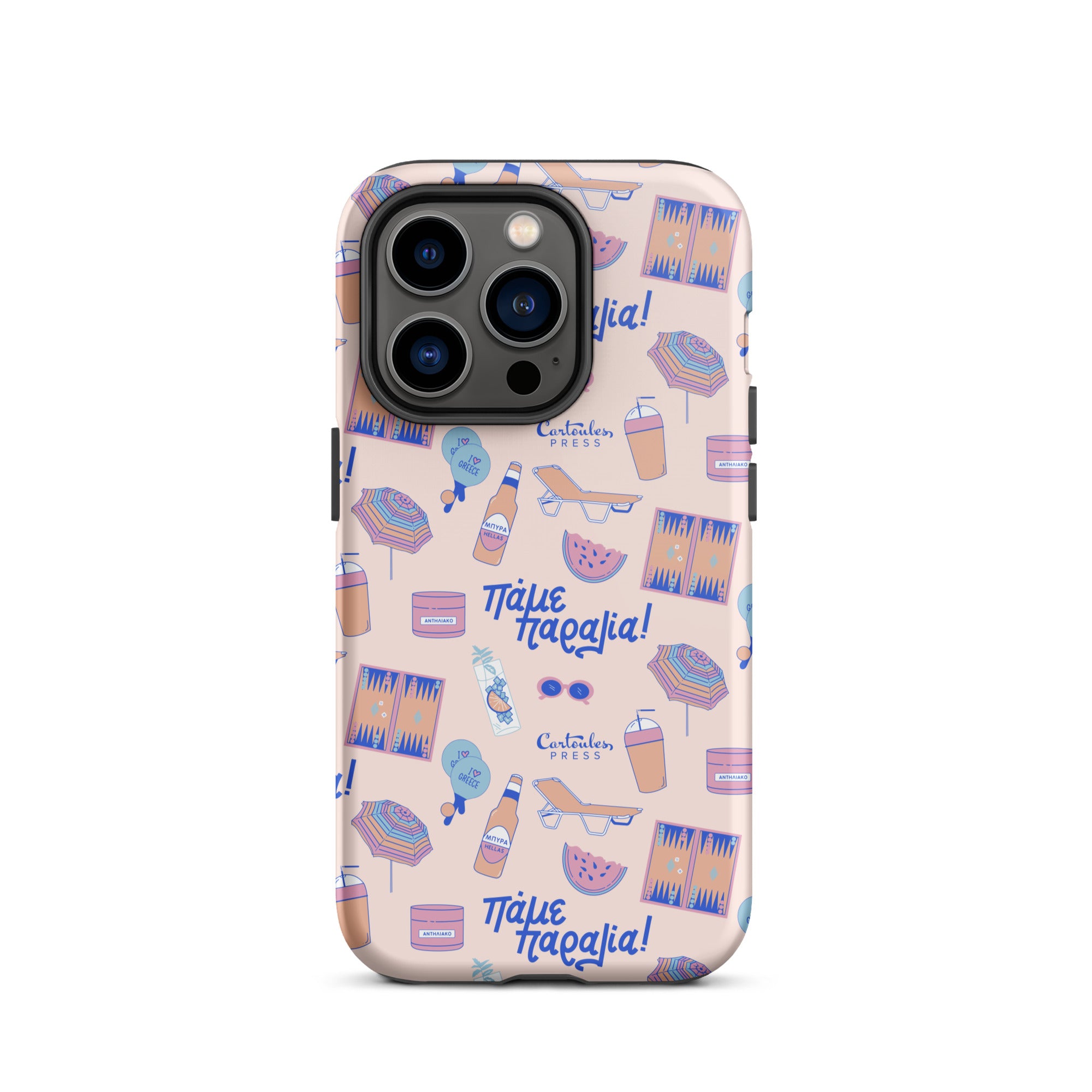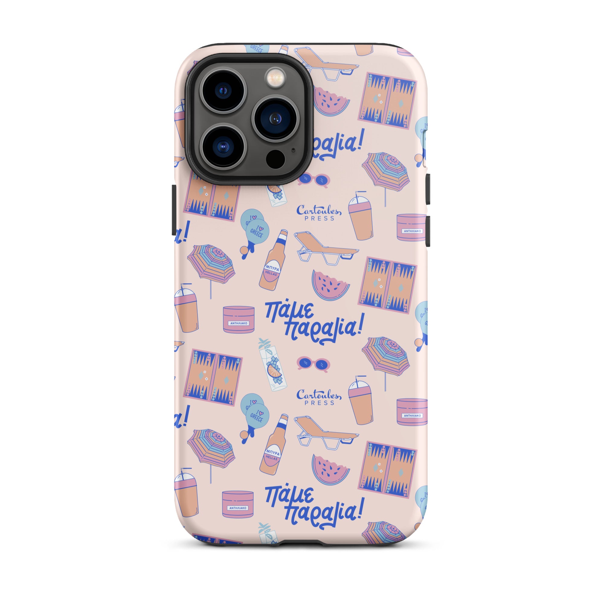 This phone case will remind you of summers in Greece on the beach featuring original illustrations by Cartoules Press. This repetitive pattern includes tavli board, frappe coffee, a beach cocktail, sunscreen, raketes, watermelon, beach chair and umbrella, and sunglasses.