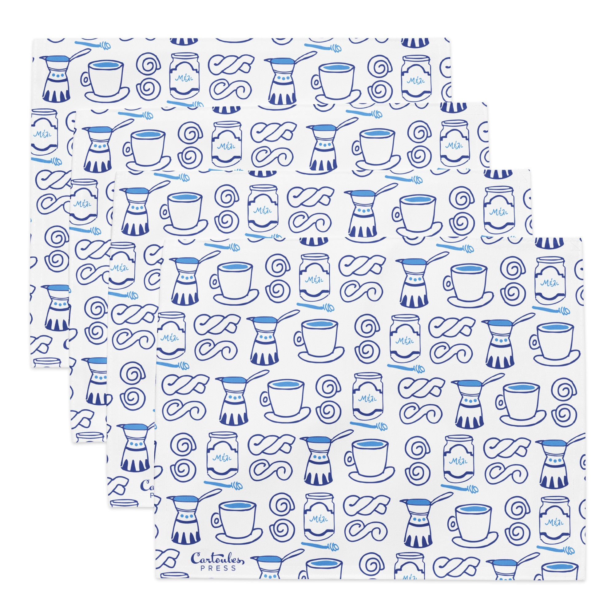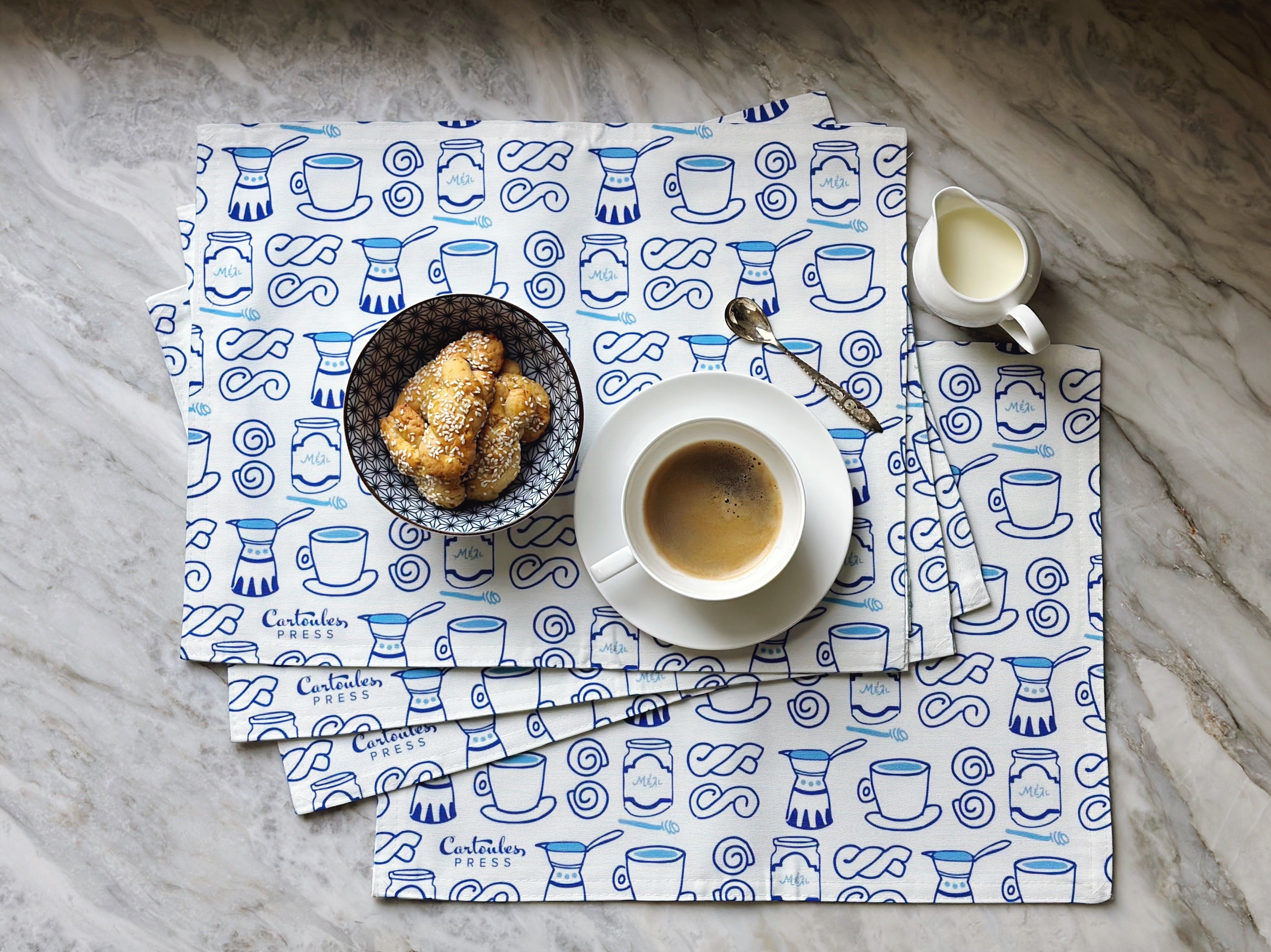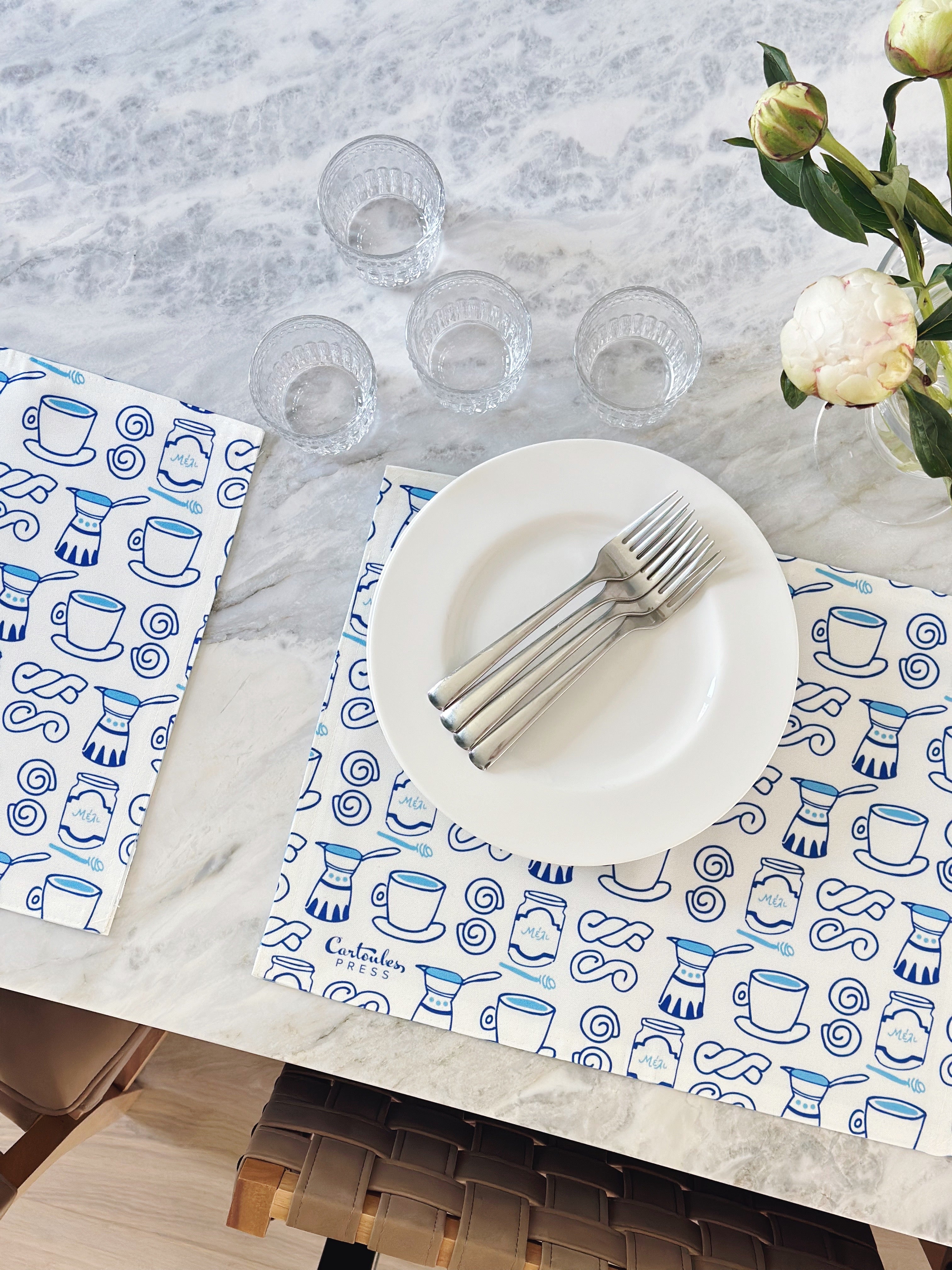 Elevate your tablescape with our Greece-inspired placemat set featuring your favorite Cartoules Press designs! Every set comes with 4 high-quality, water-resistant placemats.