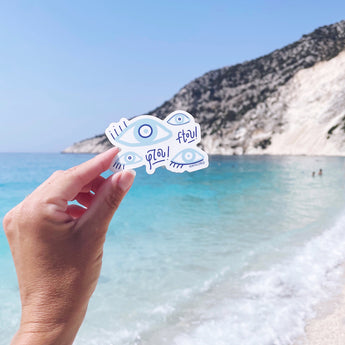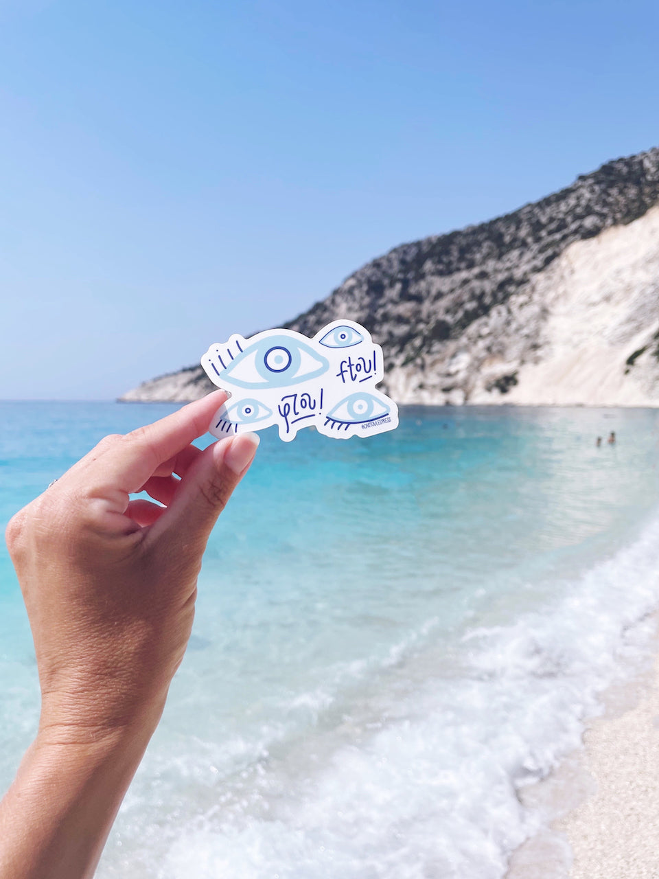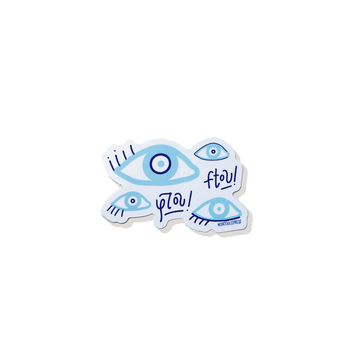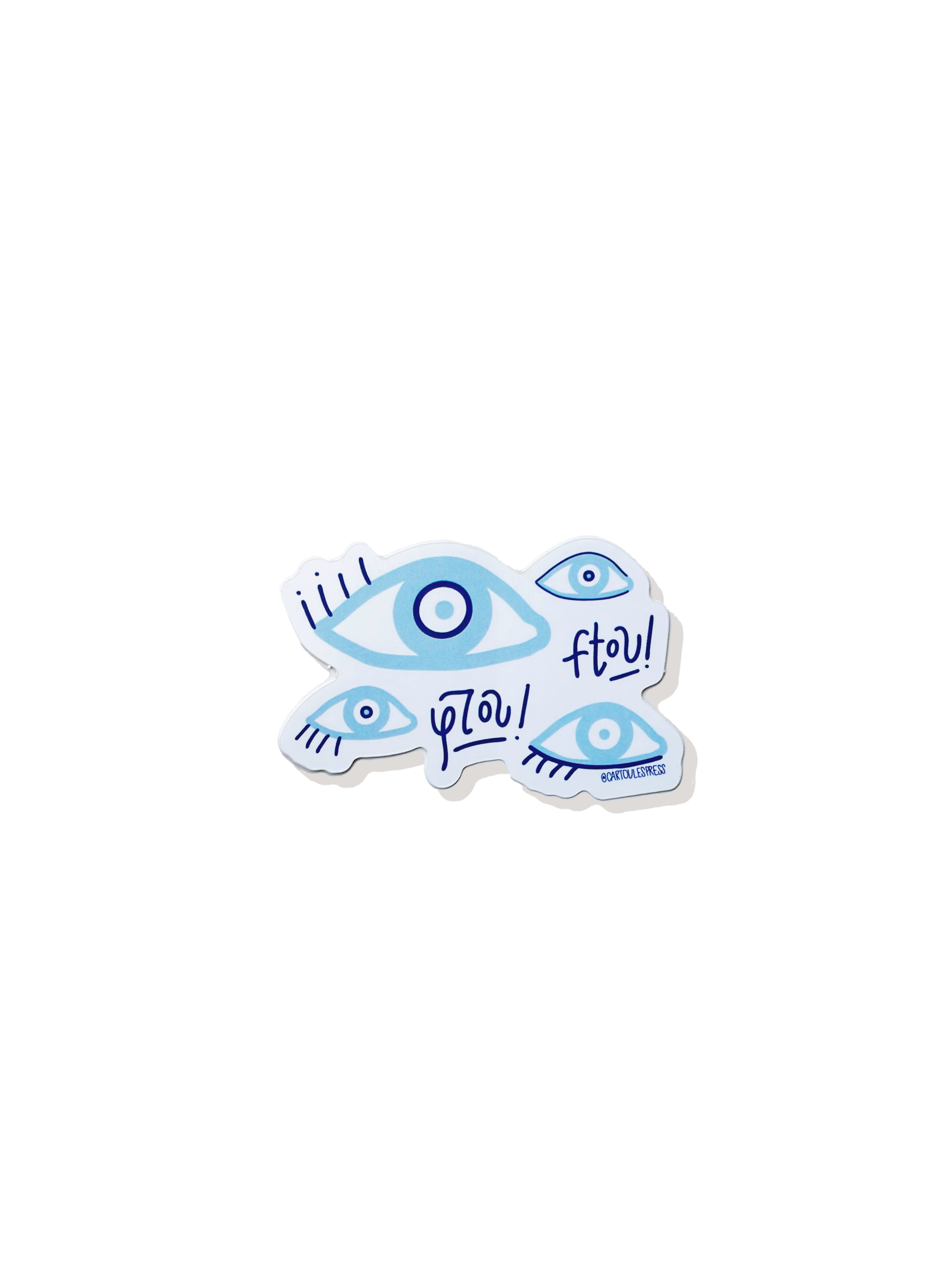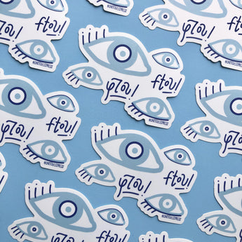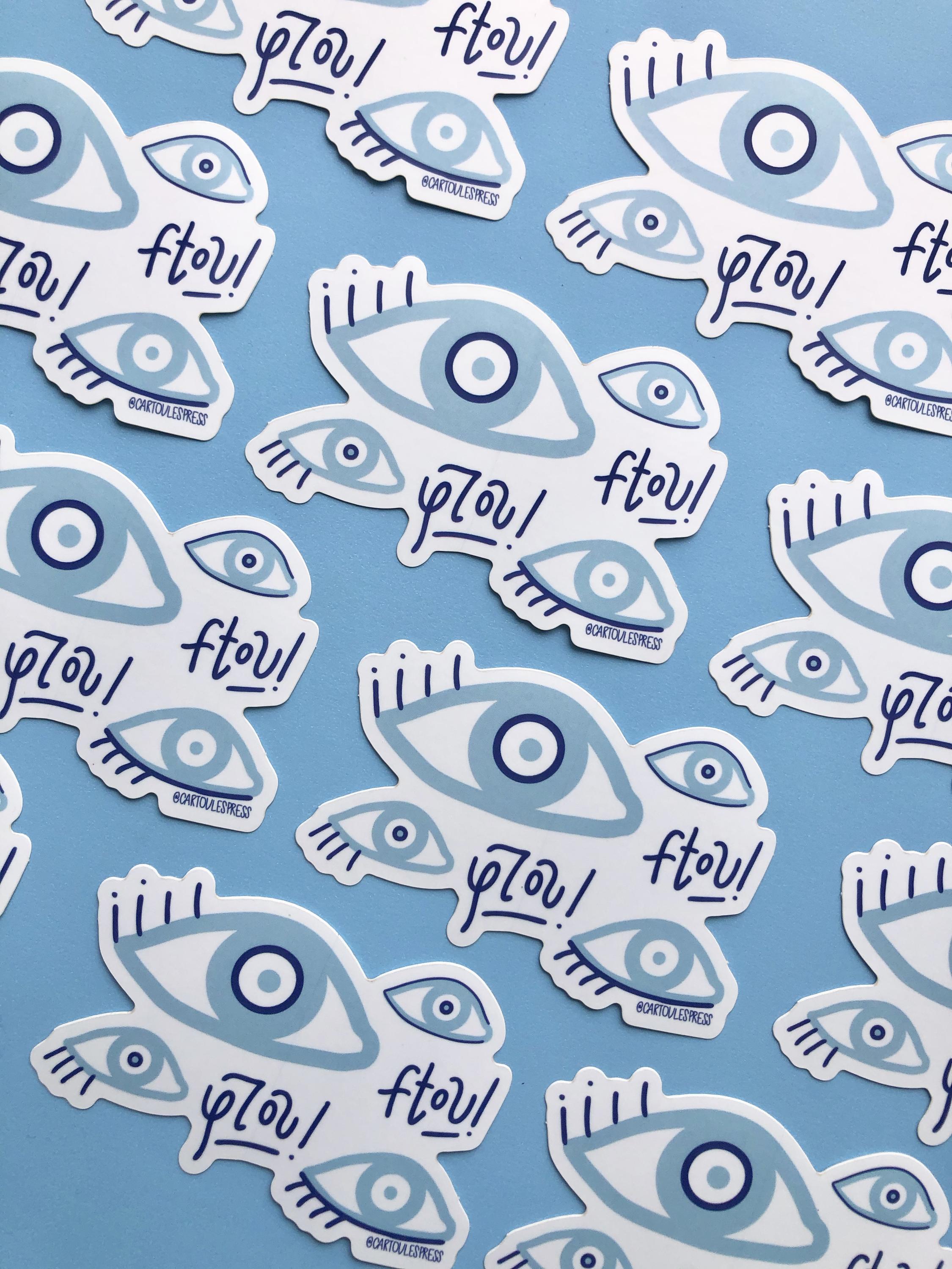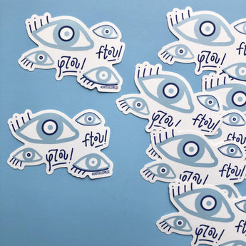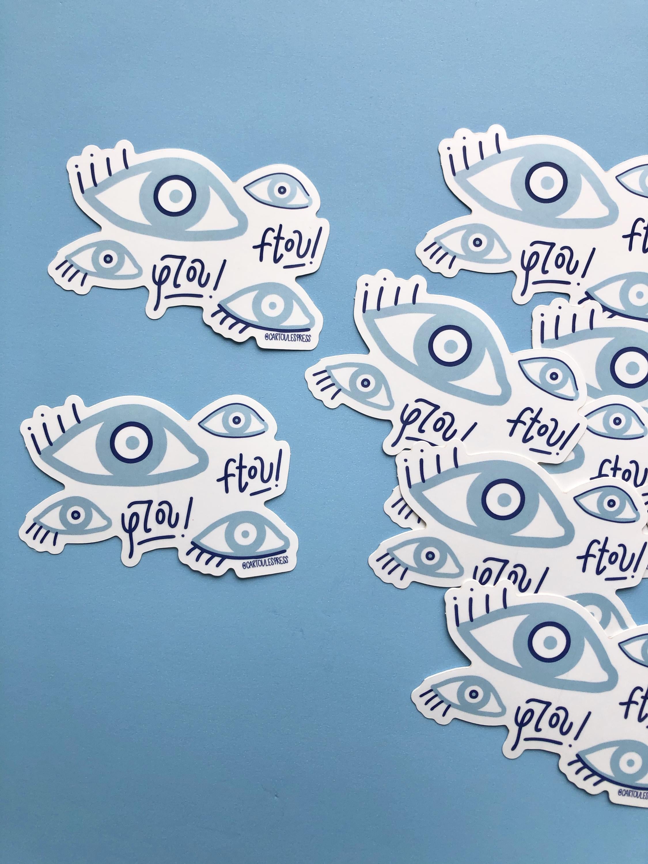 This sticker features hand-illustrated matakia, or evil eyes, to ward away misfortune. All elements are hand-lettered by Cartoules Press. The text reads "ftou!" - an onomatopoeic word. The sound of spitting is used by Greeks to ward off the evil eye. Send it to someone who needs good luck! 🧿
