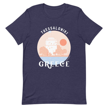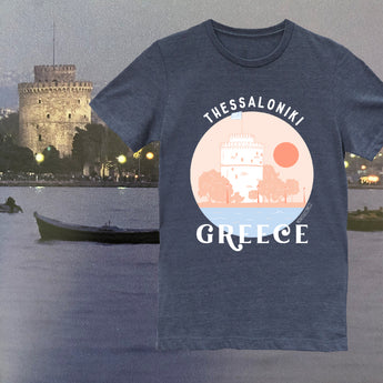 This unisex tee features an illustration of the White Tower in Thessaloniki, Greece, and the surrounding landscape. It's the perfect souvenir tee to take home, even if you aren't able to make it to Greece.