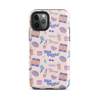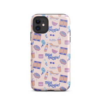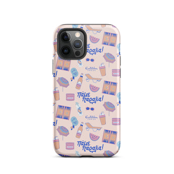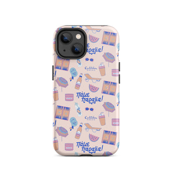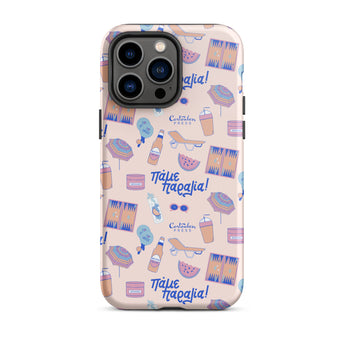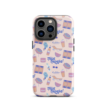 This phone case will remind you of summers in Greece on the beach featuring original illustrations by Cartoules Press. This repetitive pattern includes tavli board, frappe coffee, a beach cocktail, sunscreen, raketes, watermelon, beach chair and umbrella, and sunglasses.